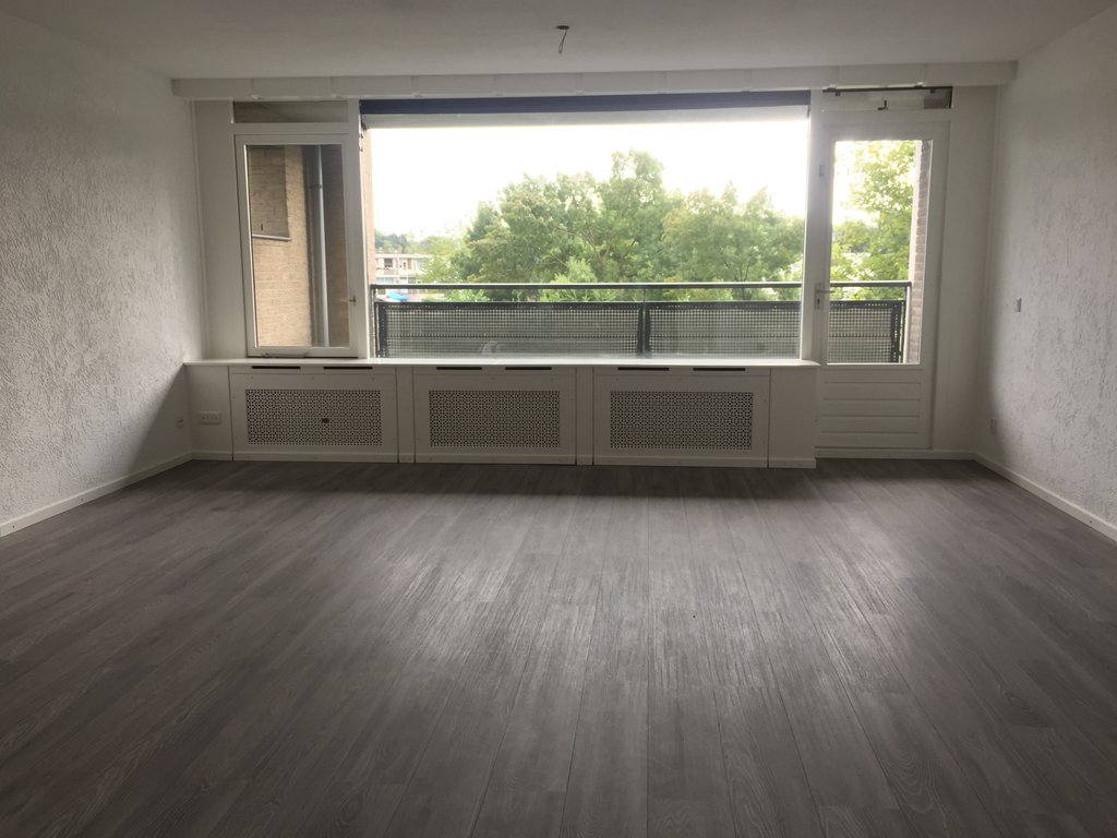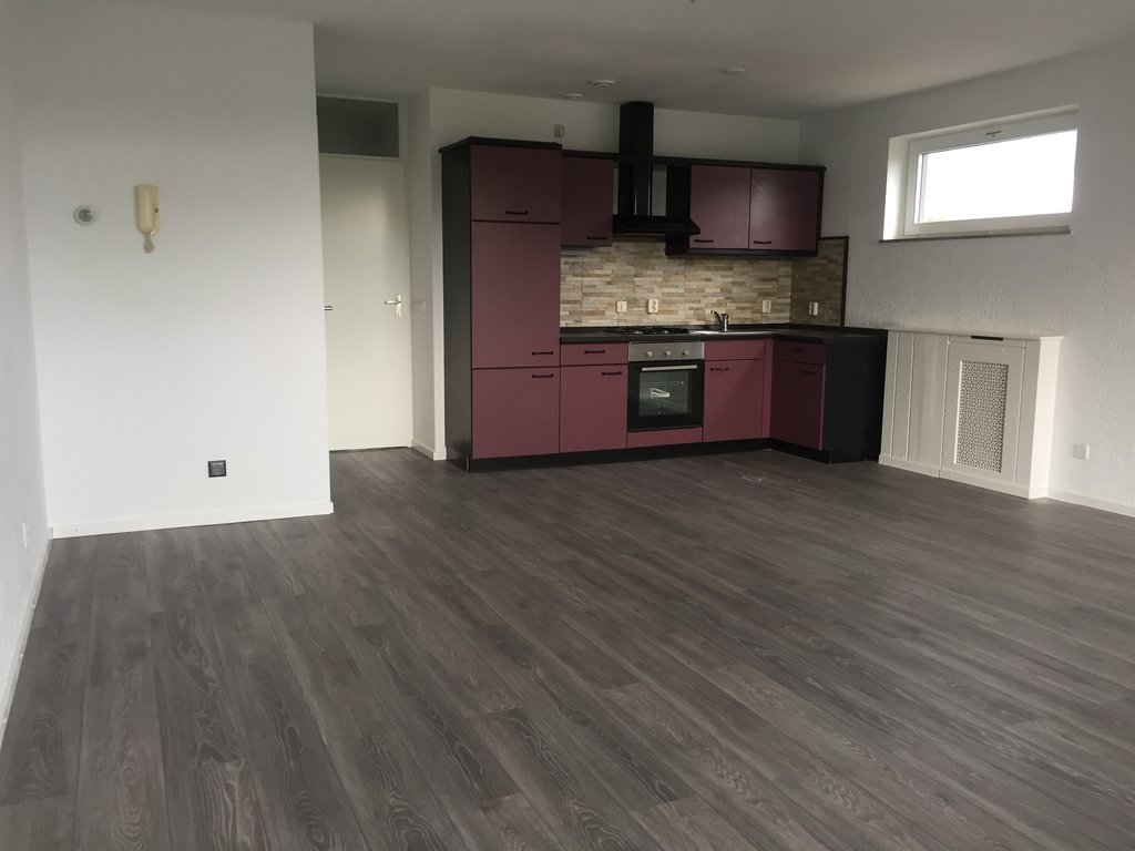 De woonkamer met aansluitend de keuken is ca. 35 m² en geeft tevens toegang tot het balkon aan de achterzijde. De keuken is voorzien van diverse inbouwapparaten zoals een koelkast, 4-pits gasfornuis, oven en wasemkap.
