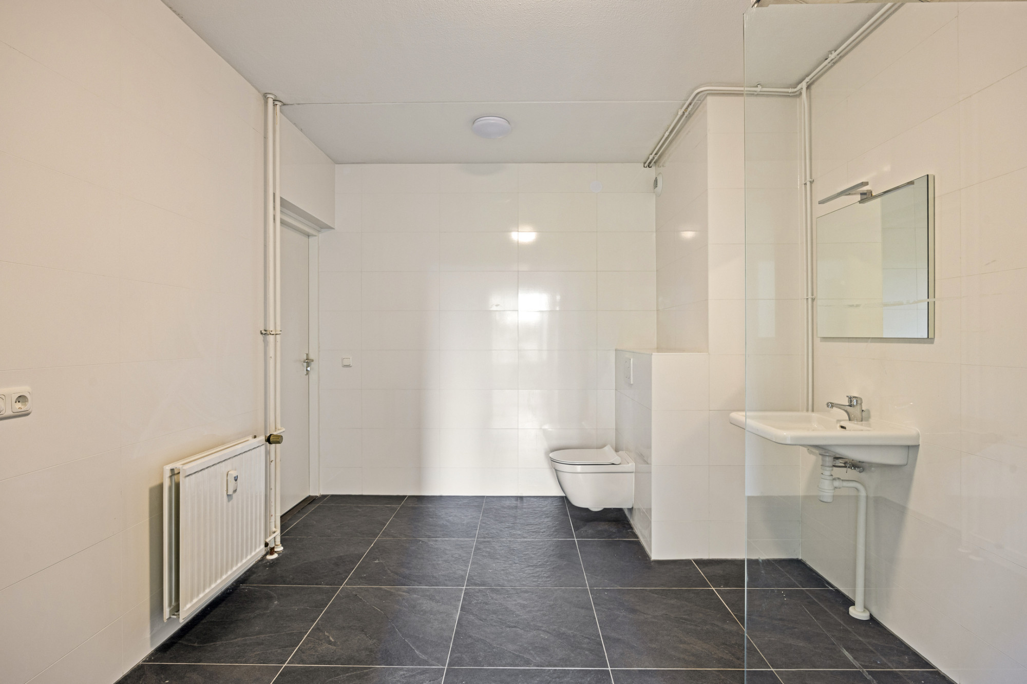 Geheel betegelde modern afgewerkte badkamer (3.60 x 2.98 m) met ruime inloopdouche en brede vaste wastafel en hangtoilet. De badkamer is zowel vanuit de entree als vanuit de slaapkamer bereikbaar.