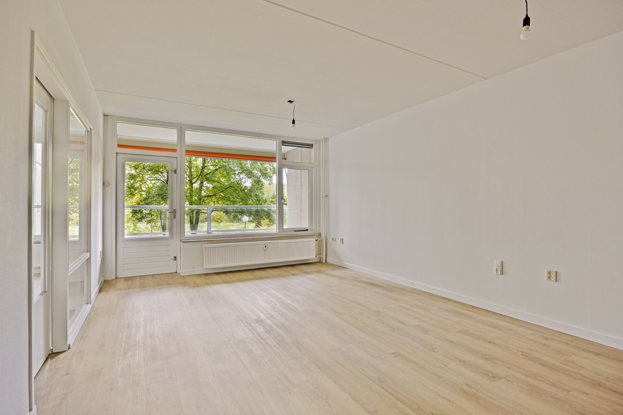Woonkamer (8.28 x 3.77 m) met toegang naar de open keuken en voorzien van keurige pvc-vloer. Tevens toegang naar het balkon (3.87 x 1.76 m).