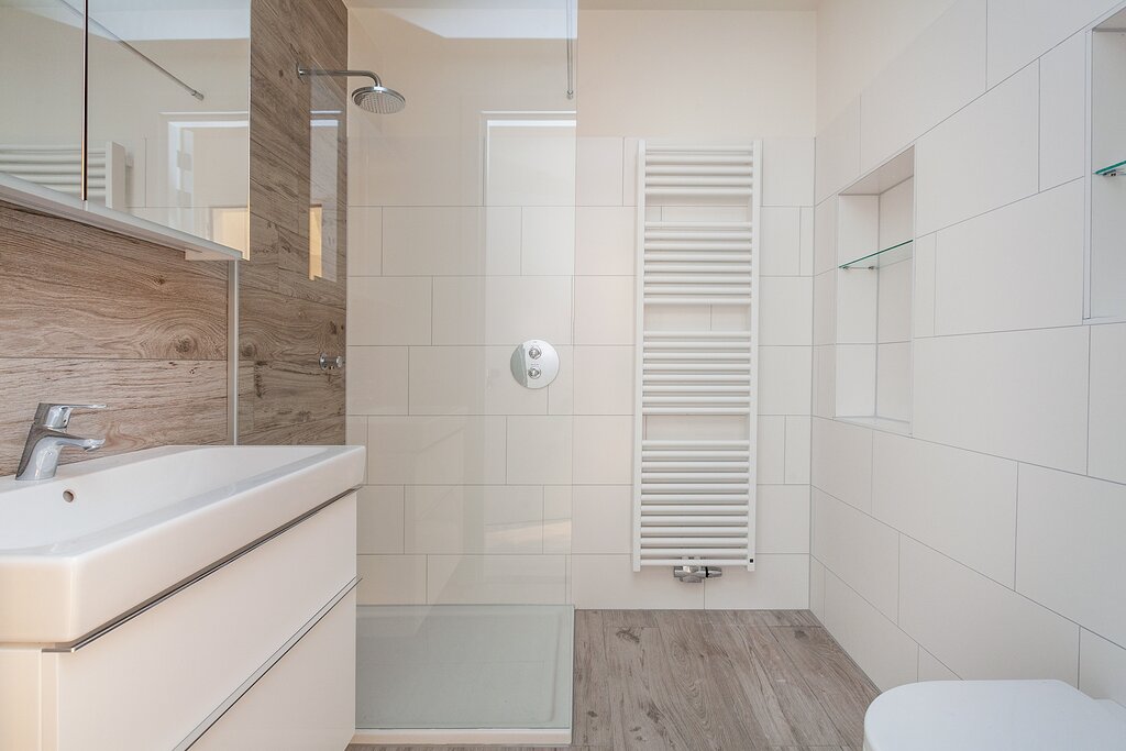 - Luxe badkamer (ca. 5 m²) voorzien van inloopdouche, toilet en wastafel.