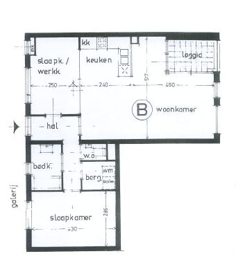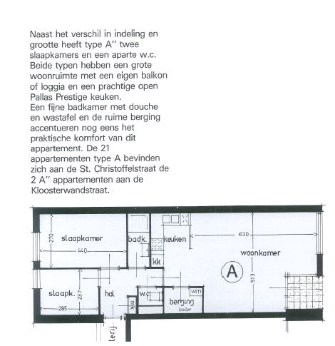 Entree/hal met toegang naar de woonkamer en slaapkamer 1. Het appartement is voorzien van een ruime woonkamer met tevens toegang tot de loggia. De keuken is gesitueerd in hoekopstelling en voorzien van een oven, 4 pits fornuis en afzuigkap. Vanuit een 2de hal welke eveneens bereikbaar is vanuit de woonkamer zijn de overige vertrekken bereikbaar. De badkamer voorzien van een ligbad, wastafel en de aansluiting voor de wasmachine. Separaat toilet. Berging met warm water boiler en de ruime slaapkamer 2.