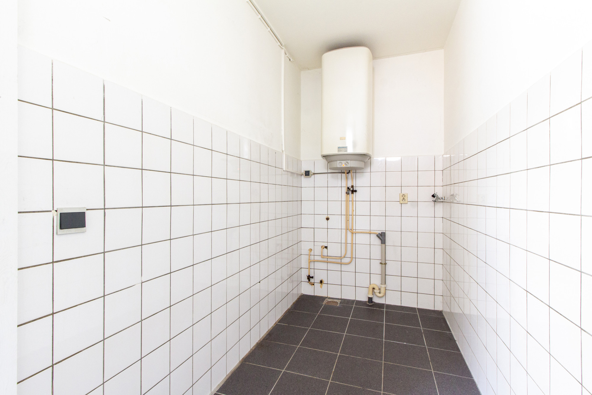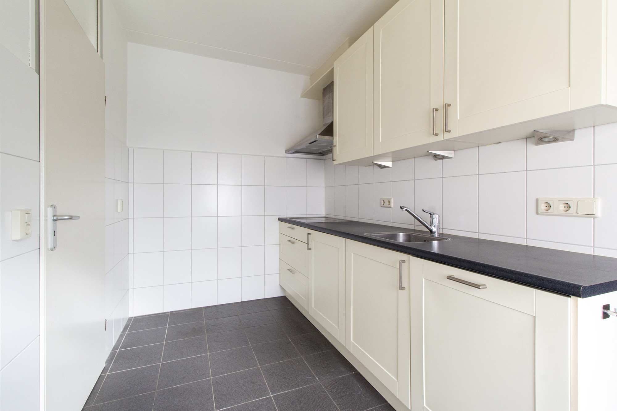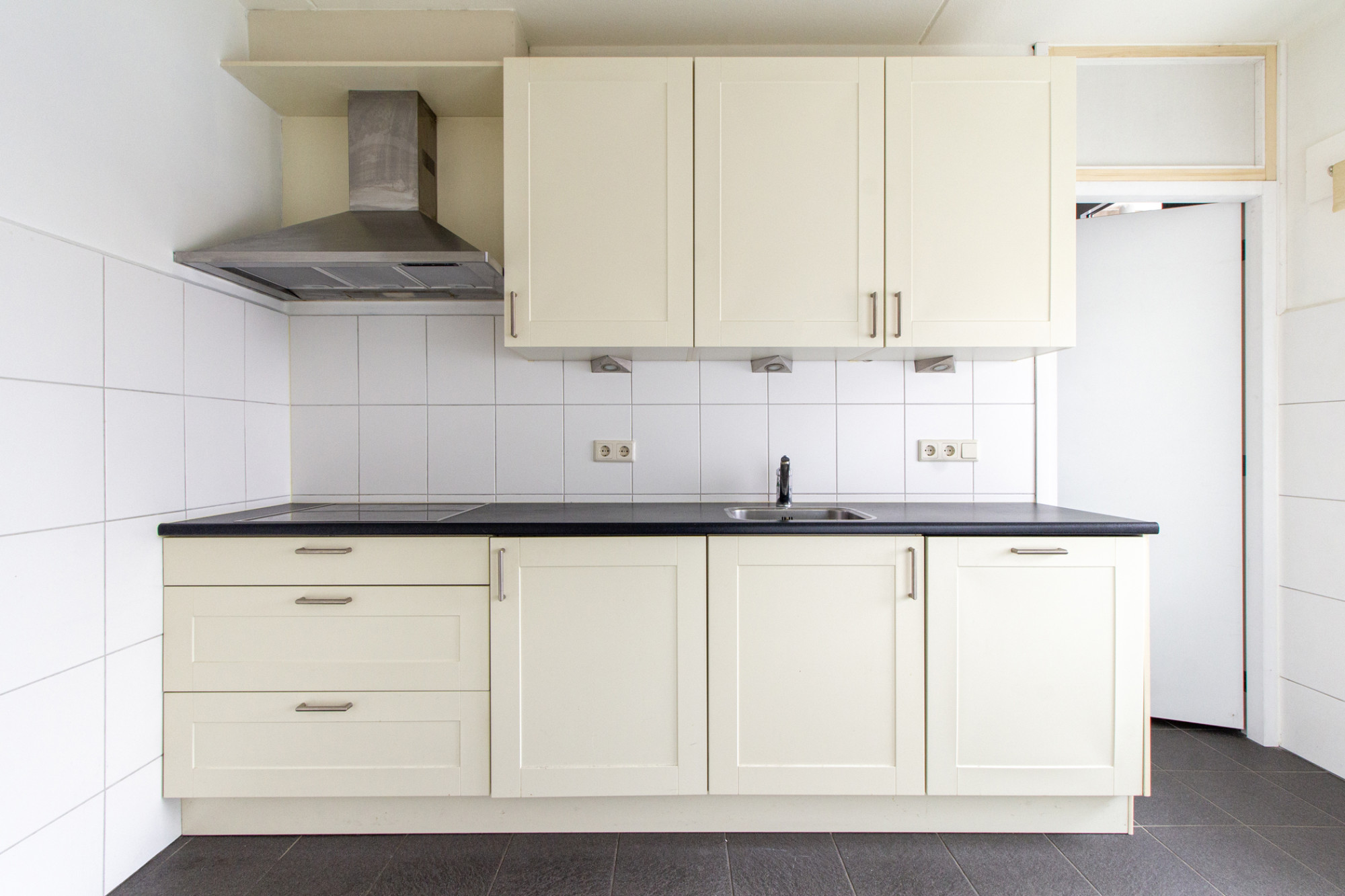 De gesloten keuken van ca. 8 m2 is voorzien van een net keukenblok met keramische kookplaat, afzuigkap, koelkast en vaatwasser. Achter de keuken bevindt zich de bijkeuken met witgoedaansluitingen en de elektrische boiler. Zowel de keuken als de bijkeuken, hal, badkamer en het toilet zijn voorzien van een nette tegelvloer.