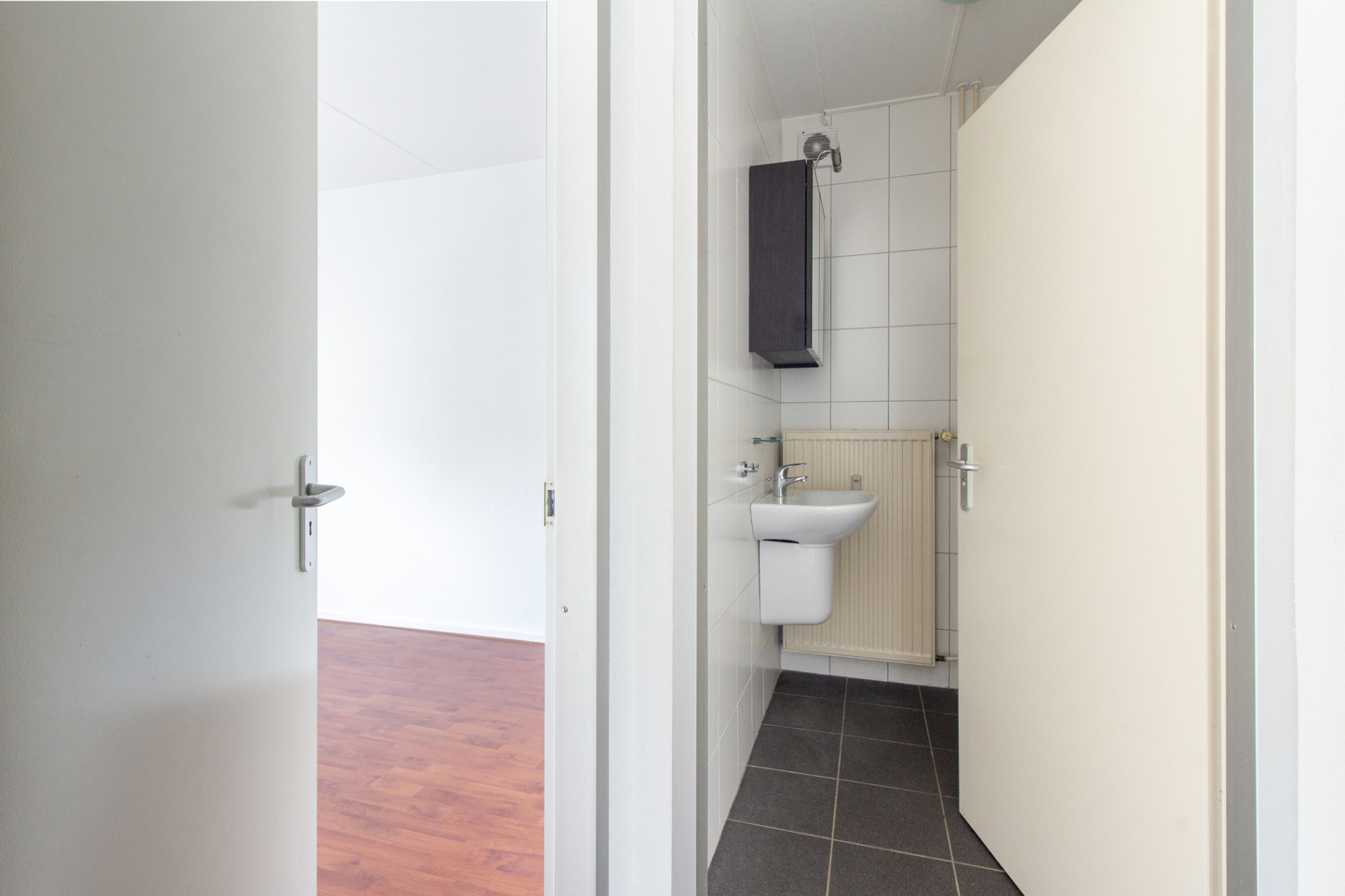 De aparte toiletruimte is halfhoog betegeld en voorzien van een staan closet en fonteintje.