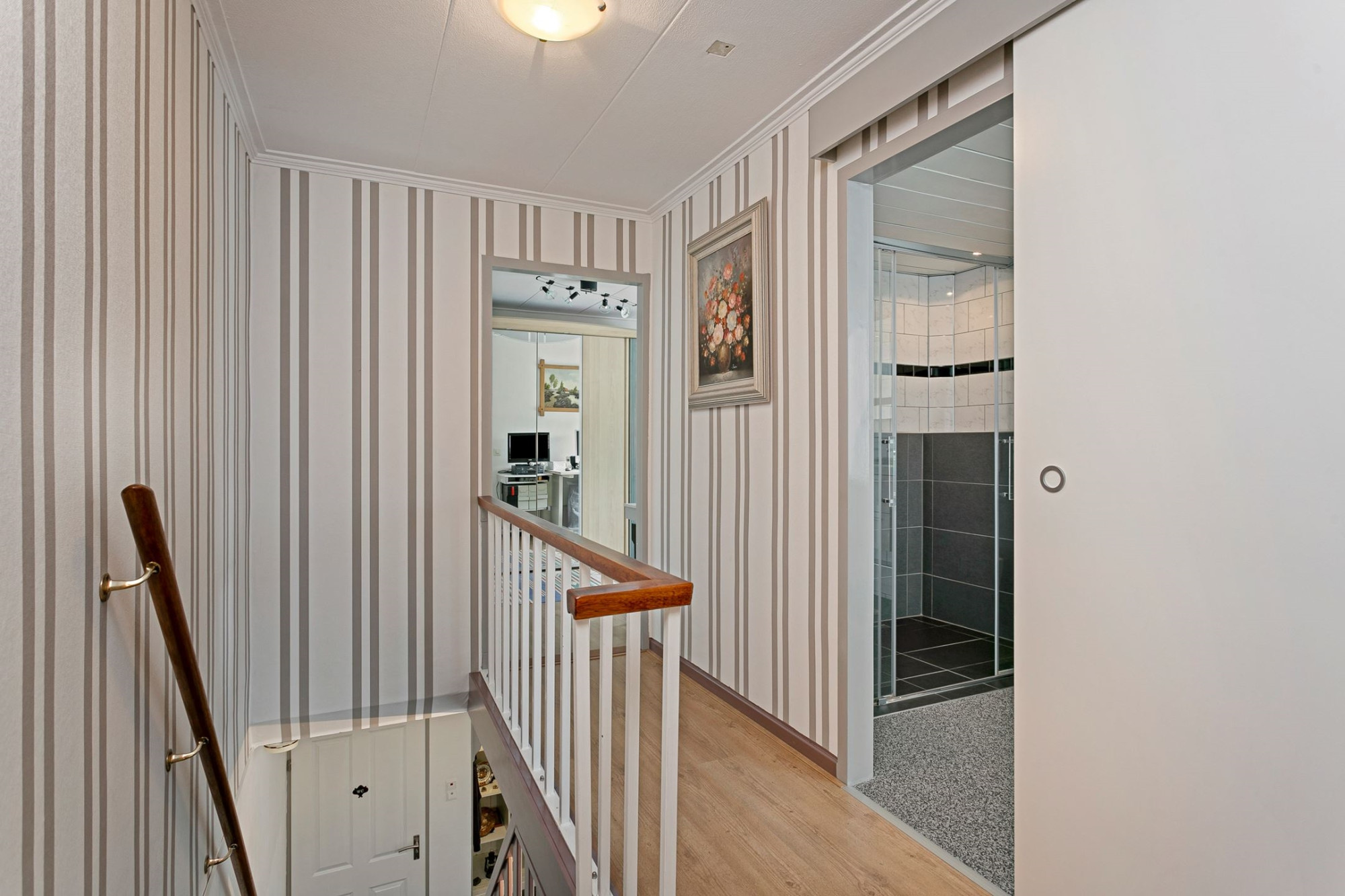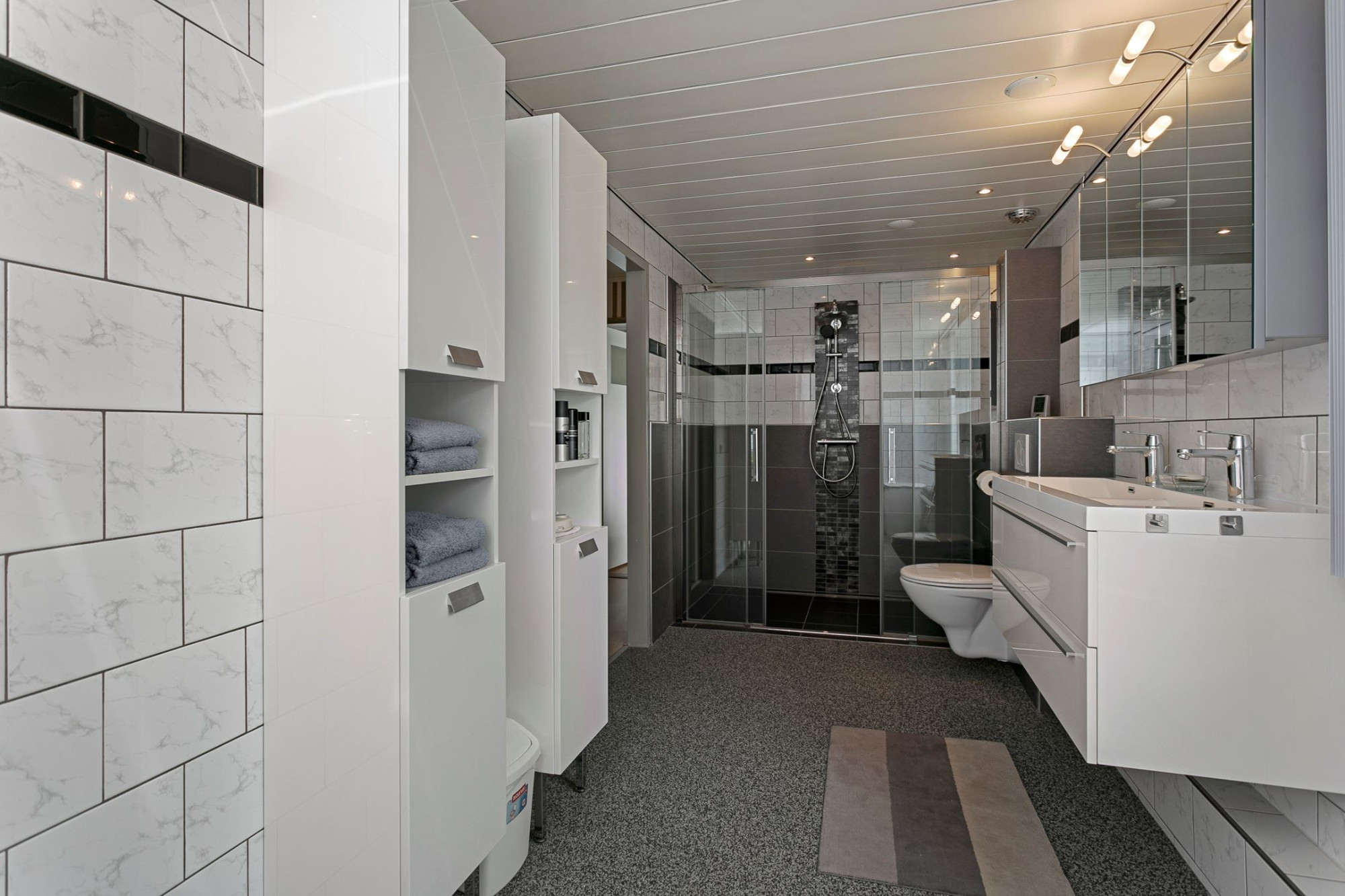 Overloop. De verdieping heeft de beschikking over 2 slaapkamers van resp. 3.00m x 4.07m en 5.68m / 3.50m x 4.07m. Ook beschikt de verdieping over een zeer ruime geheel betegelde badkamer (5.57m x 2.07m) met fraaie inloopdouche en 2 vaste wastafelmeubels.