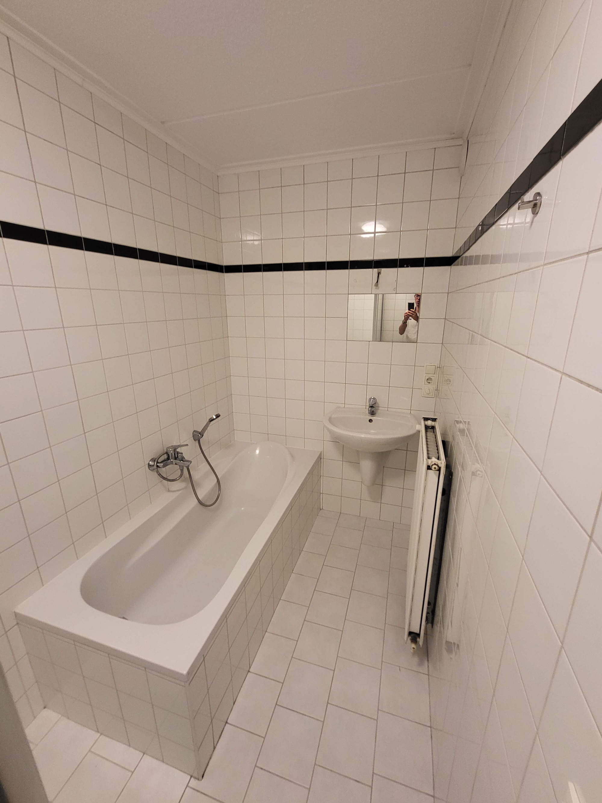 Geheel betegelde badkamer (1,5 x 3m = ca. 4,6 m²) voorzien van ligbad, aparte douche en wastafel.
