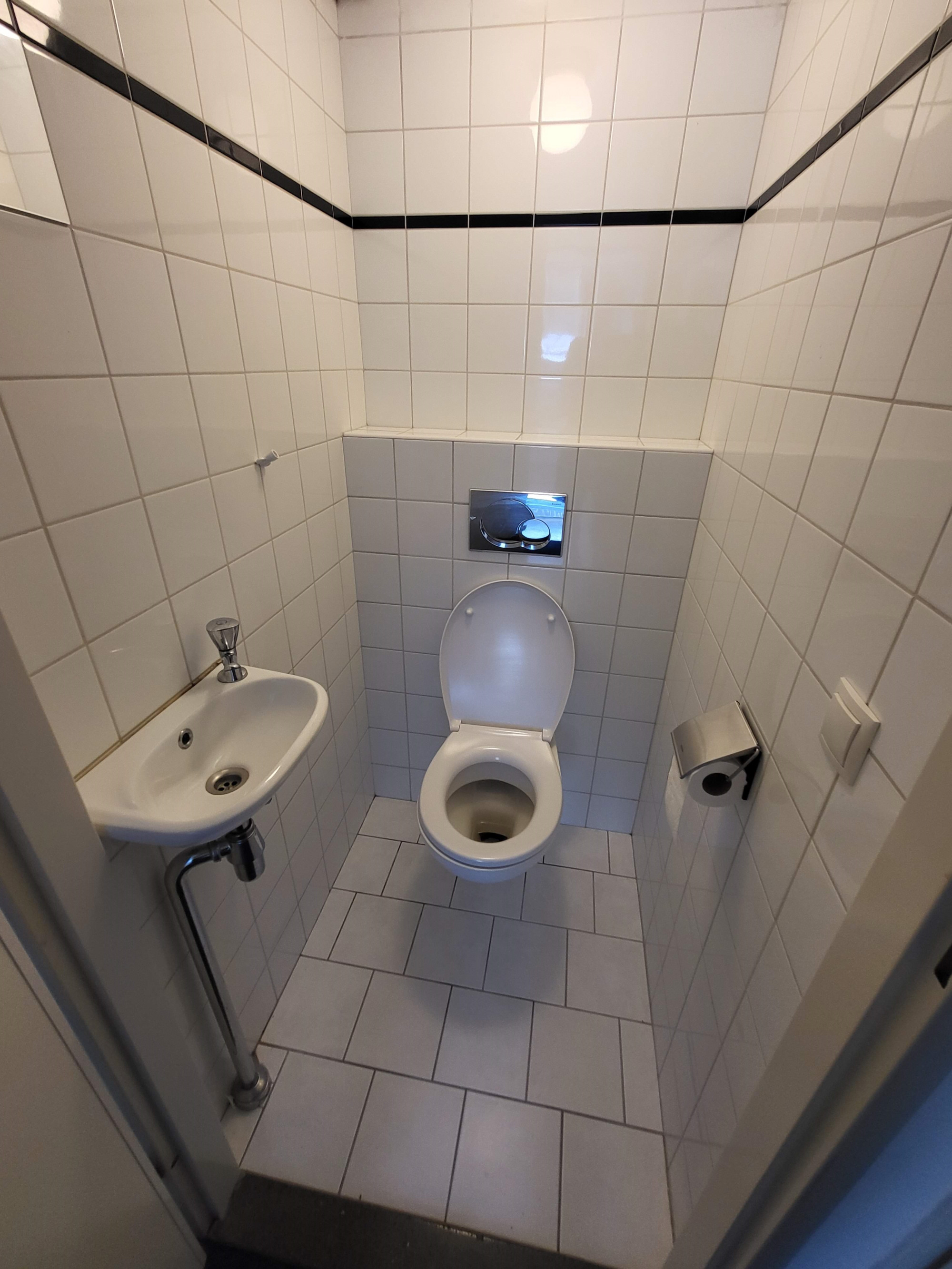 Geheel betegelde toiletruimte voorzien van hangend toilet met inbouwreservoir en fonteintje.