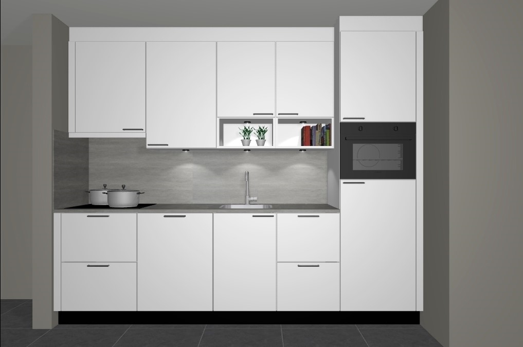 De NIEUWE keukenopstelling wordt voorzien van een inductie kookplaat, inbouw koelkast, vaatwasser combi oven en een afzuigkap.