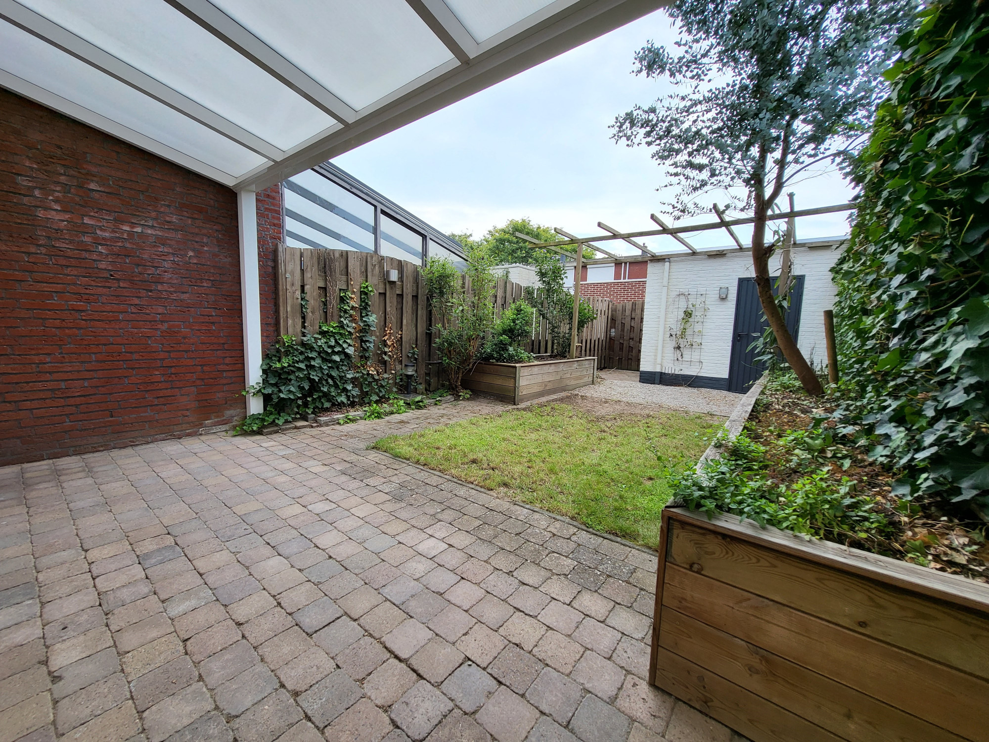 De sfeervolle, achtertuin met overkapping is te bereiken vanuit de woonkamer.
