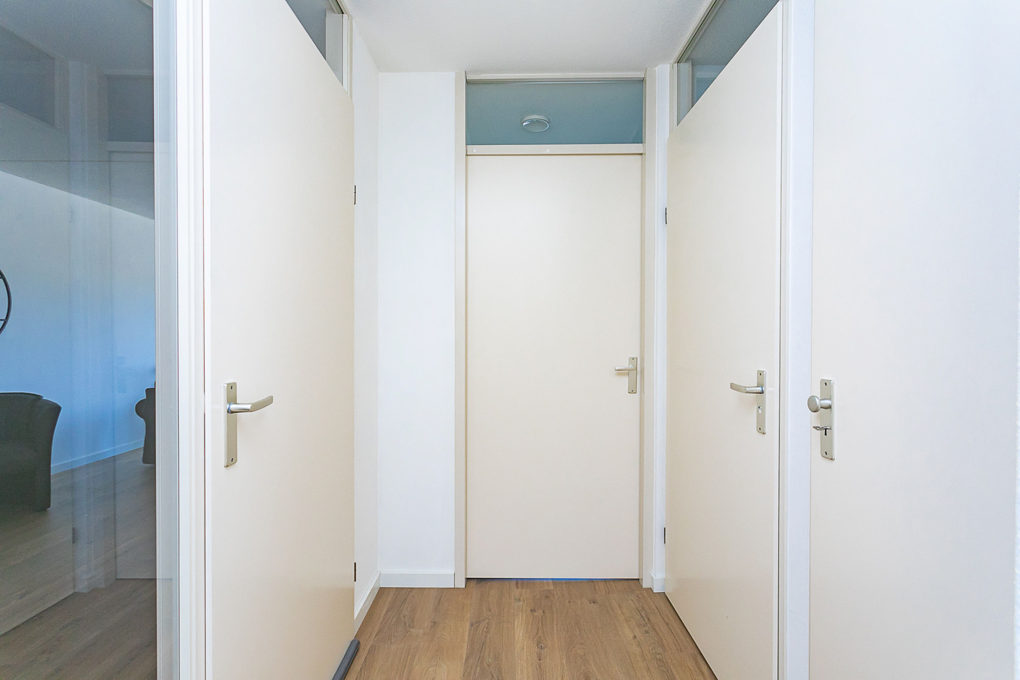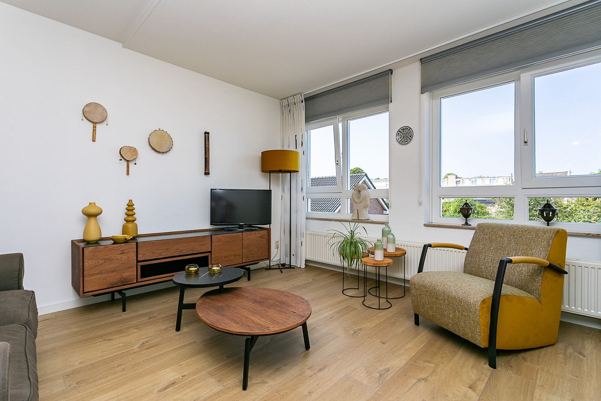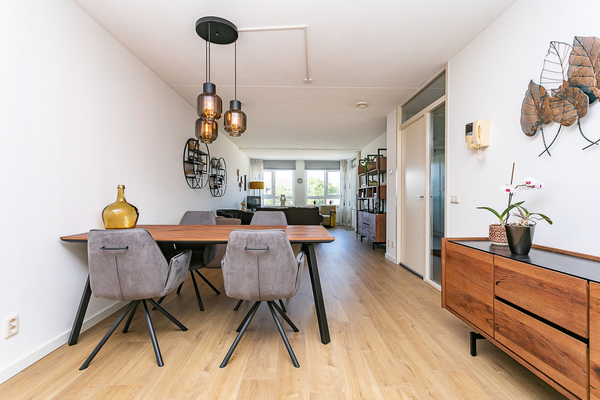 Centraal gesitueerde eetkamer met toegang tot de tussenhal naar de slaapvertrekken, badkamer en toilet. Aan de voorzijde gelegen living/lounge met ruime zithoek met toegang tot het balkon, voorzien van een elektrisch bedienbaar screendoek zonwering.