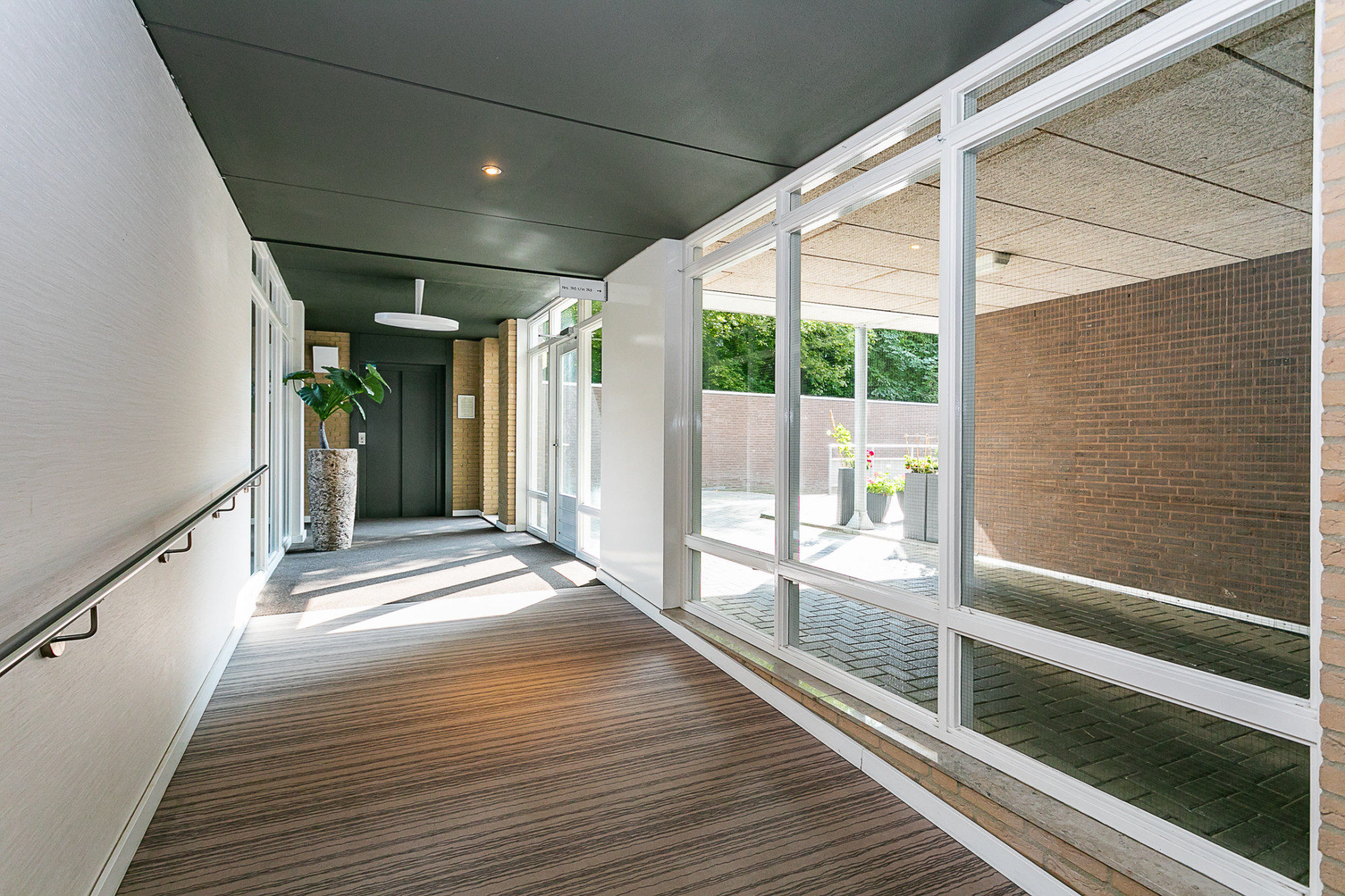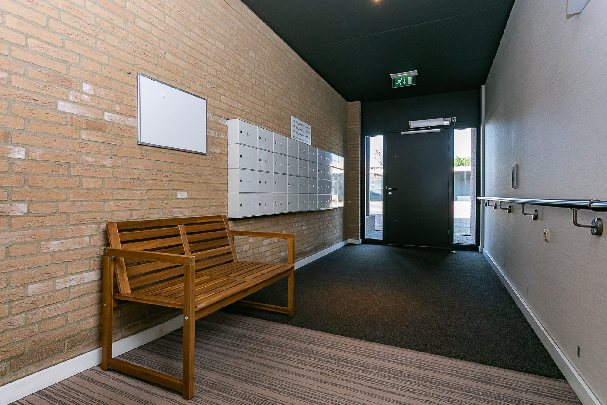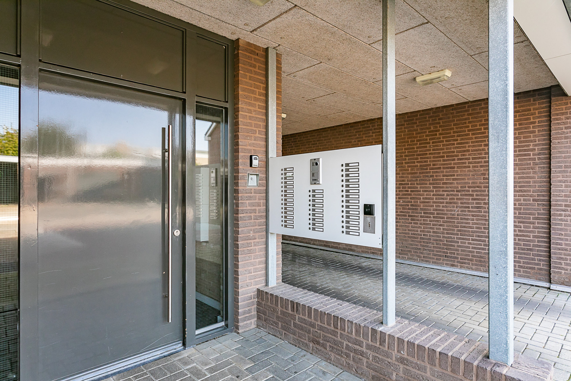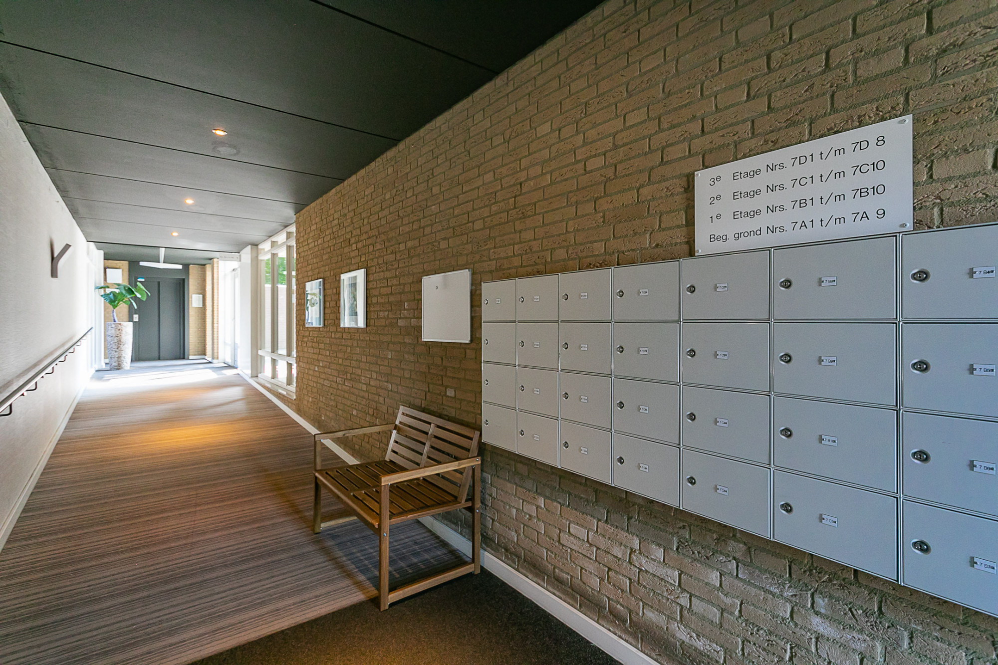 Entree/hal en gang, brievenbussen, deurbeldrukkertableau met video-intercom, trappartijen, galerijen en personenliftinstallatie.