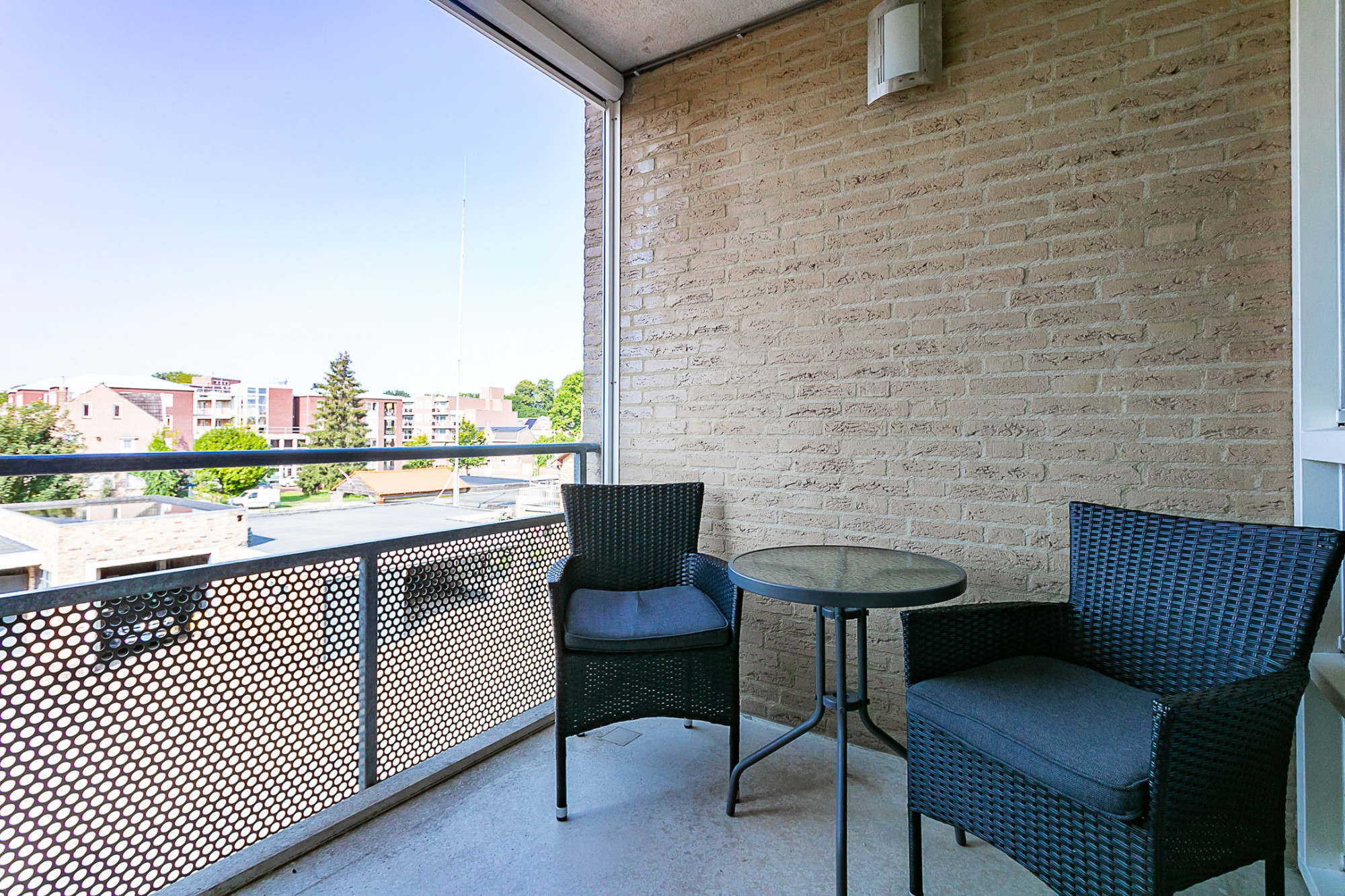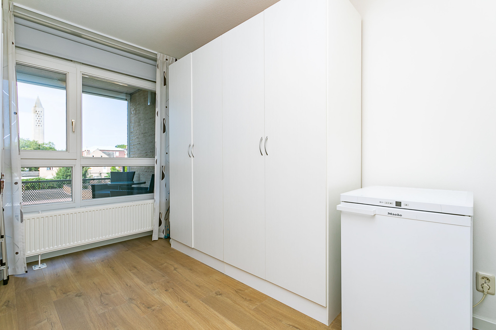 Het appartement beschikt over twee royale slaapkamers, beide met voldoende ruimte voor kasten en een comfortabel bed. De badkamer is praktisch ingedeeld met een douchecabine, wastafel en aansluitingen voor uw wasmachine en droger. Daarnaast is er een separaat gastentoilet met fonteintje, wat zorgt voor extra comfort en privacy.