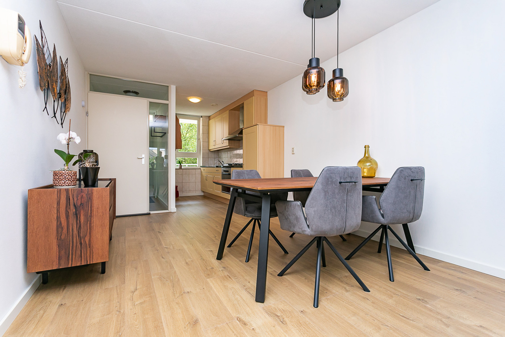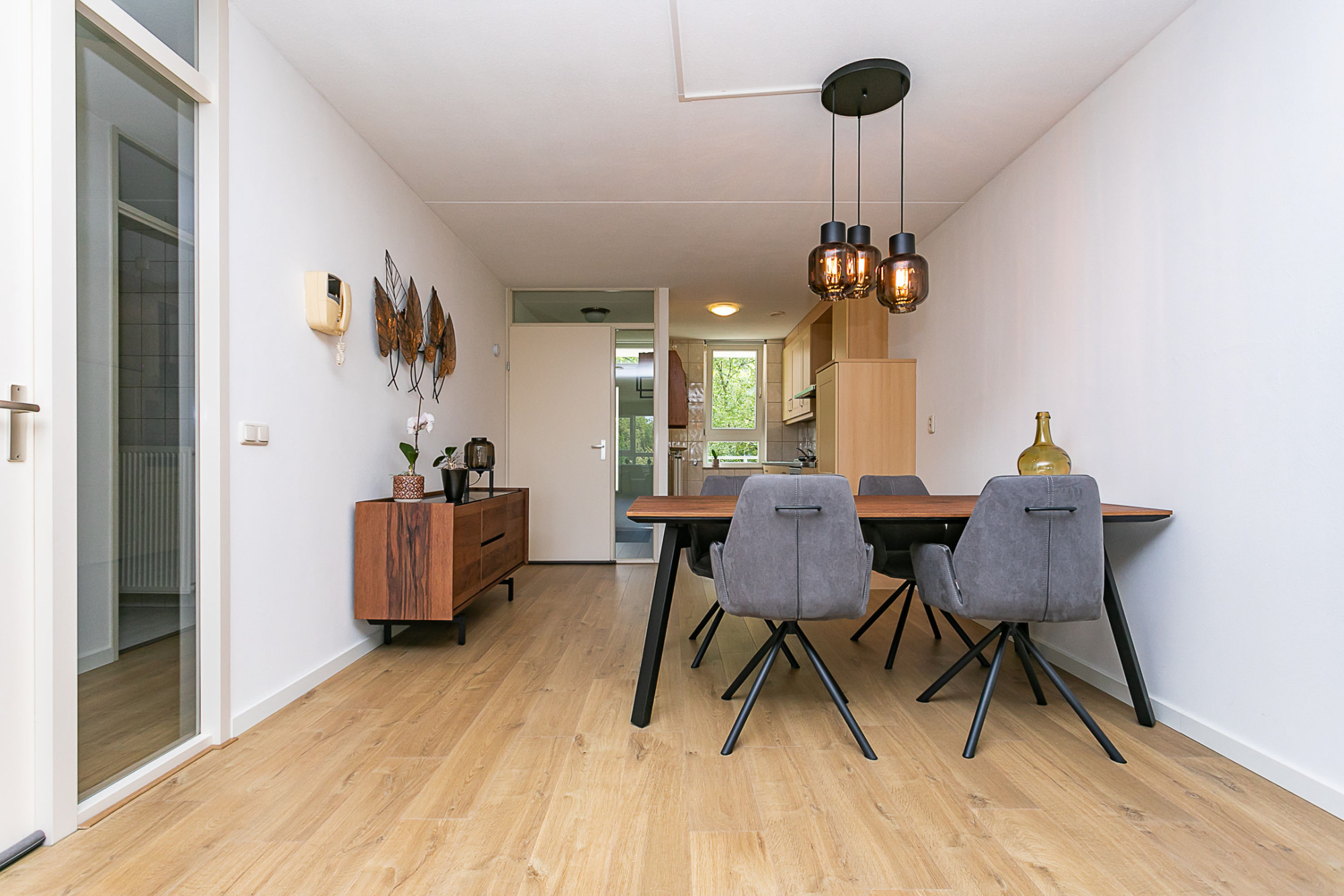 Bij binnenkomst wordt u verwelkomd in een lichte en ruime woonkamer, voorzien van een eigentijdse laminaatvloer. De living, gelegen aan de voorzijde, biedt directe toegang tot het balkon. Centraal in het appartement bevindt zich de eetkamer. De halfopen keuken is modern ingericht en voorzien van alle benodigde inbouwapparatuur.