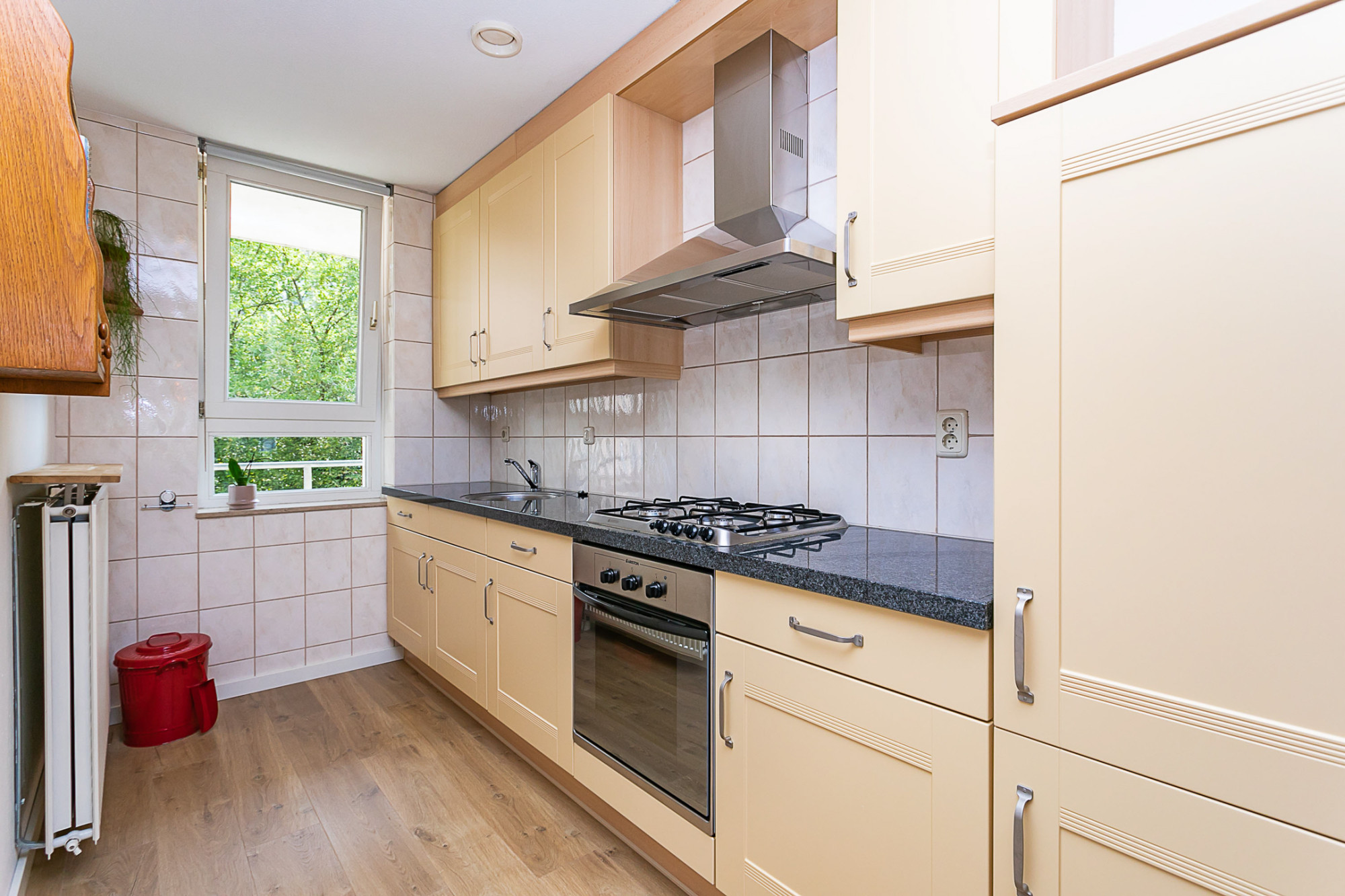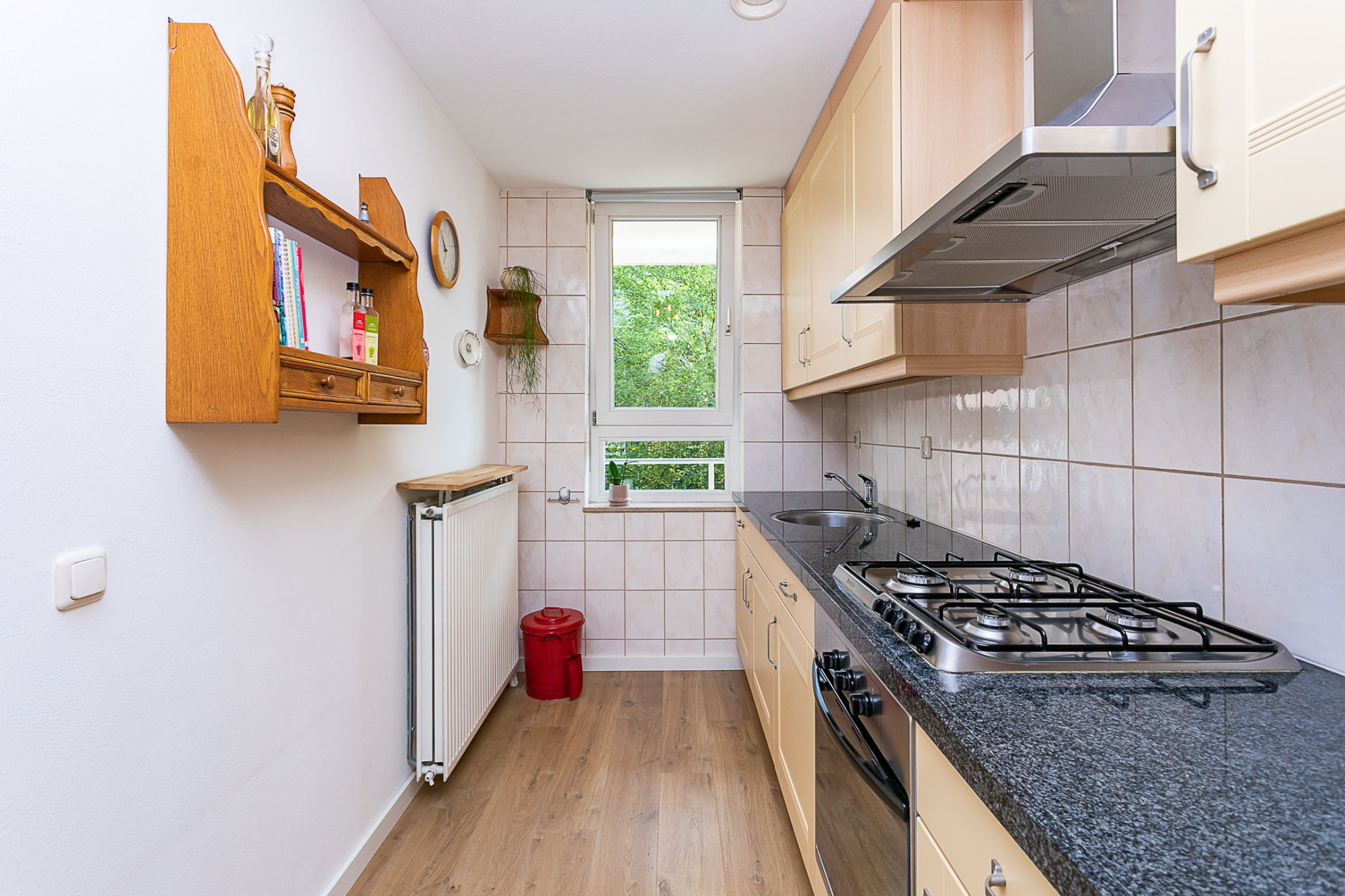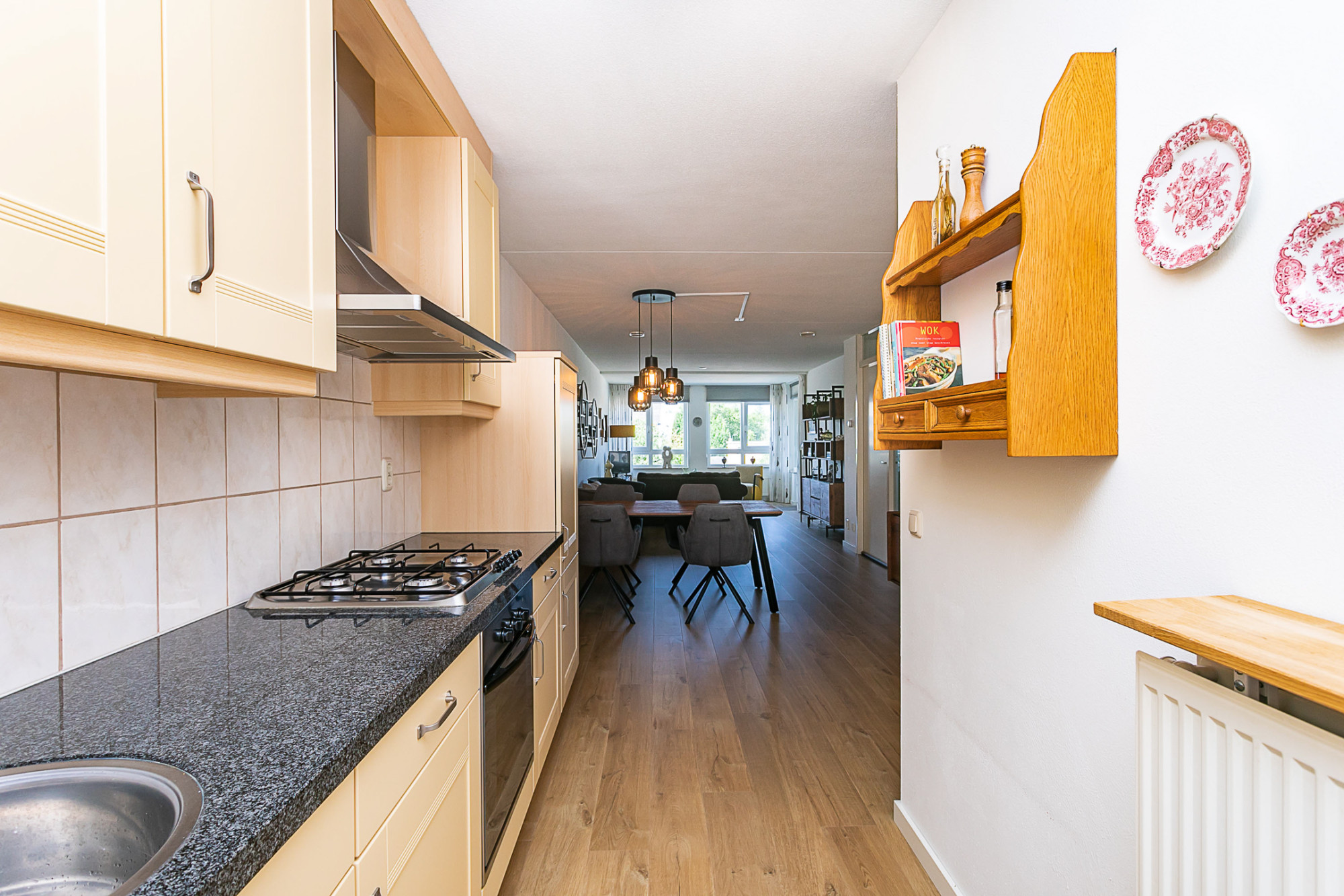 Ruime woonkamer met halfopen keuken voorzien van een moderne inbouwkeuken in landelijke stijl met apparatuur, te weten: 4 pits gasfornuis / afzuigkap / elektrische oven / wasbak / koelkast, granieten werkblad en veel opbergruimte. Het gehele appartement is voorzien van een dorpelloos gelegde laminaatvloer in eiken white-wash design.