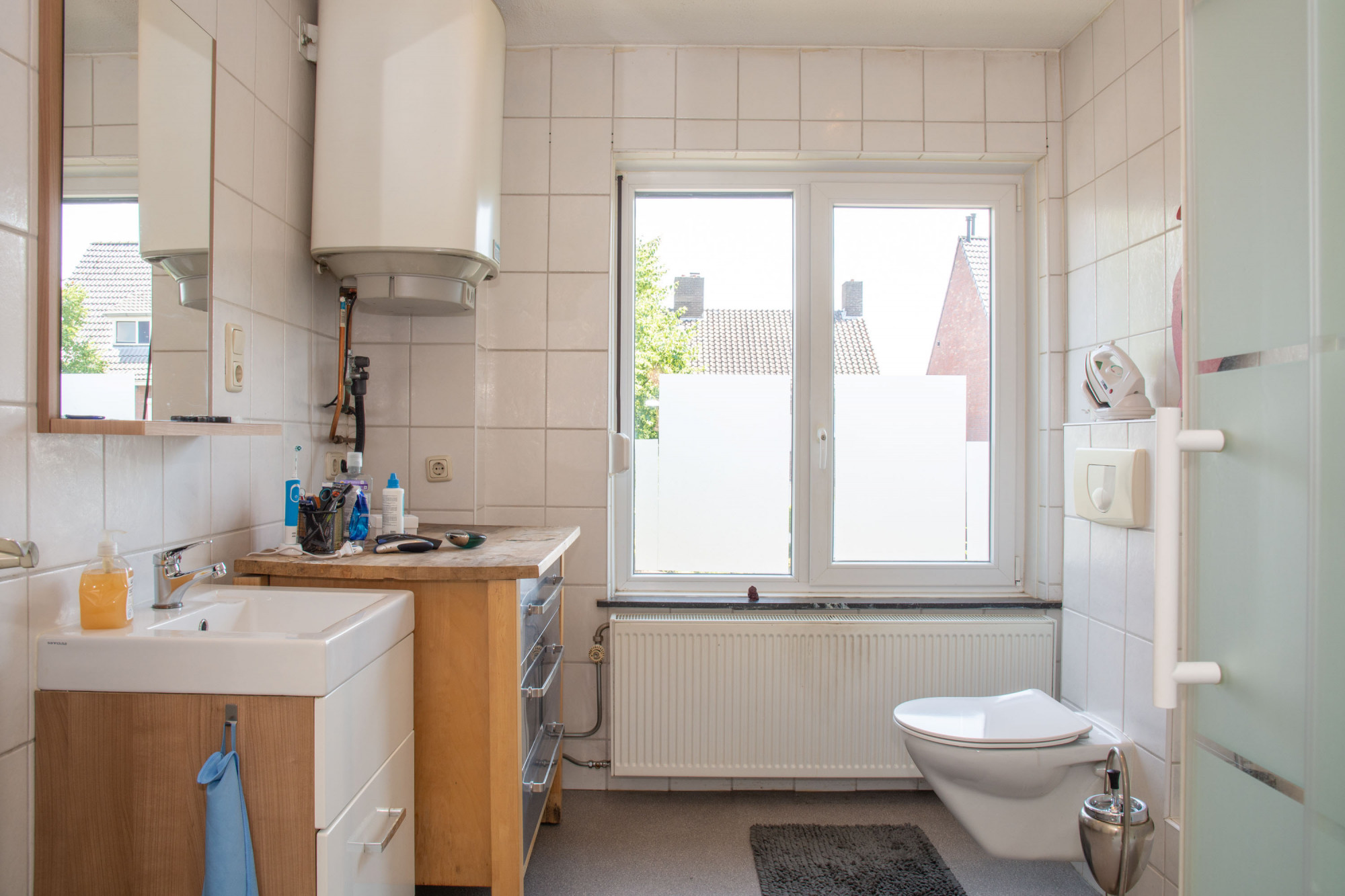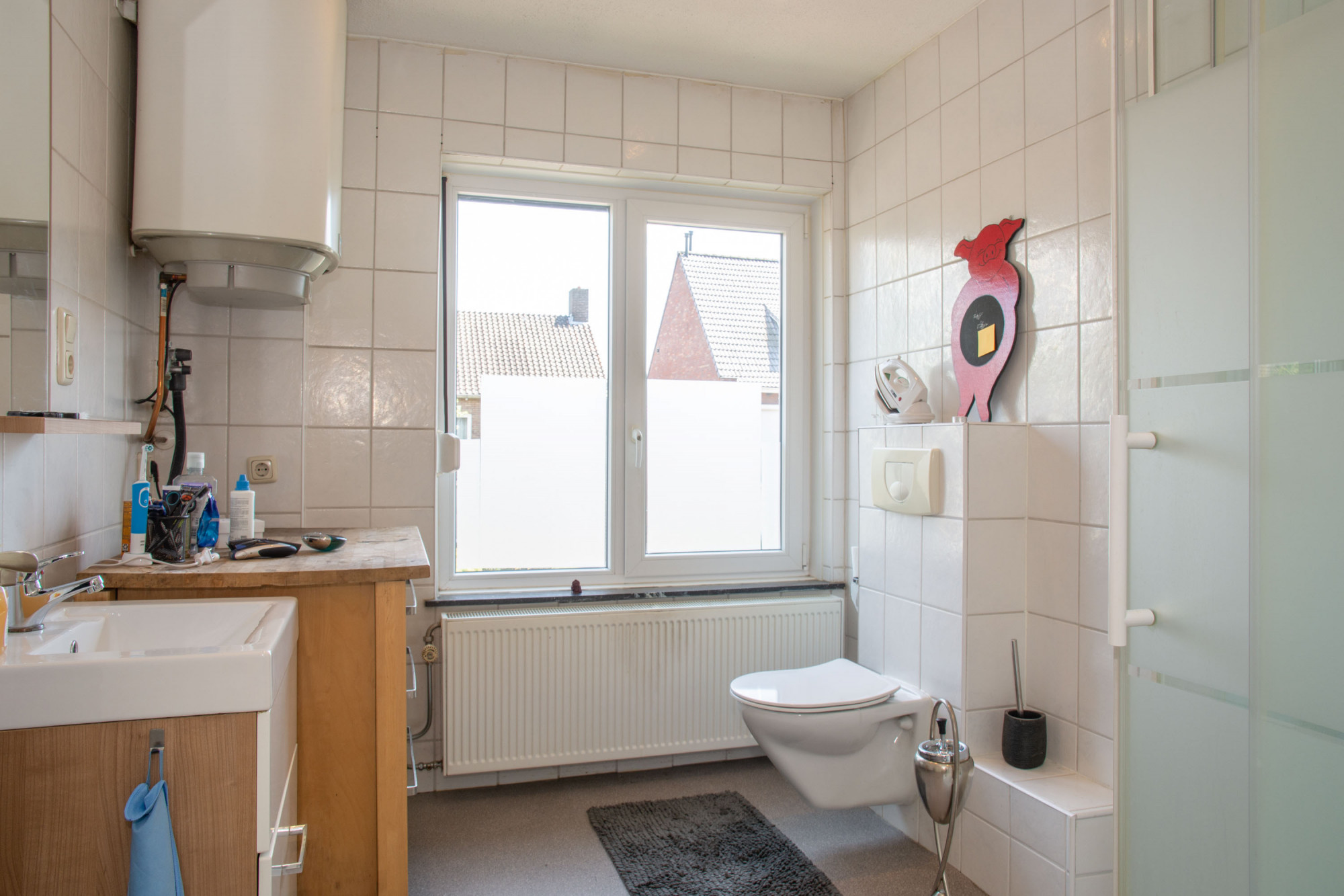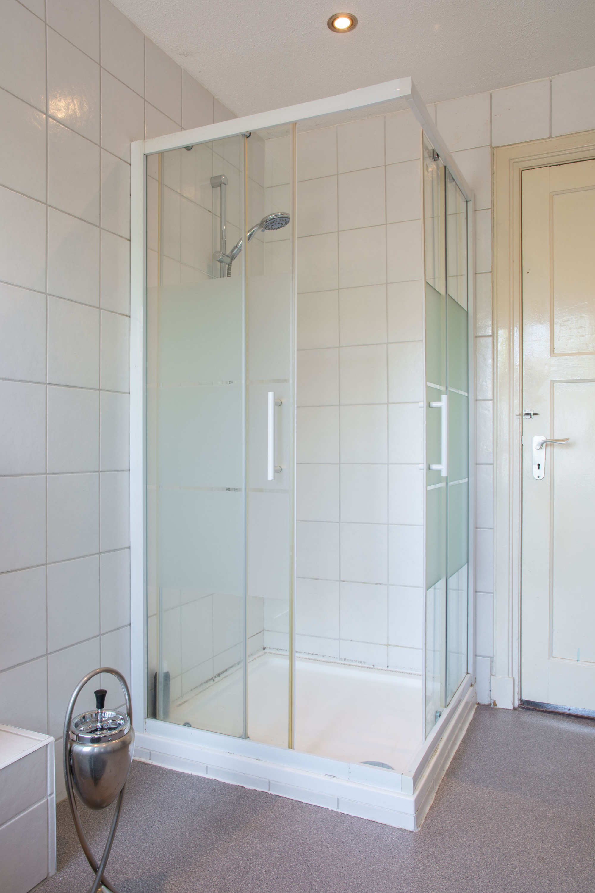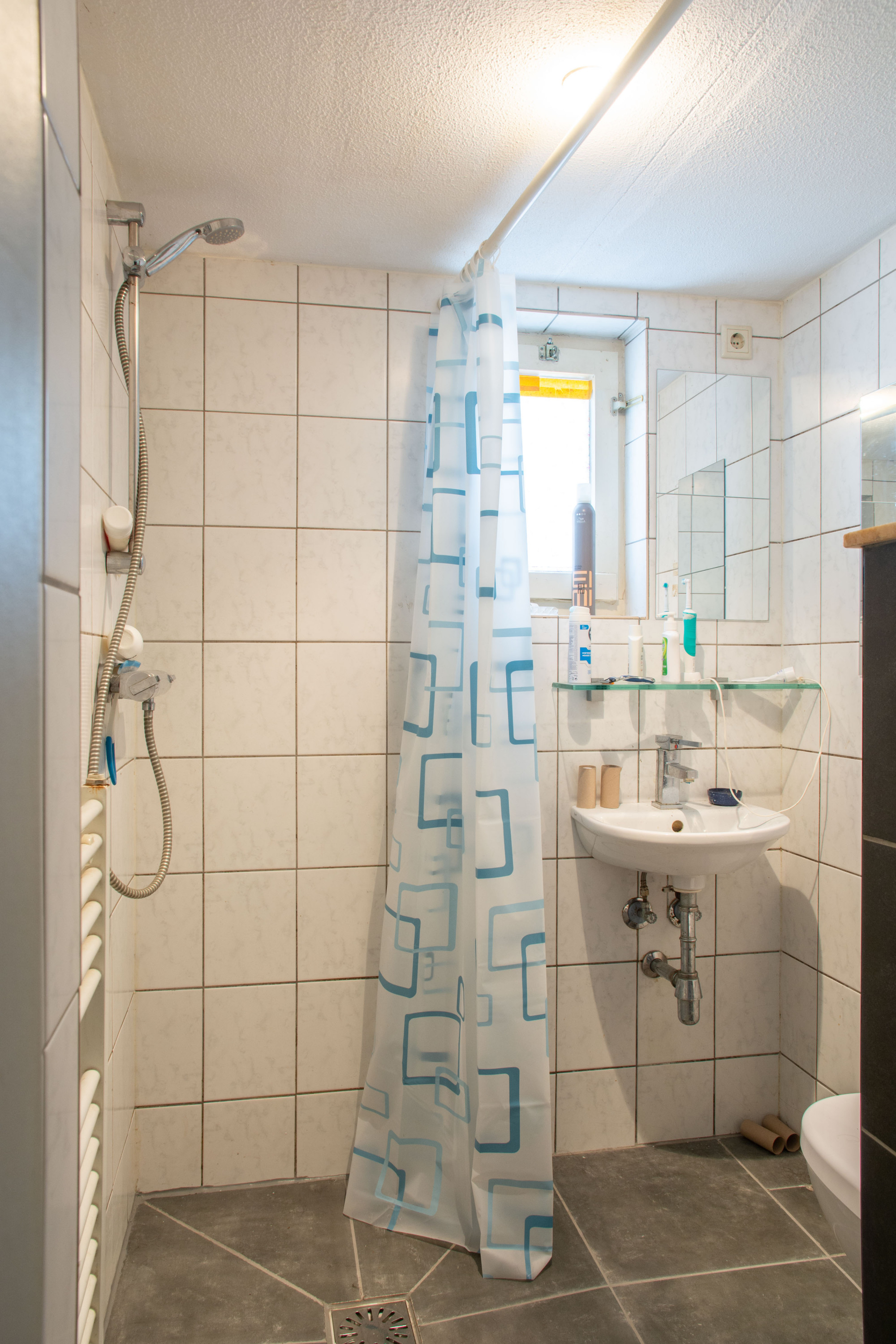 Badkamer met douche, toilet, vaste wastafel en elektrische boiler.