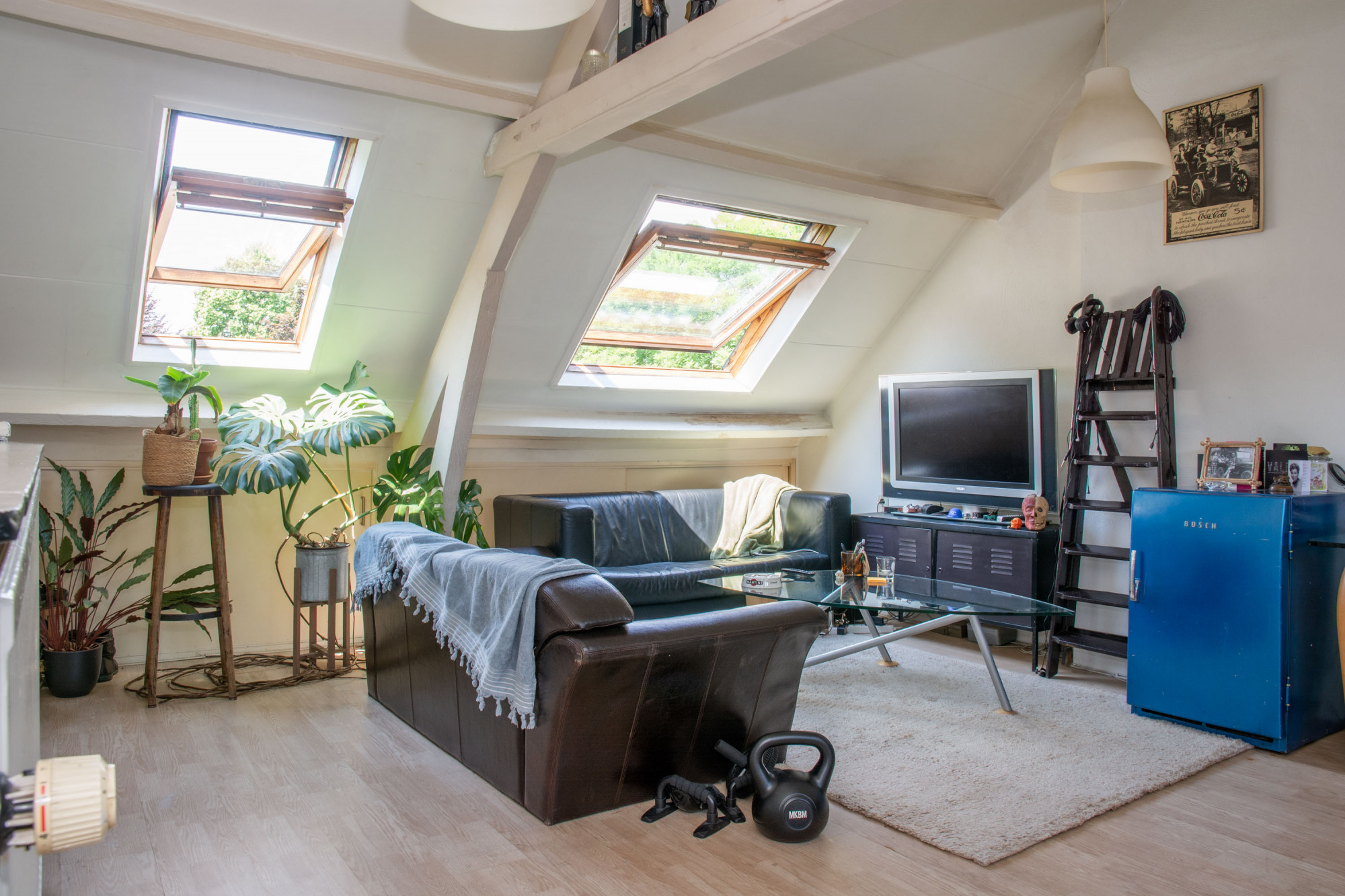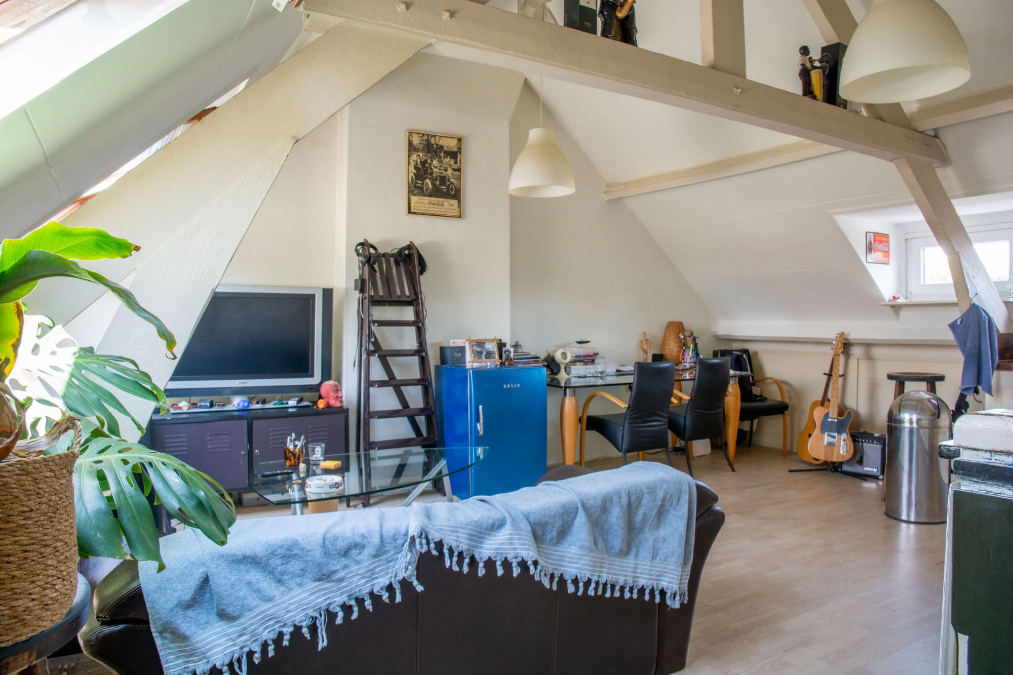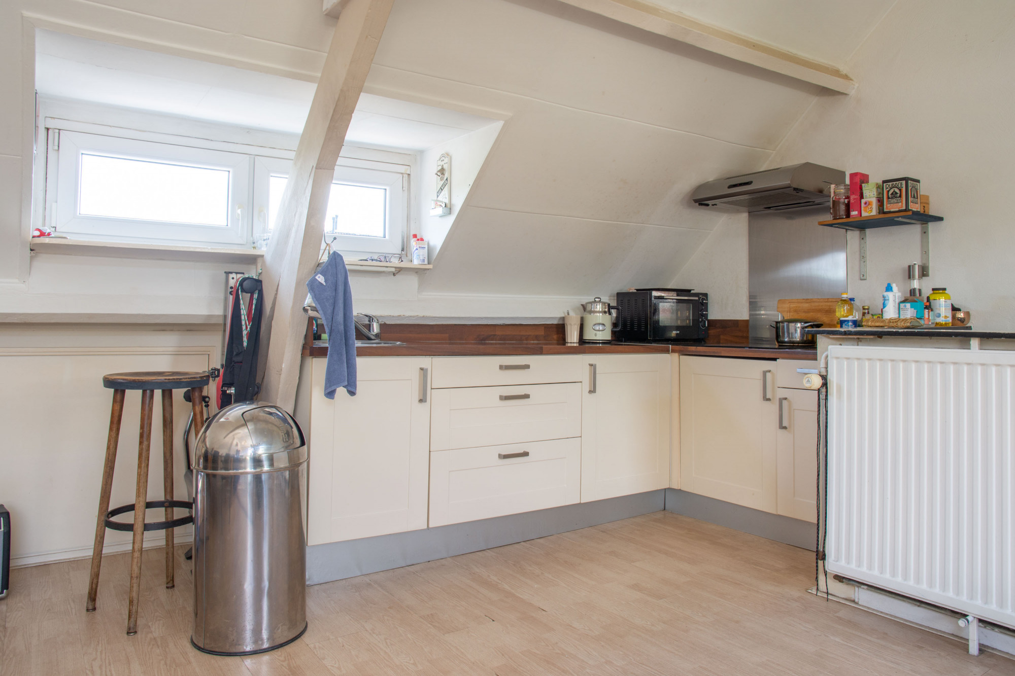 Woonkamer met open keuken voorzien van aanbouwkeuken.