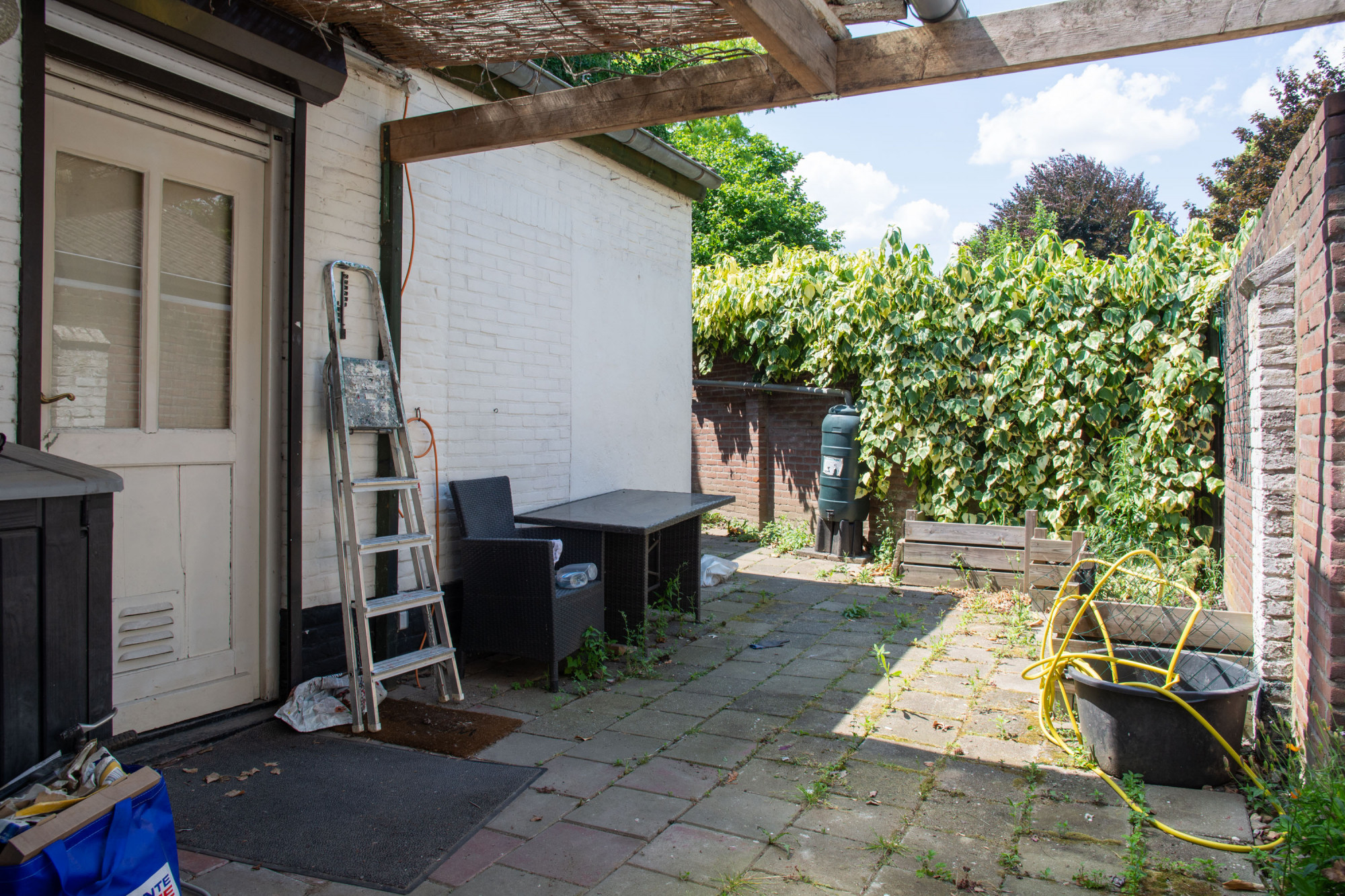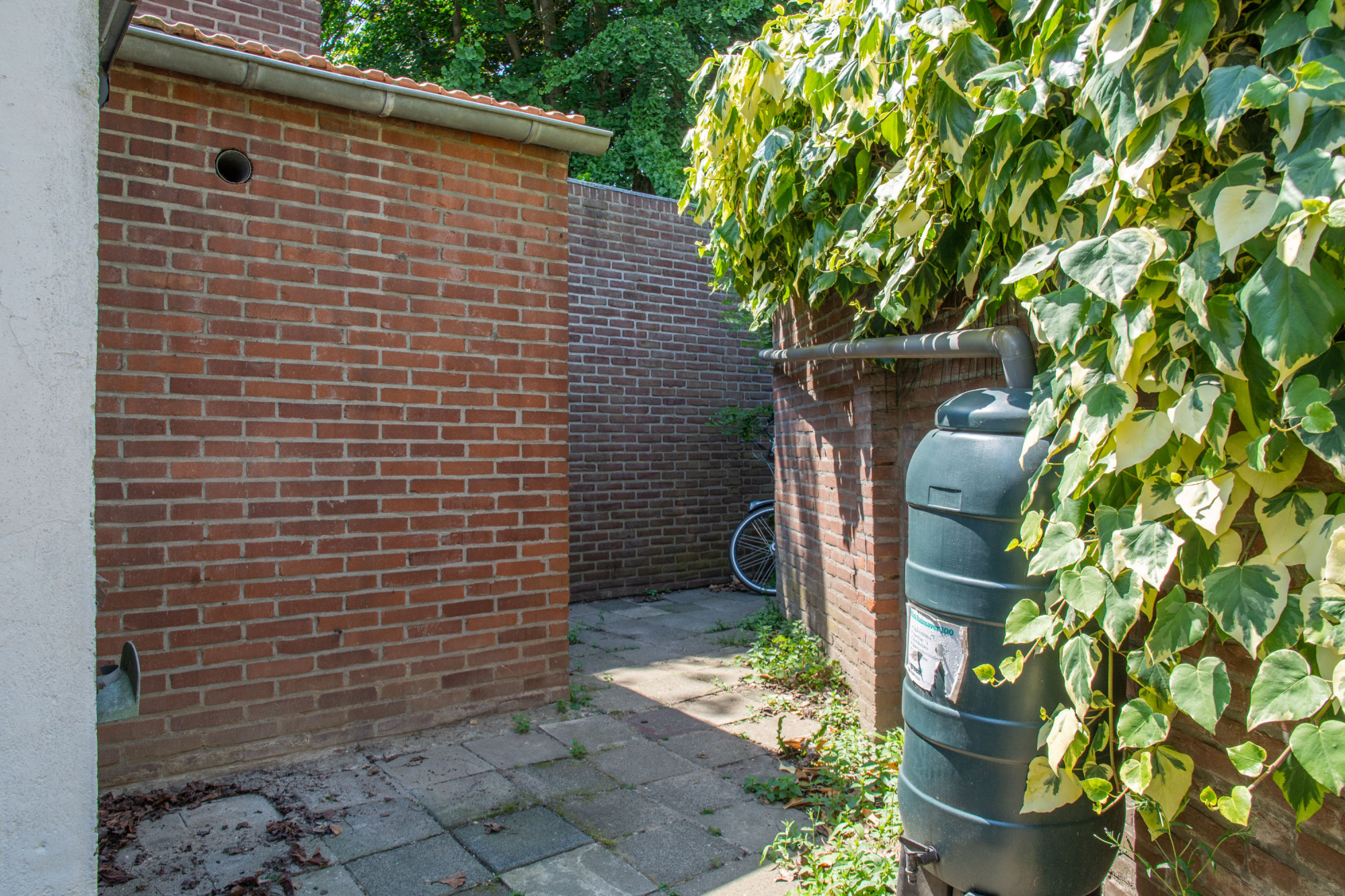 Eenvoudige kleine tuin met achterom aan de rechterzijde en ook aan de achterzijde van het perceel.