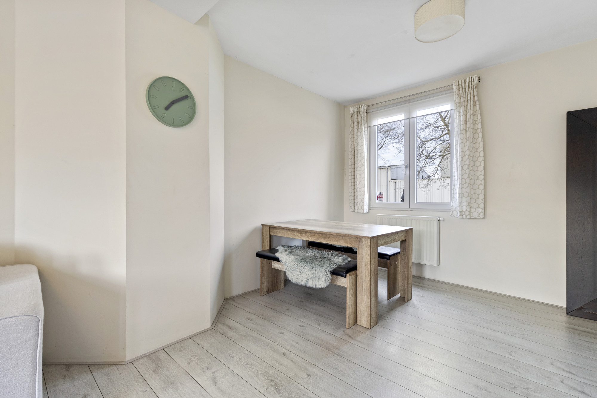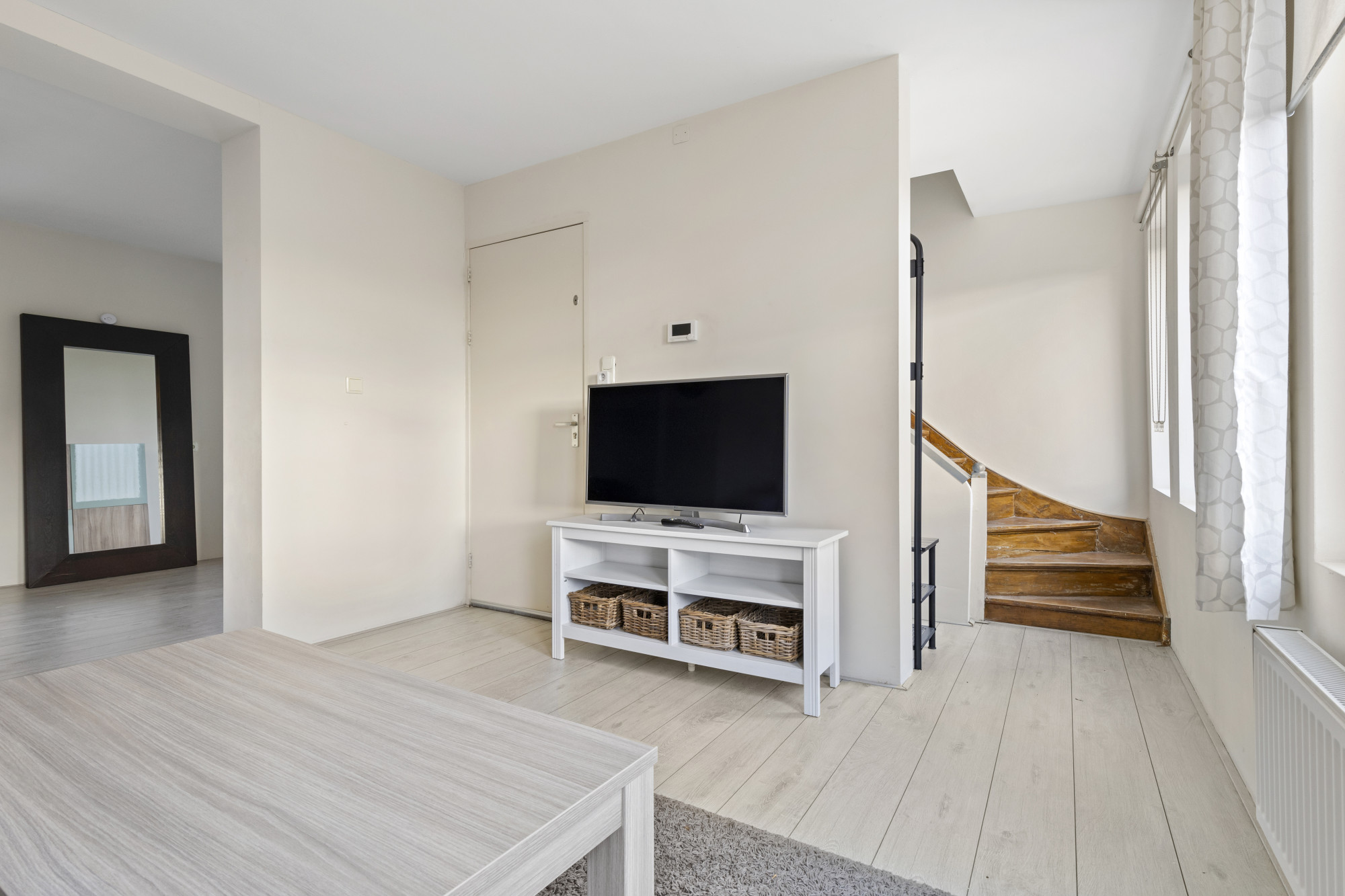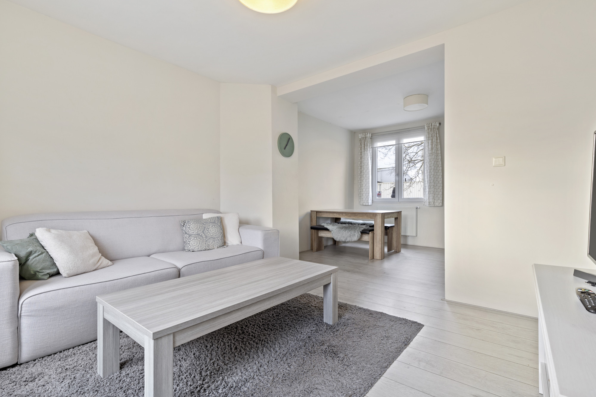 Via de overloop komt u in de lichte en sfeervolle zitkamer met open keuken. Dankzij de vele ramen geniet deze verdieping van een prettige natuurlijke lichtinval. De woonkamer is afgewerkt met een laminaatvloer en biedt toegang tot de vaste trap naar de tweede verdieping.