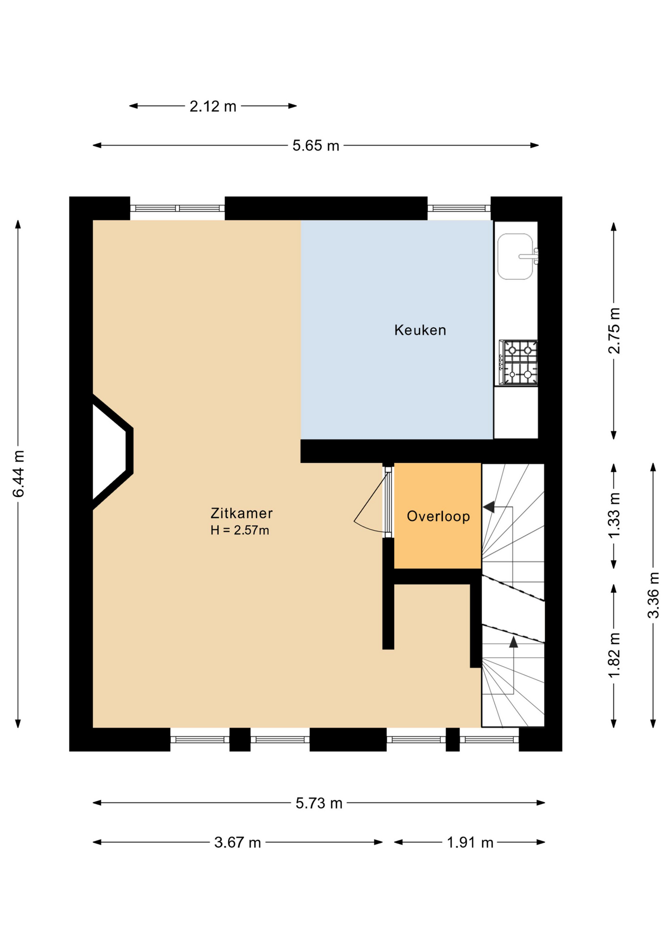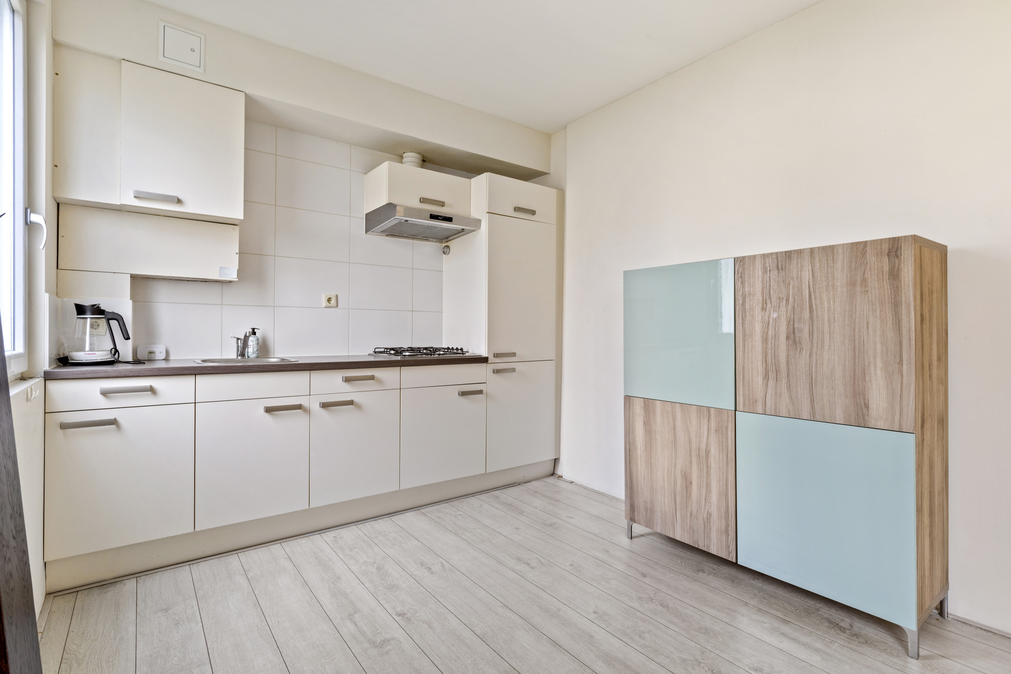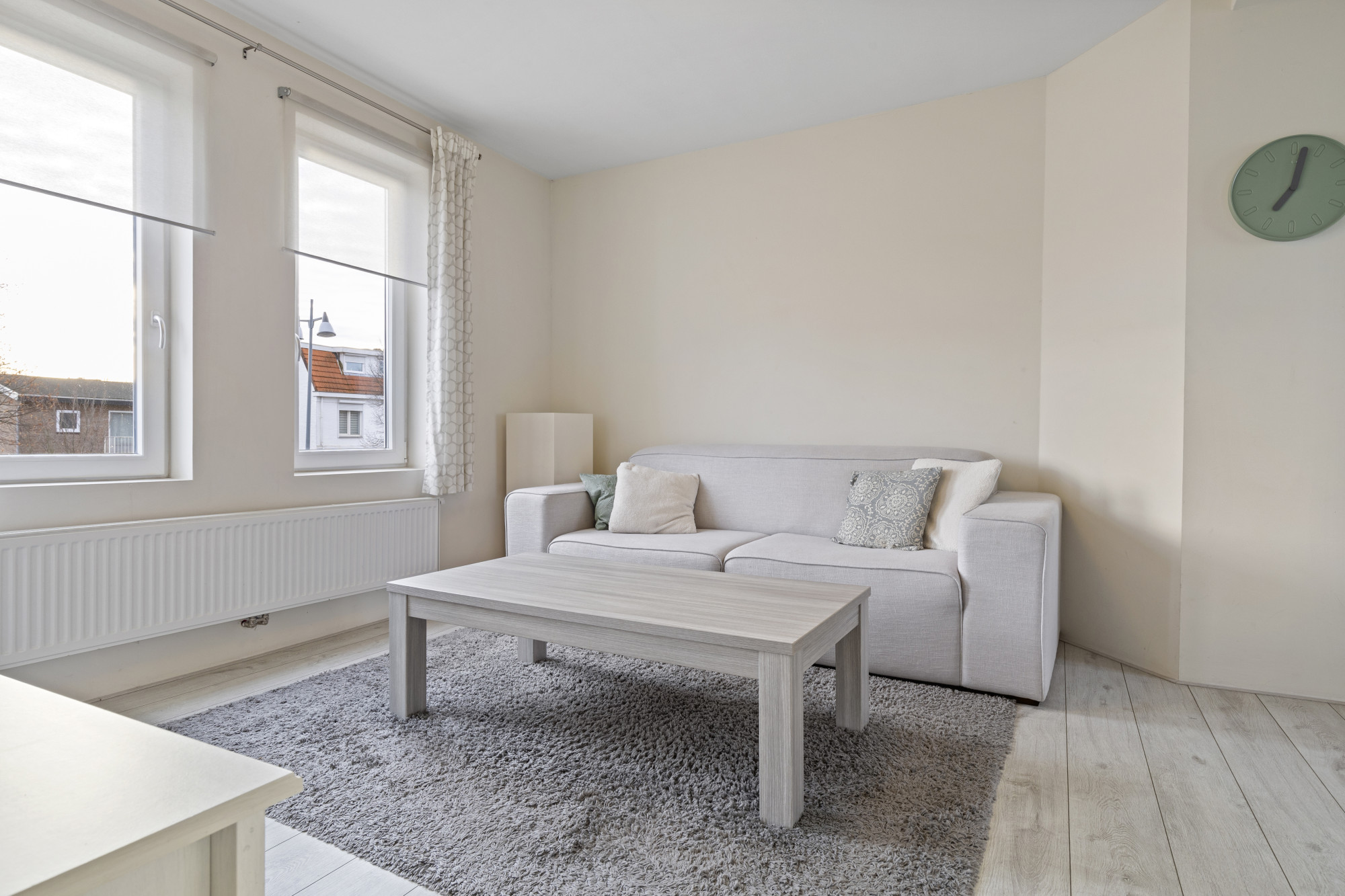 Via de overloop komt u in de lichte en sfeervolle zitkamer met open keuken. Dankzij de vele ramen geniet deze verdieping van een prettige natuurlijke lichtinval. De woonkamer is afgewerkt met een laminaatvloer en biedt toegang tot de vaste trap naar de tweede verdieping.
