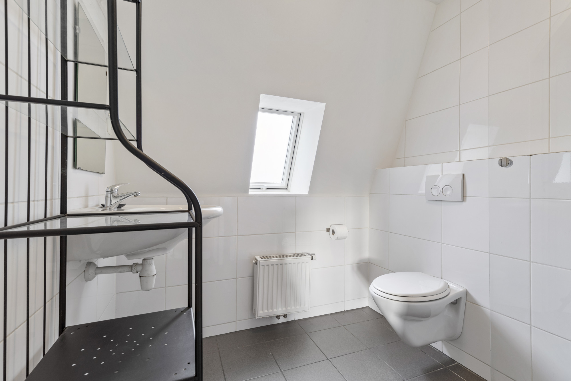 De volledig betegelde badkamer beschikt over een hangend closet, wastafel en douche.