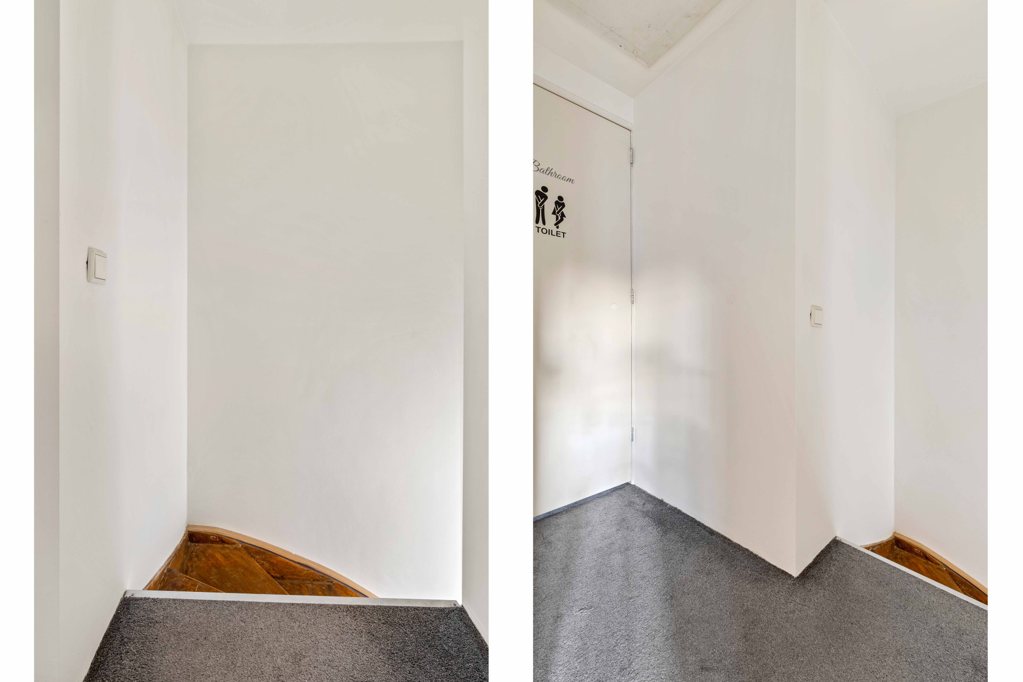 De entree en hal zijn gedeeld en bieden toegang tot de trapopgang richting het appartement.