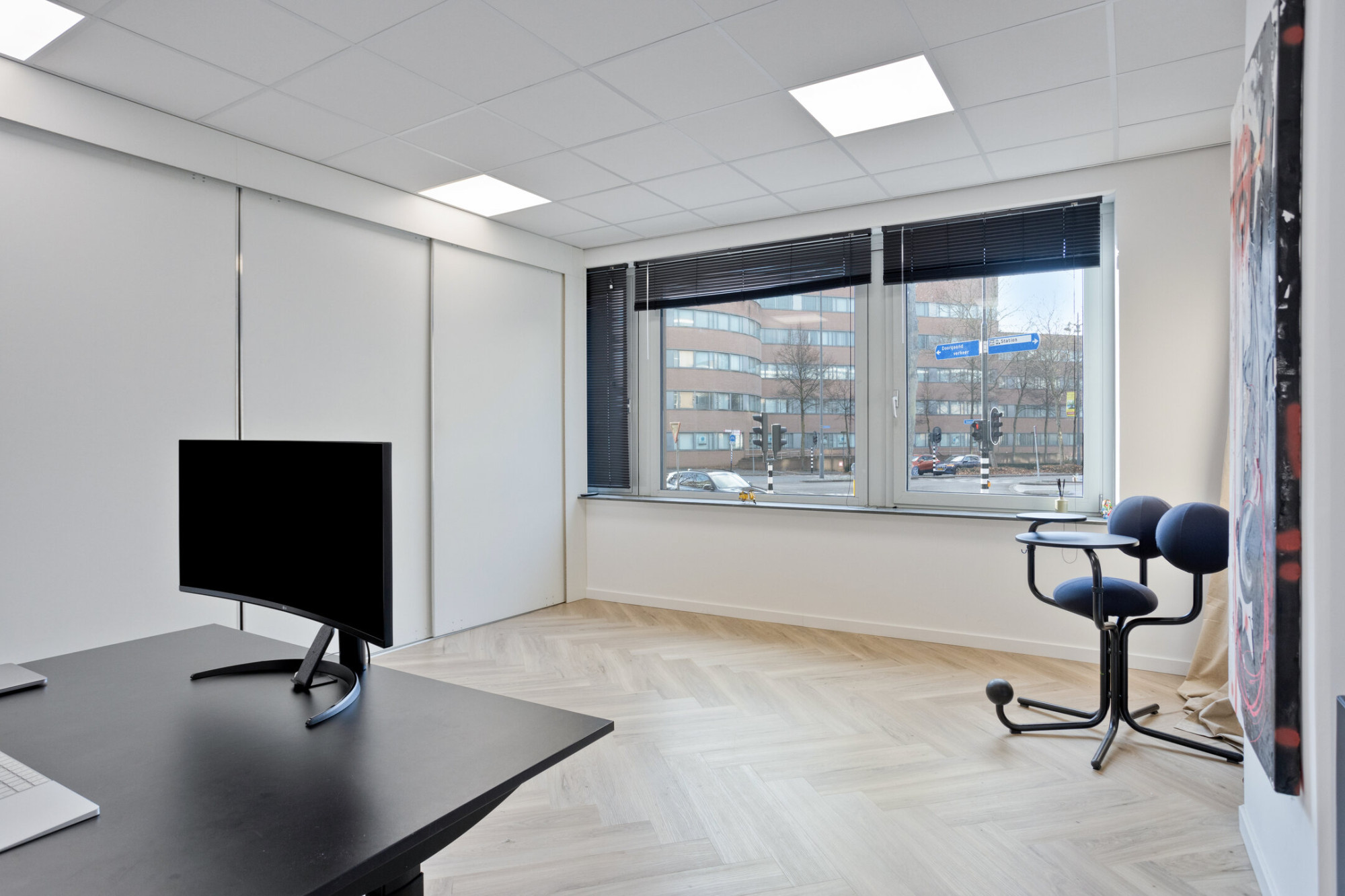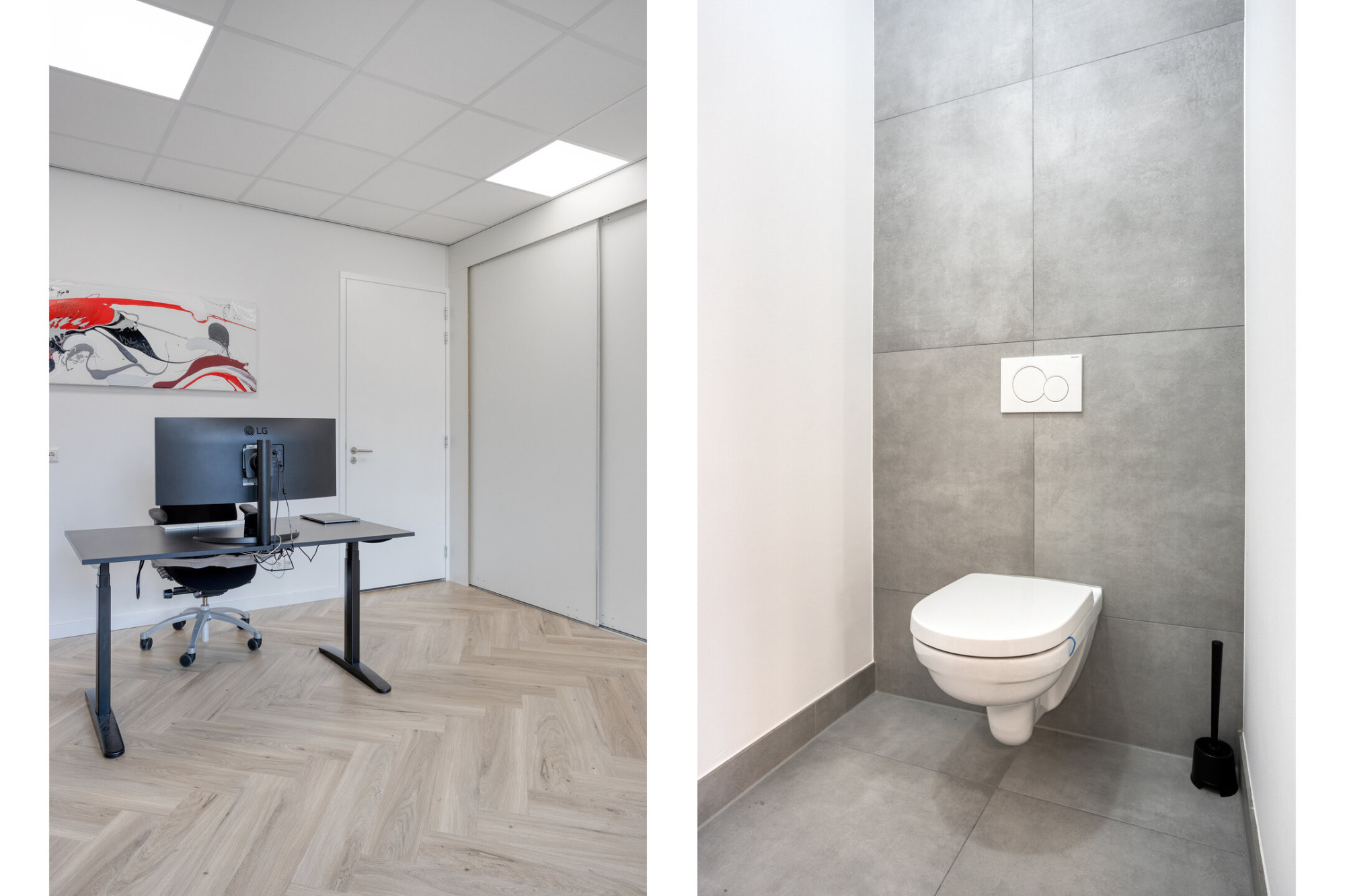 Centrale entree met bellenplateau en brievenbussen. Hier beschikt u over een eigen kantoorruimte of logeerkamer (5.16 x 5.11 m). De visgraat PVC-vloer en de maatwerk kastenwand met geïntegreerd keukenblok creëren een ambiance die uitnodigt tot werken en/of ontspannen. De separate toiletruimte met wandcloset completeert deze zelfstandige multifunctionele ruimte.