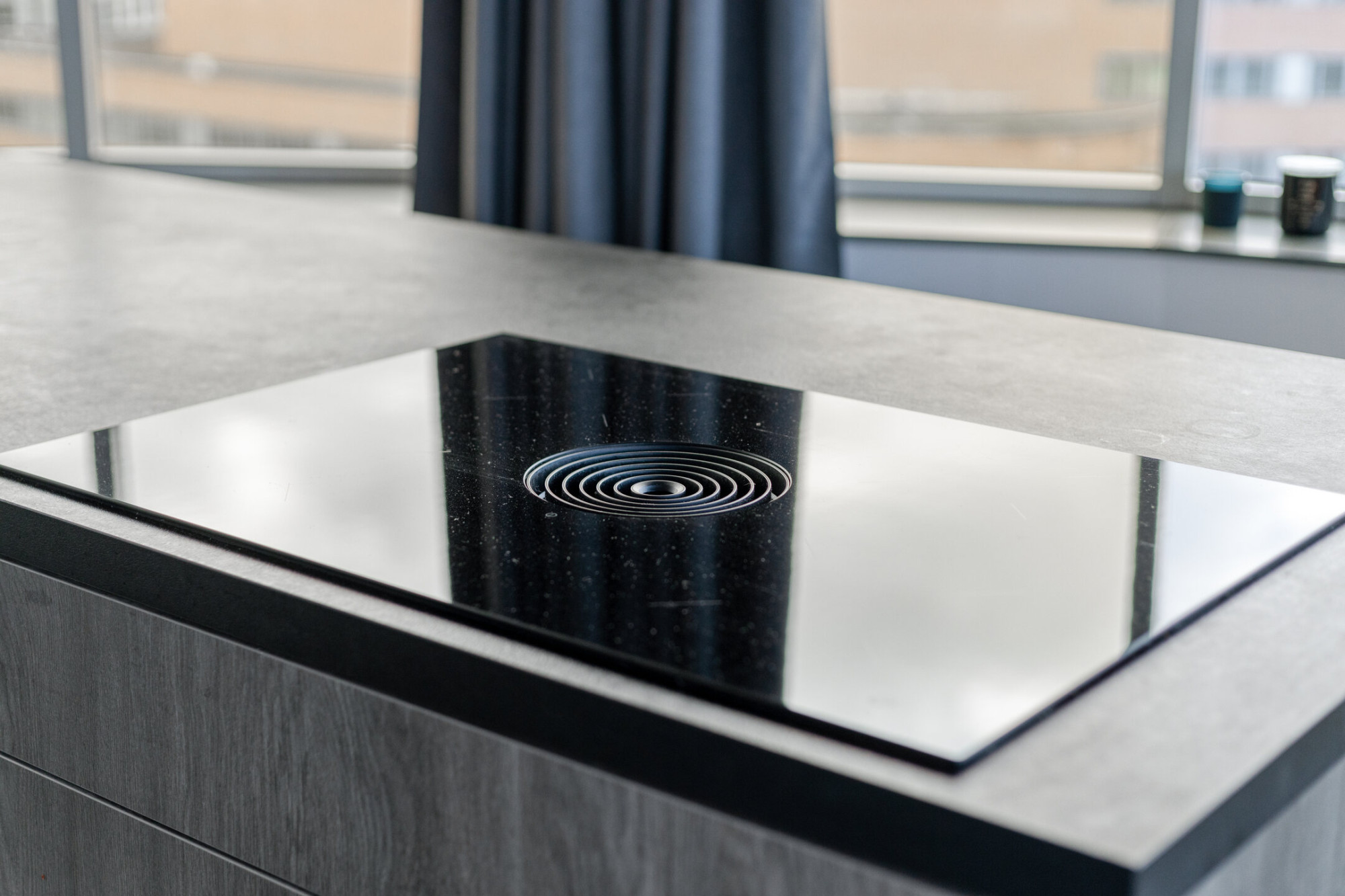 Het riante kookeiland uitgerust met een Bora inductiekookplaat met kookveldafzuiging met separate kastenwand met koelkast, separate vriezer en dubbele heteluchtoven, koken met een panoramisch zicht.