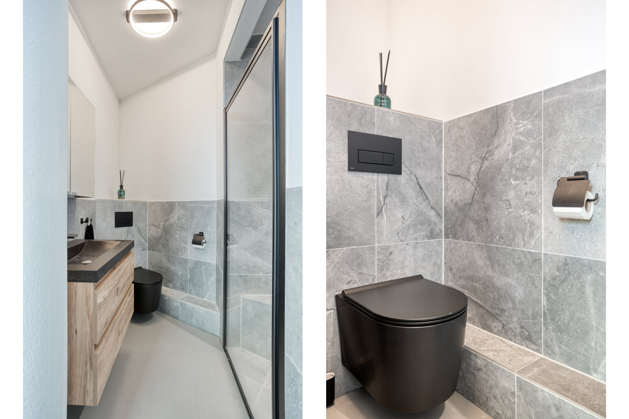 De luxe badkamer voorzien van stijlvol badmeubel met basalt waskom, wandcloset en een ruime inloopregendouche. De slaaphoek, voorzien van een royale inloopkast, vormt een intieme privéruimte binnen de loft.