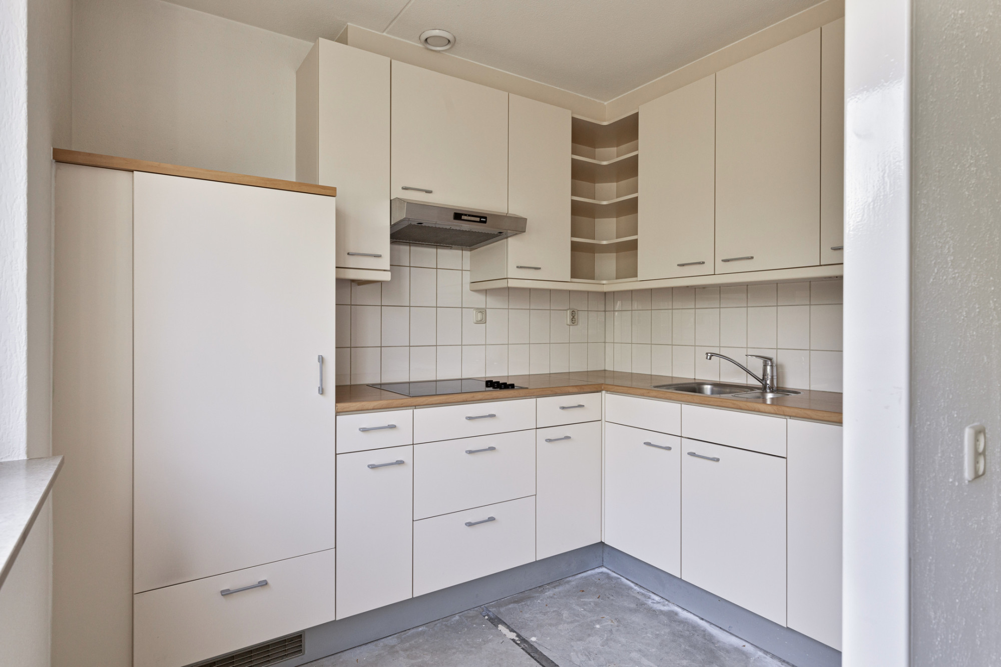 Geheel betegelede badkamer (2.04 x 1.92 m) met inloopdouche en vaste wastafel.