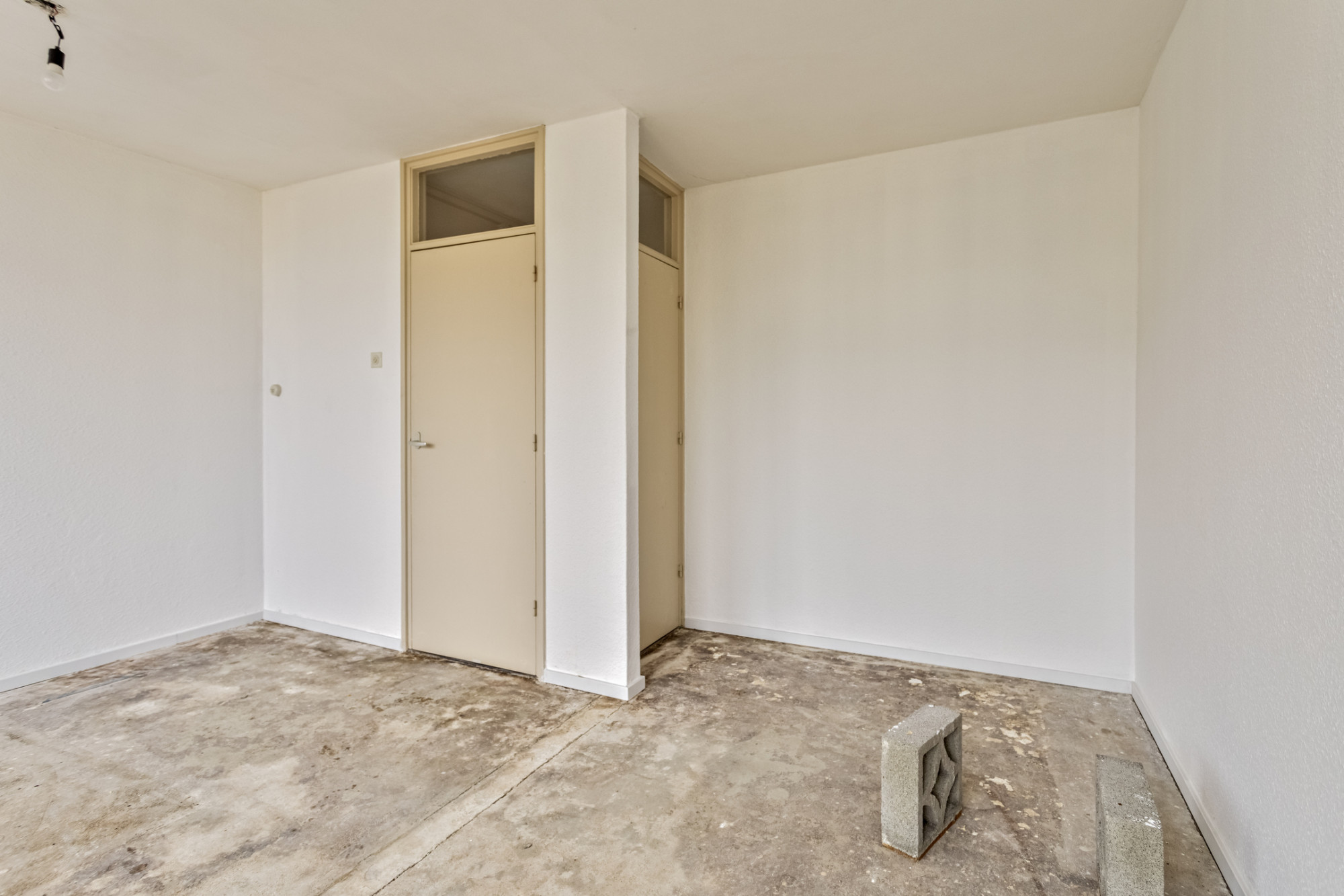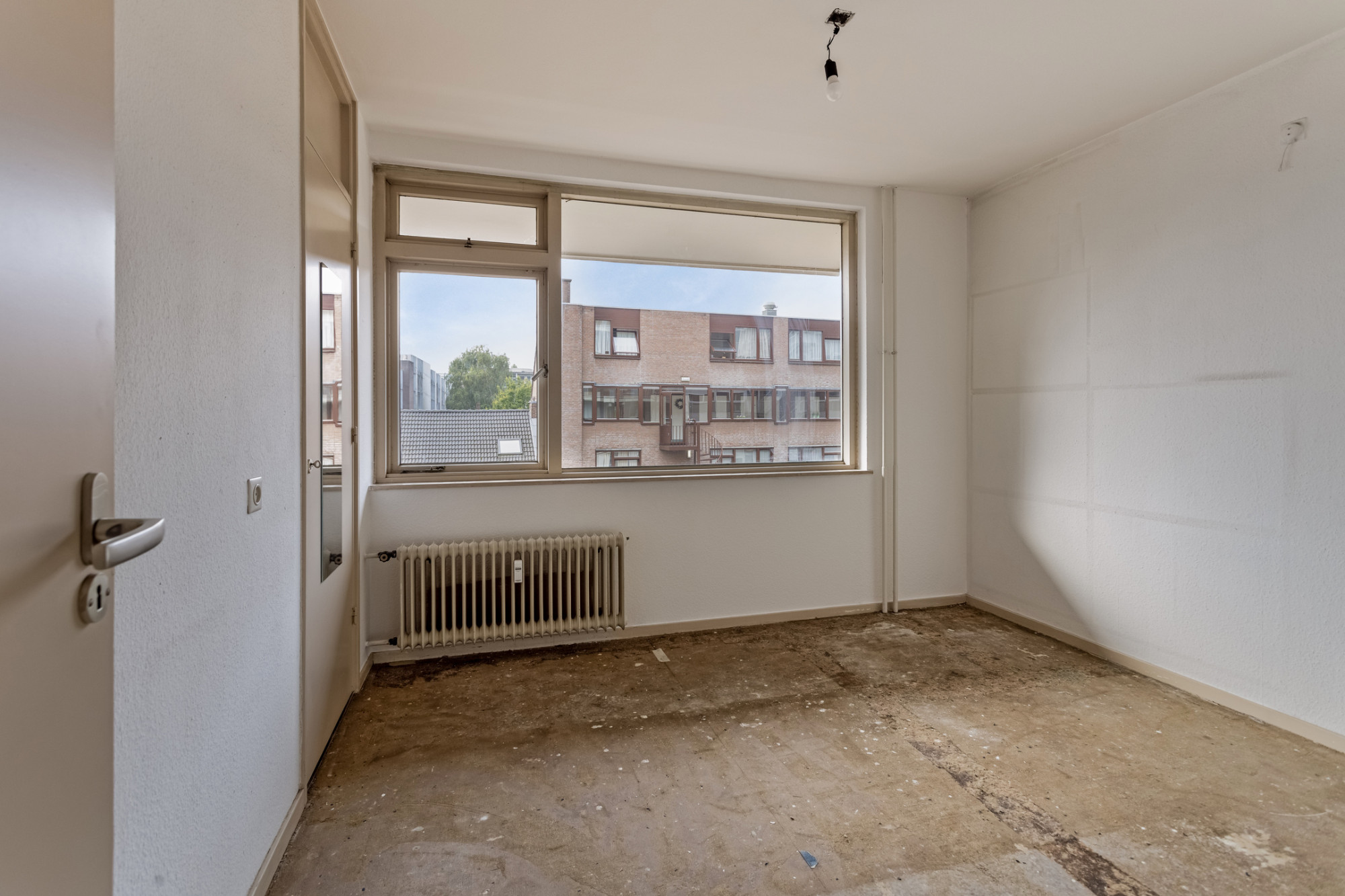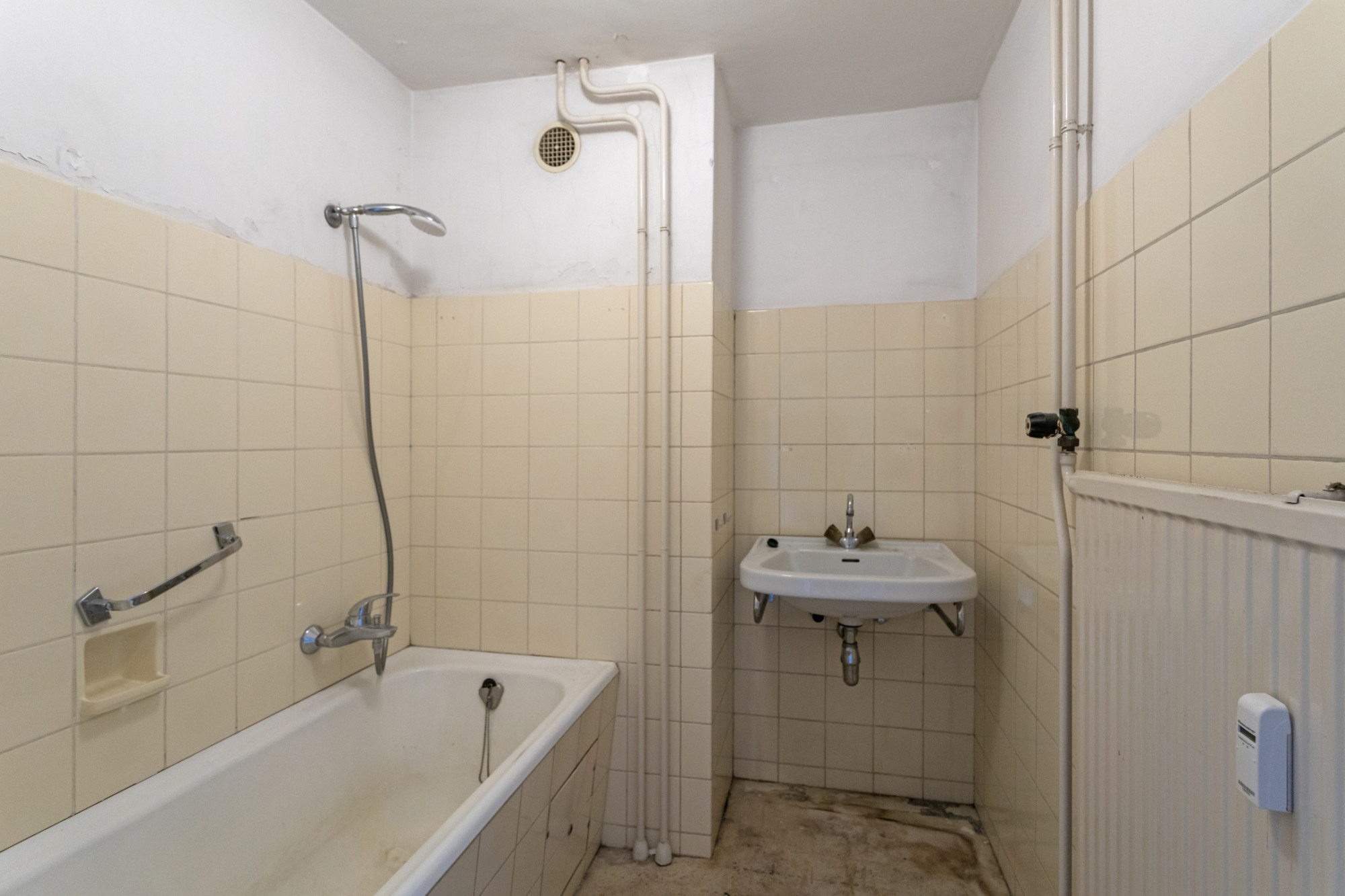 Overloop. 2 slaapkamers in totaal. Slaapkamer achterzijde. 1 slaapkamer aan de voorzijde met toegang naar balkon. Te renoveren badkamer voorzien van vaste wastafel en ligbad.