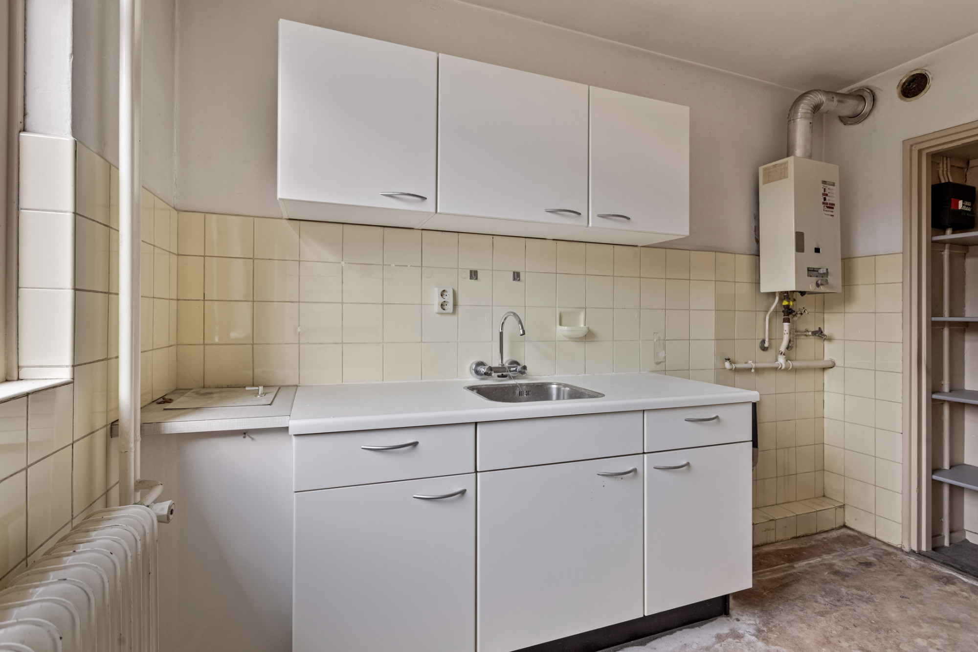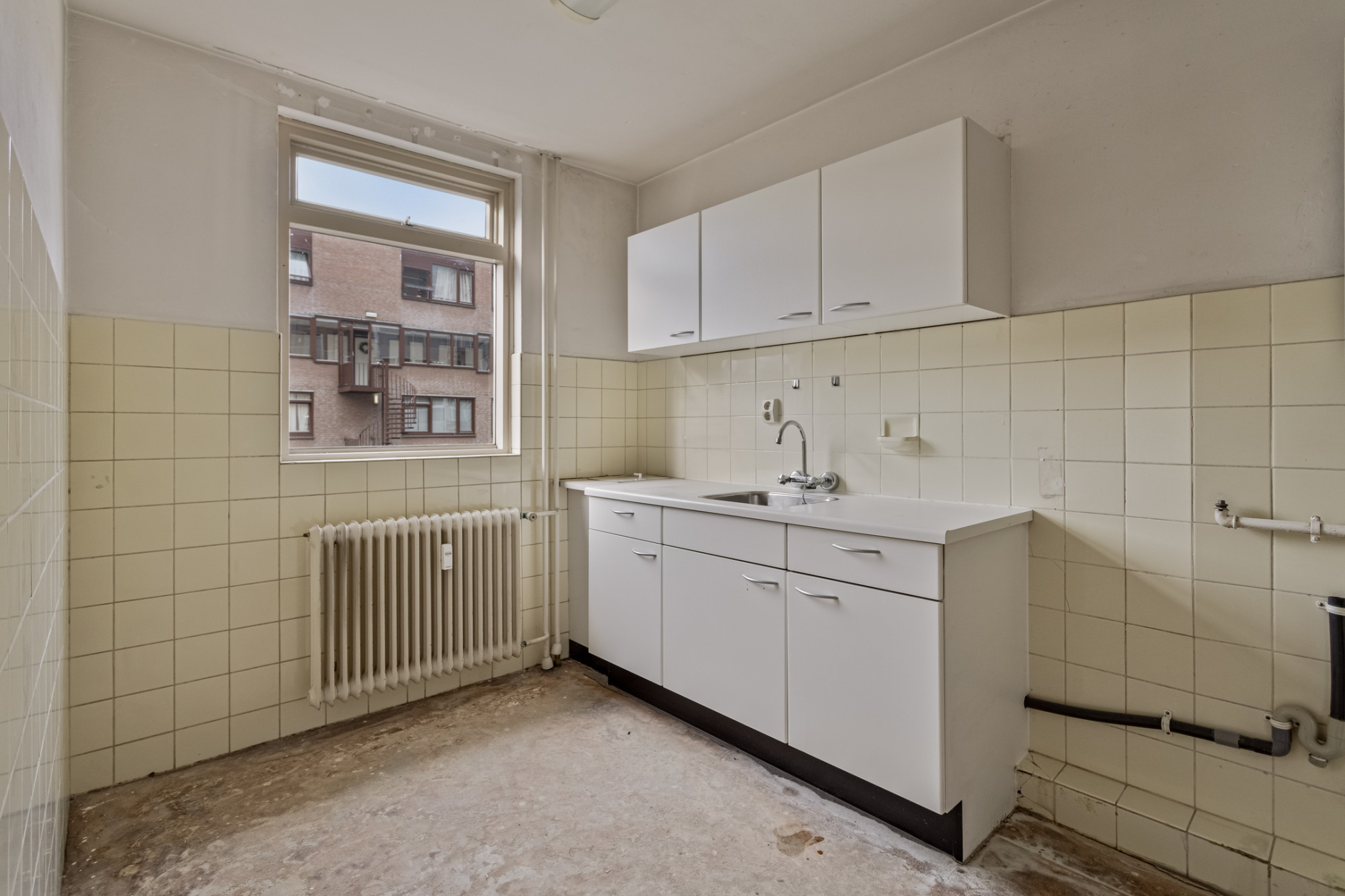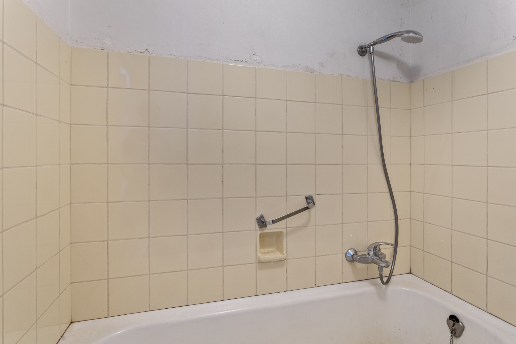 Overloop. 2 slaapkamers in totaal. Slaapkamer achterzijde. 1 slaapkamer aan de voorzijde met toegang naar balkon. Te renoveren badkamer voorzien van vaste wastafel en ligbad.