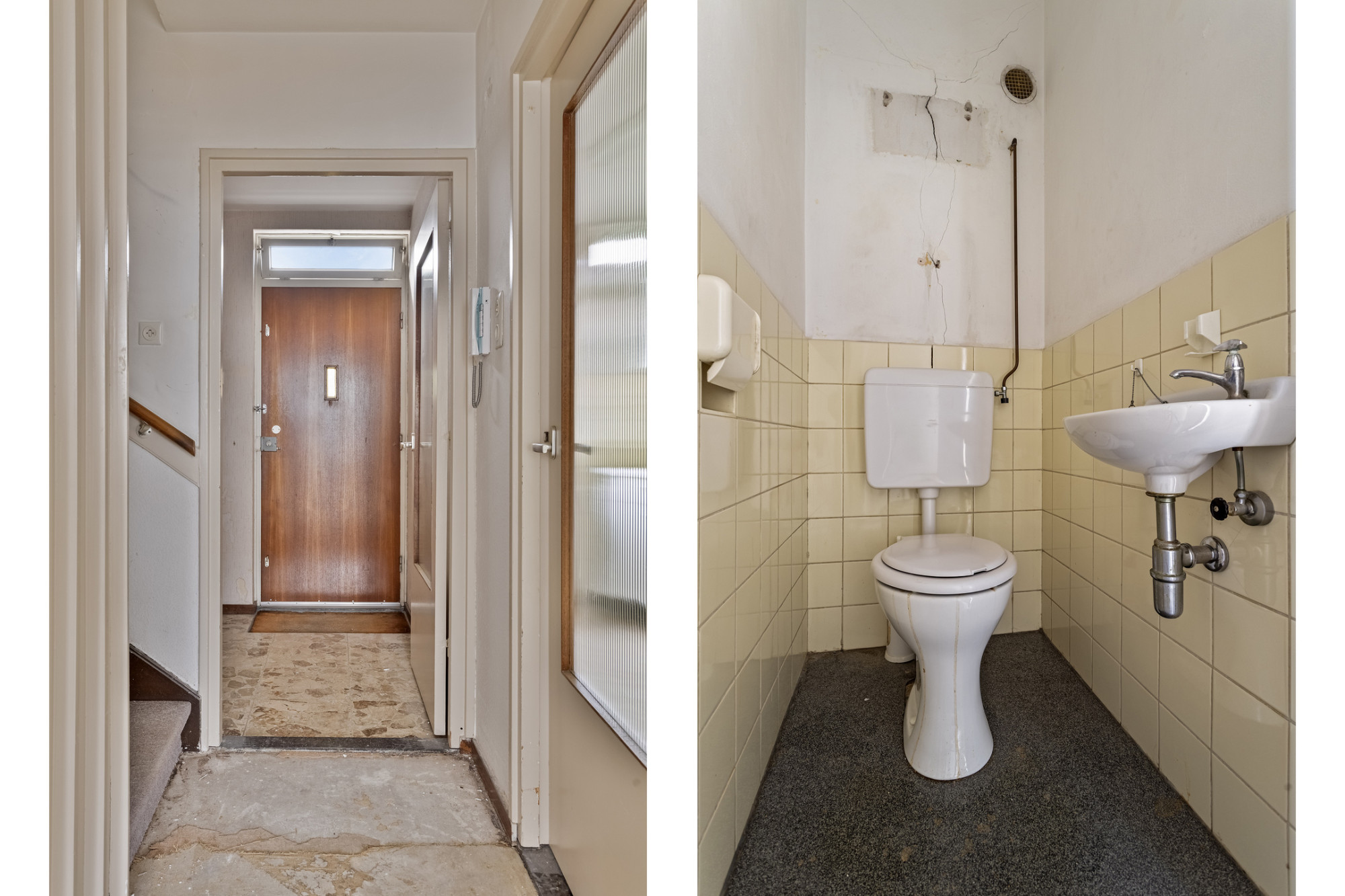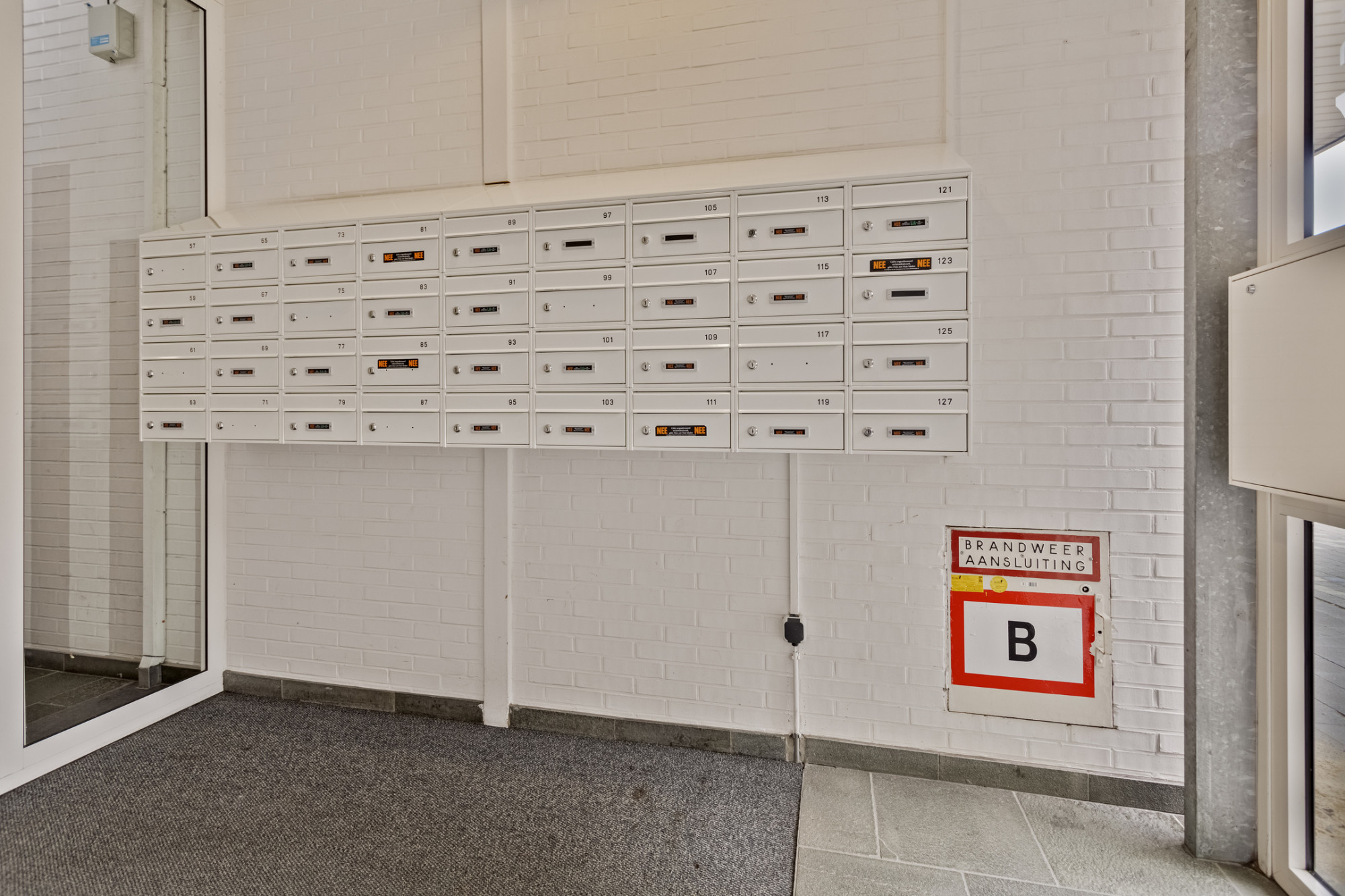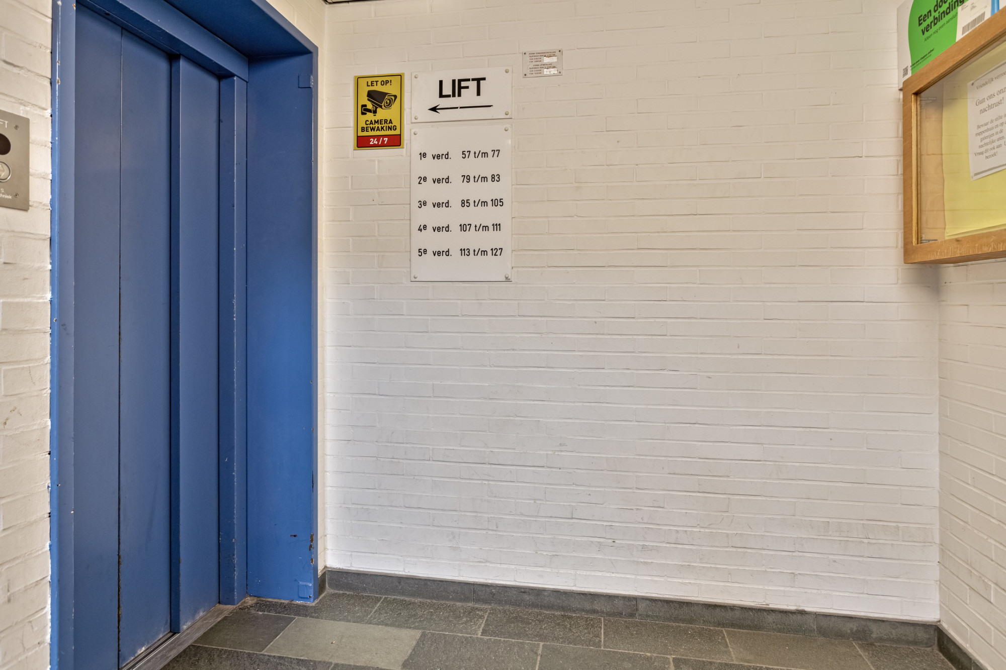 Bellentableau, entree met brievenbussen, hal met lift en trappenhuis naar verdiepingen.