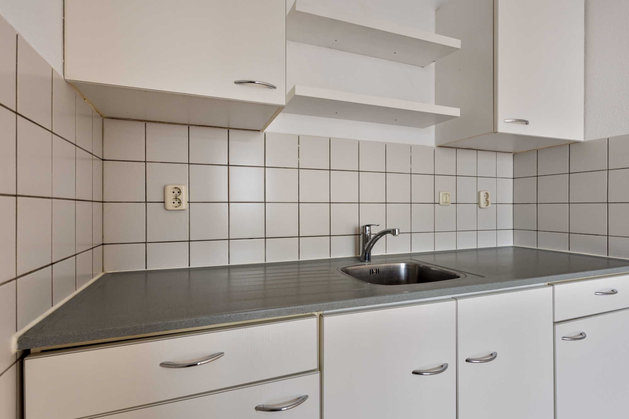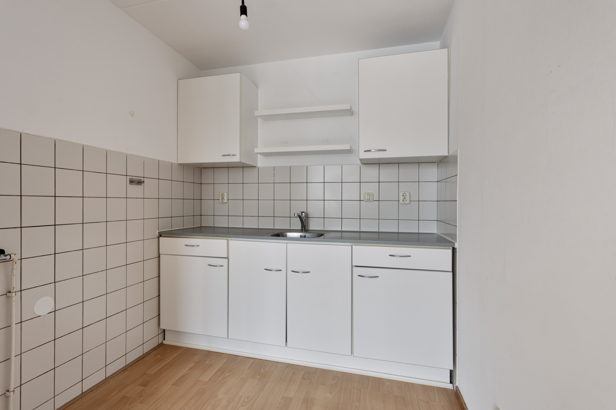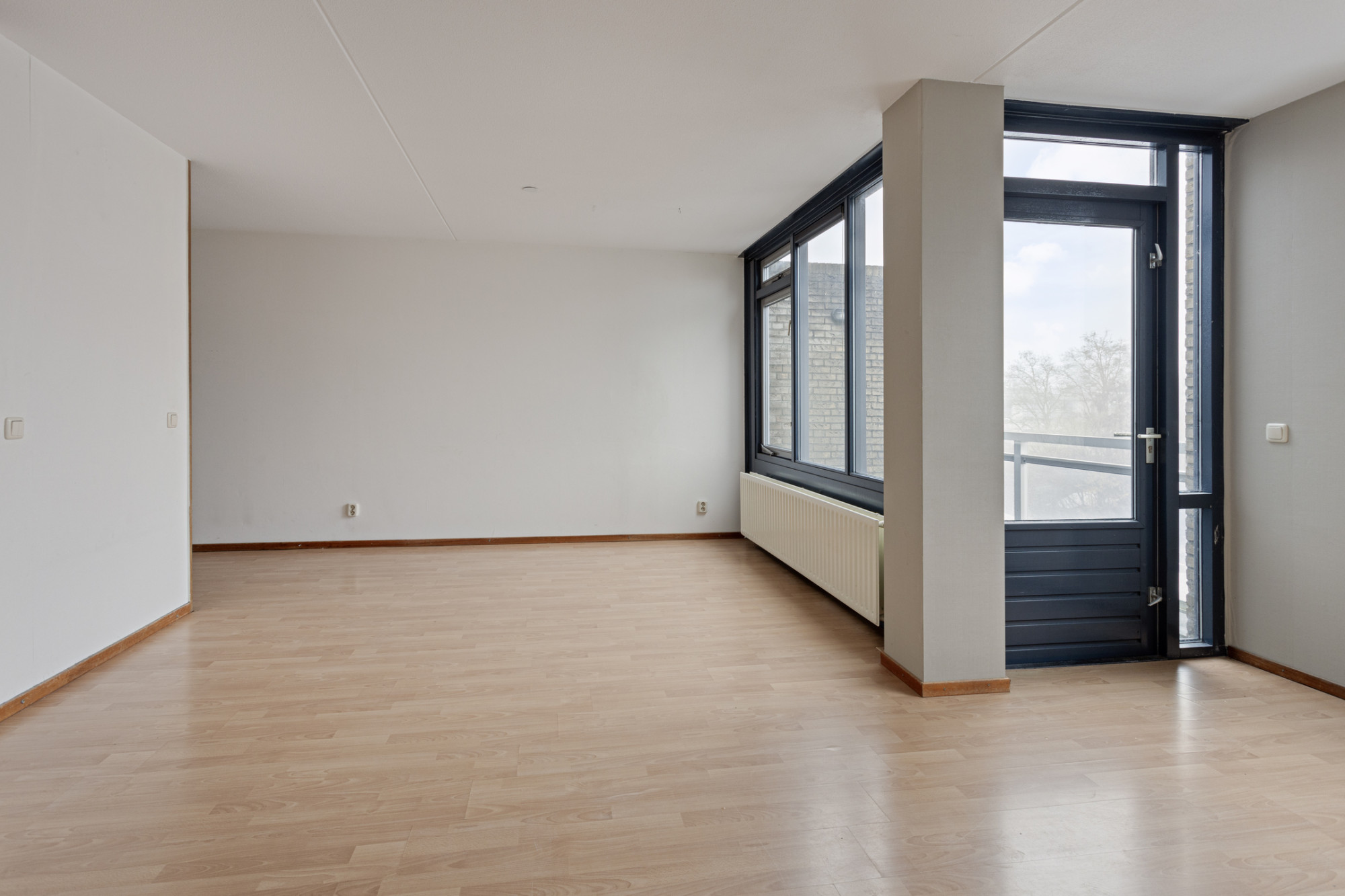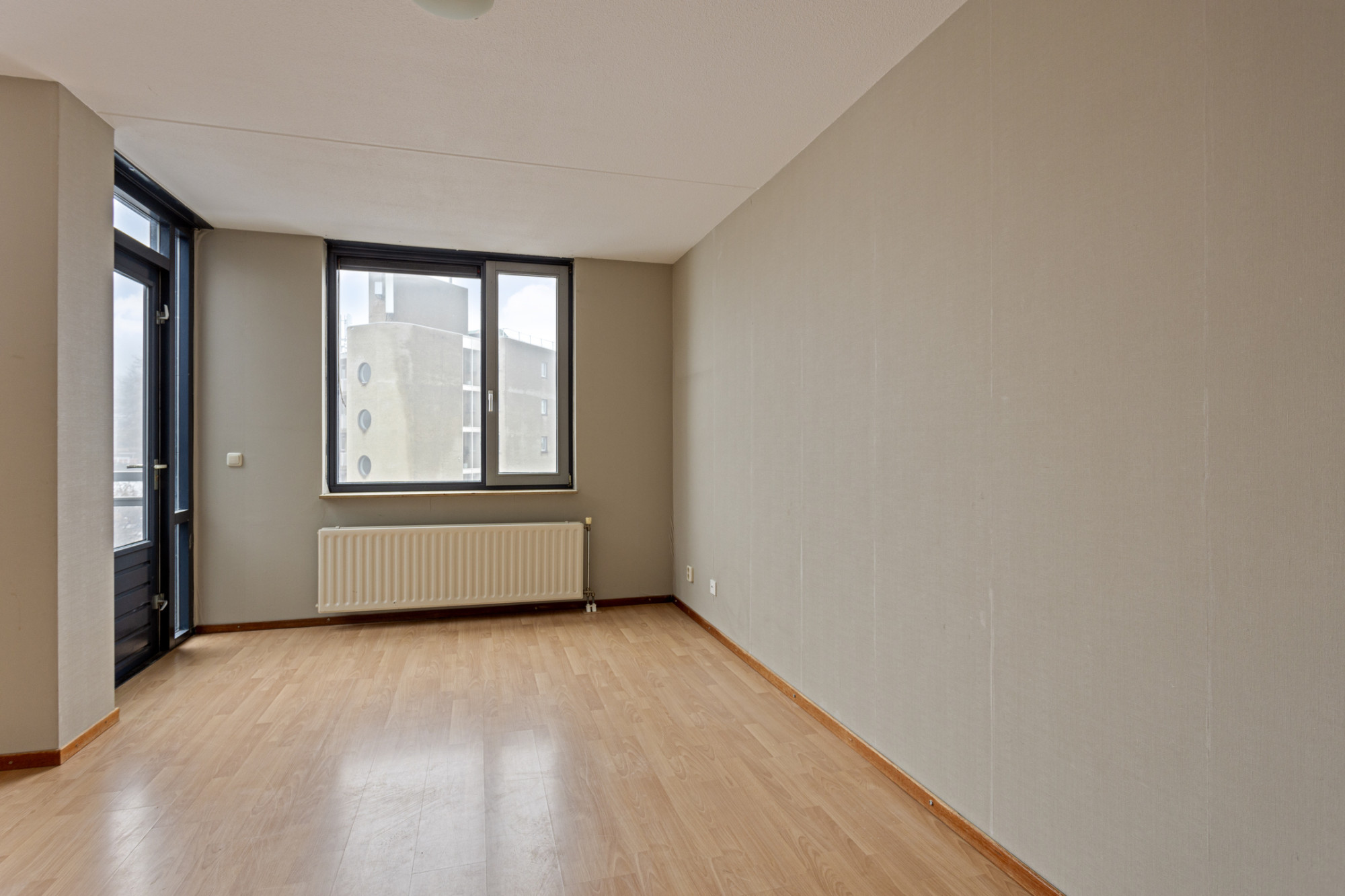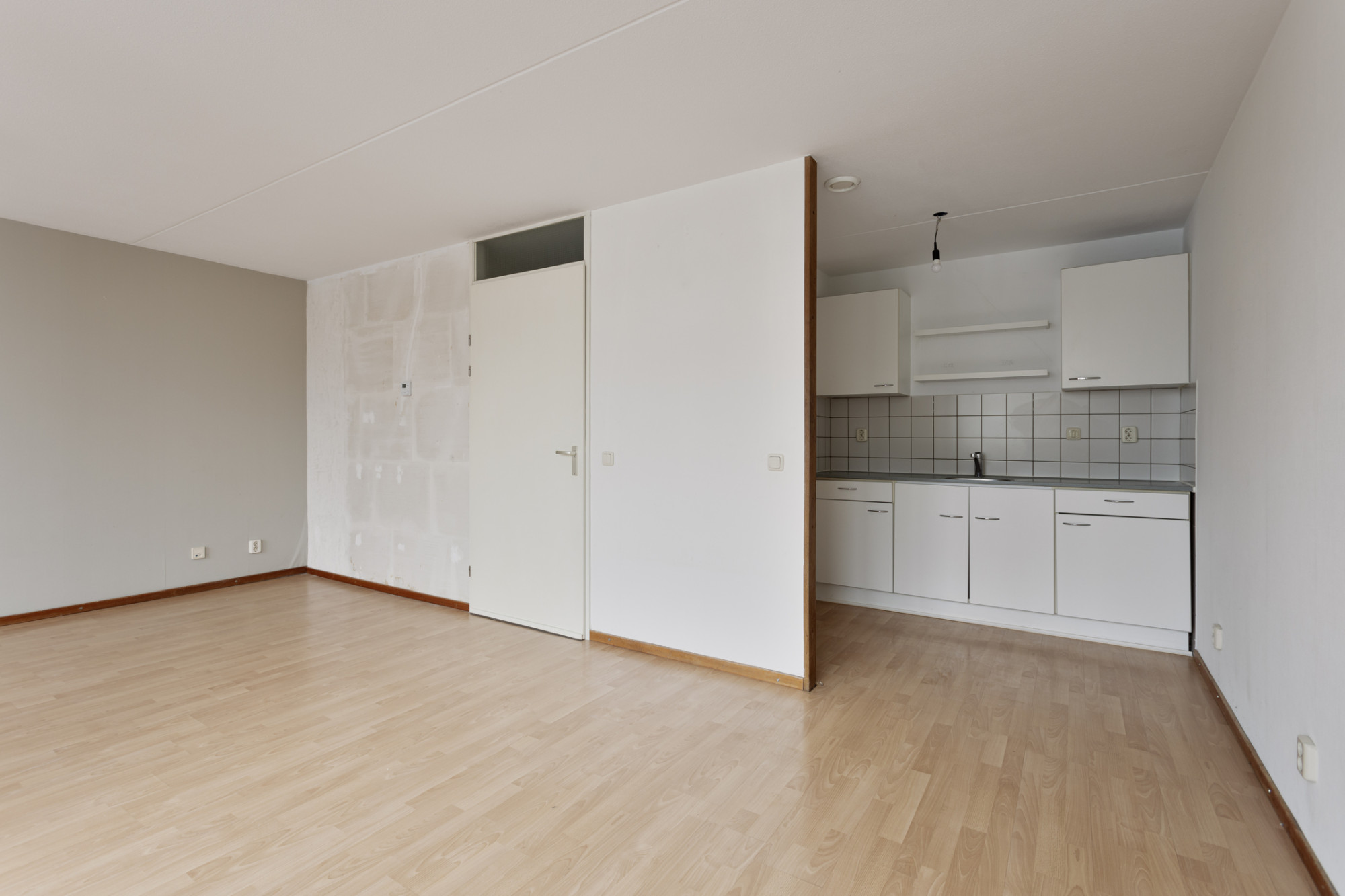 Woonkamer in open verbind met keuken met eenvoudige keukeninstallatie; vanuit de woonkamer toegang tot het zonnig gelegen balkon (2.71 x 1.57 m).