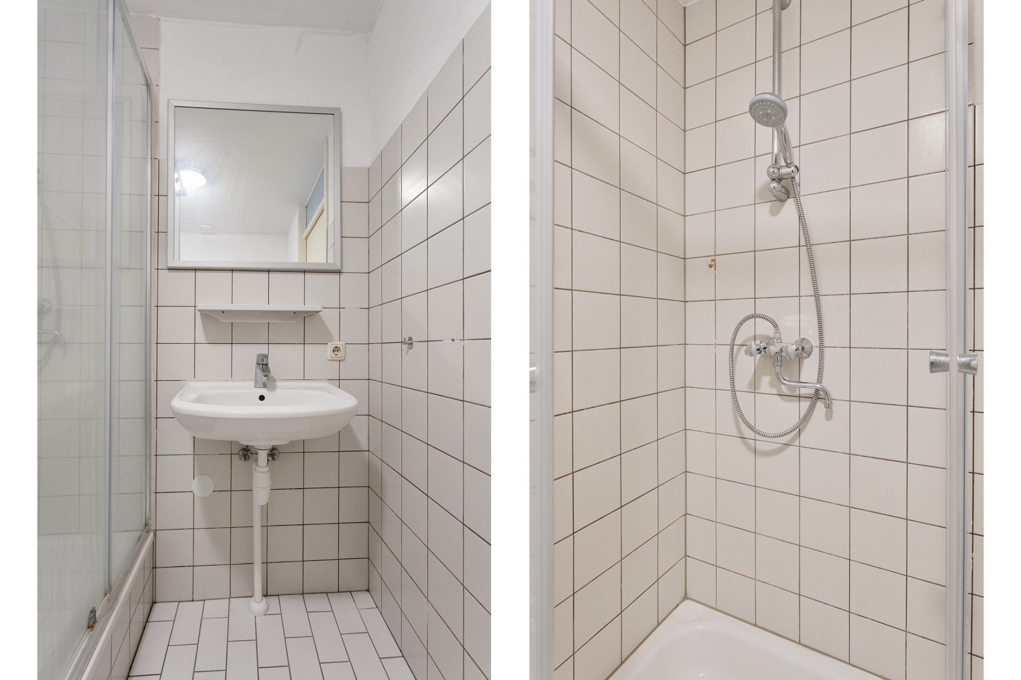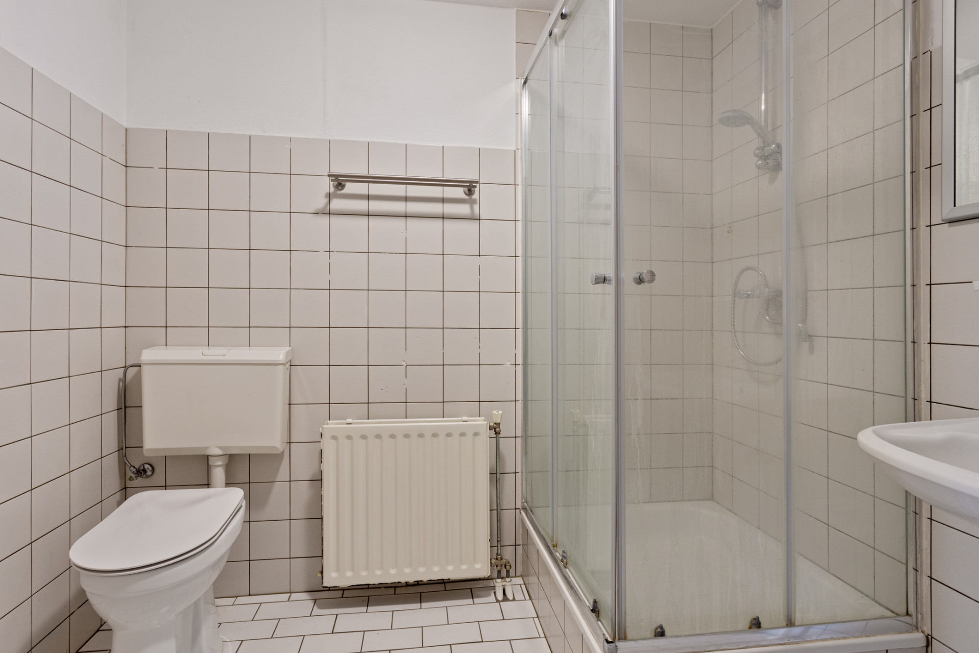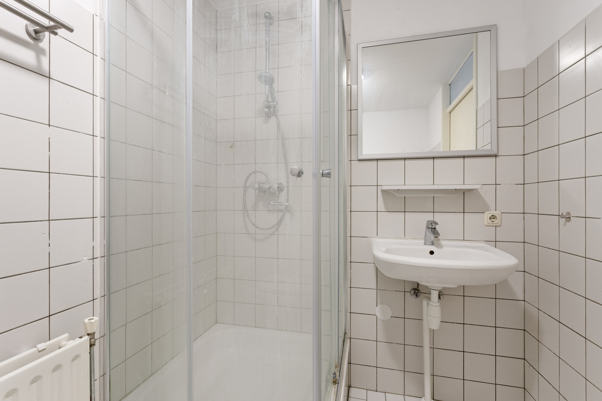Badkamer (2.42 x 1.79 m) met douche, vaste wastafel, toilet en witgoed aansluiting.