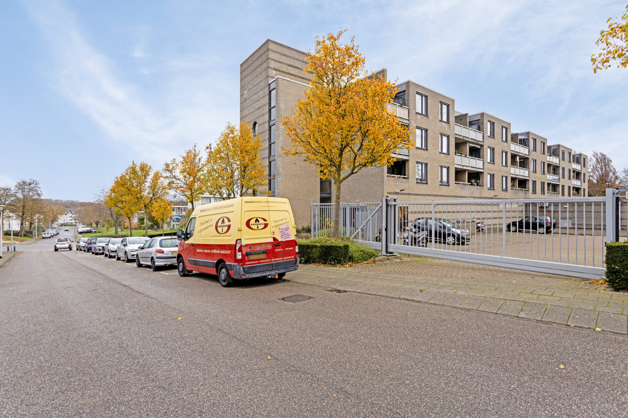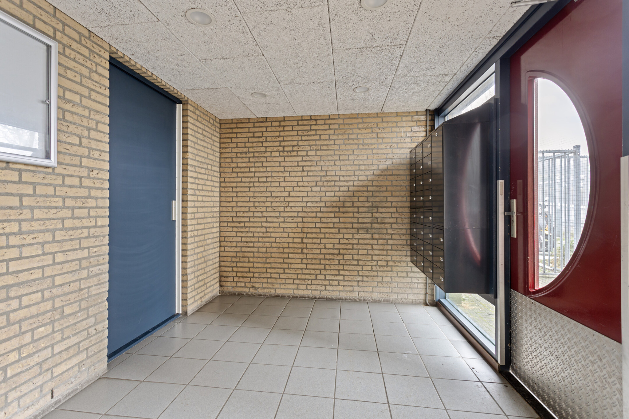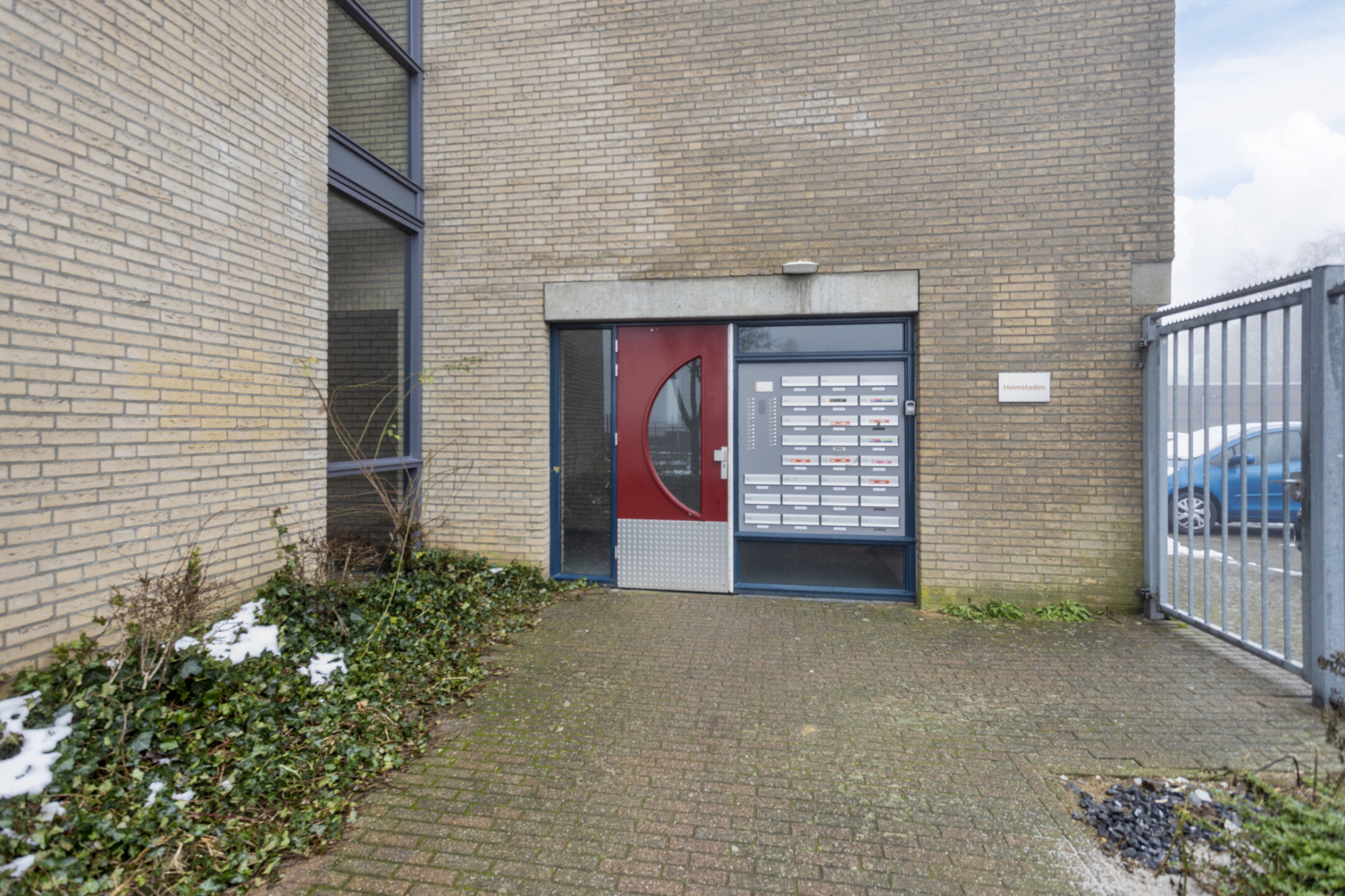 Centrale entreehal met brievenbussen, bellentableau, intercominstallatie, trappenhuis en liftinstallatie; parkeerplaats op afgesloten parkeerterrein.
