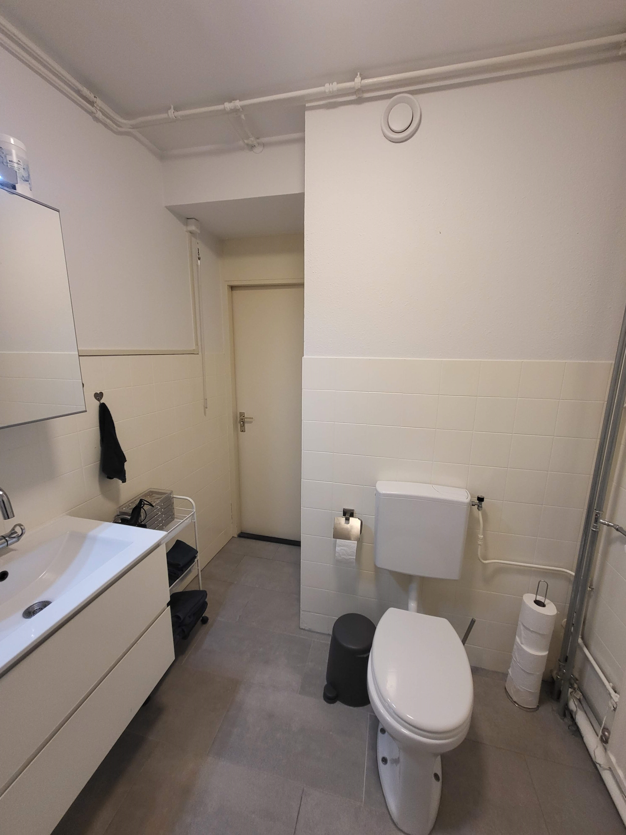 Badkamer welke is voorzien van een toilet, wastafelmeubel, douche en de witgoedaansluiting.