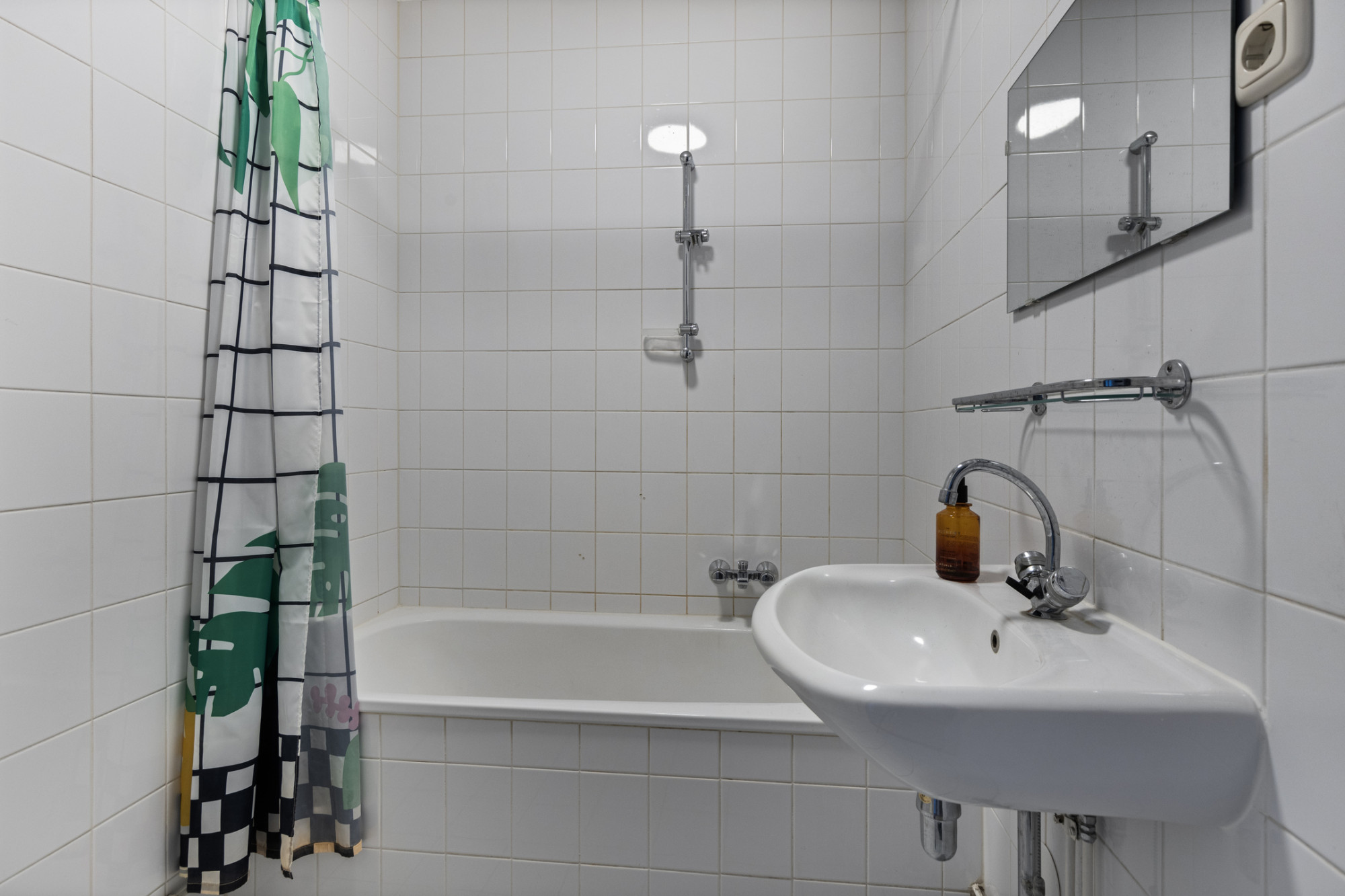 Geheel betegelde badkamer (2.07 x 1.68 m) met douche, vaste wastafel en aansluiting voor wasautomaat.