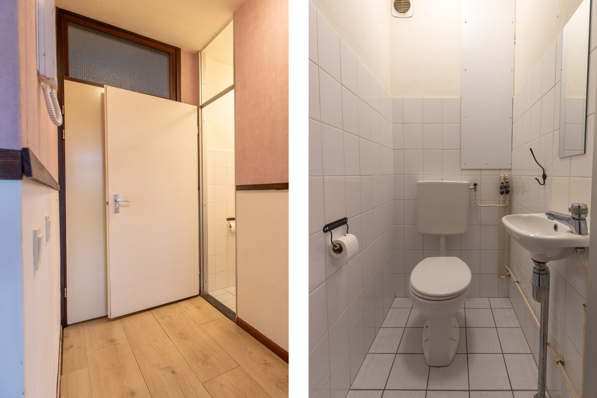 Deels betegelde closetruimte met duo closet en fonteintje.