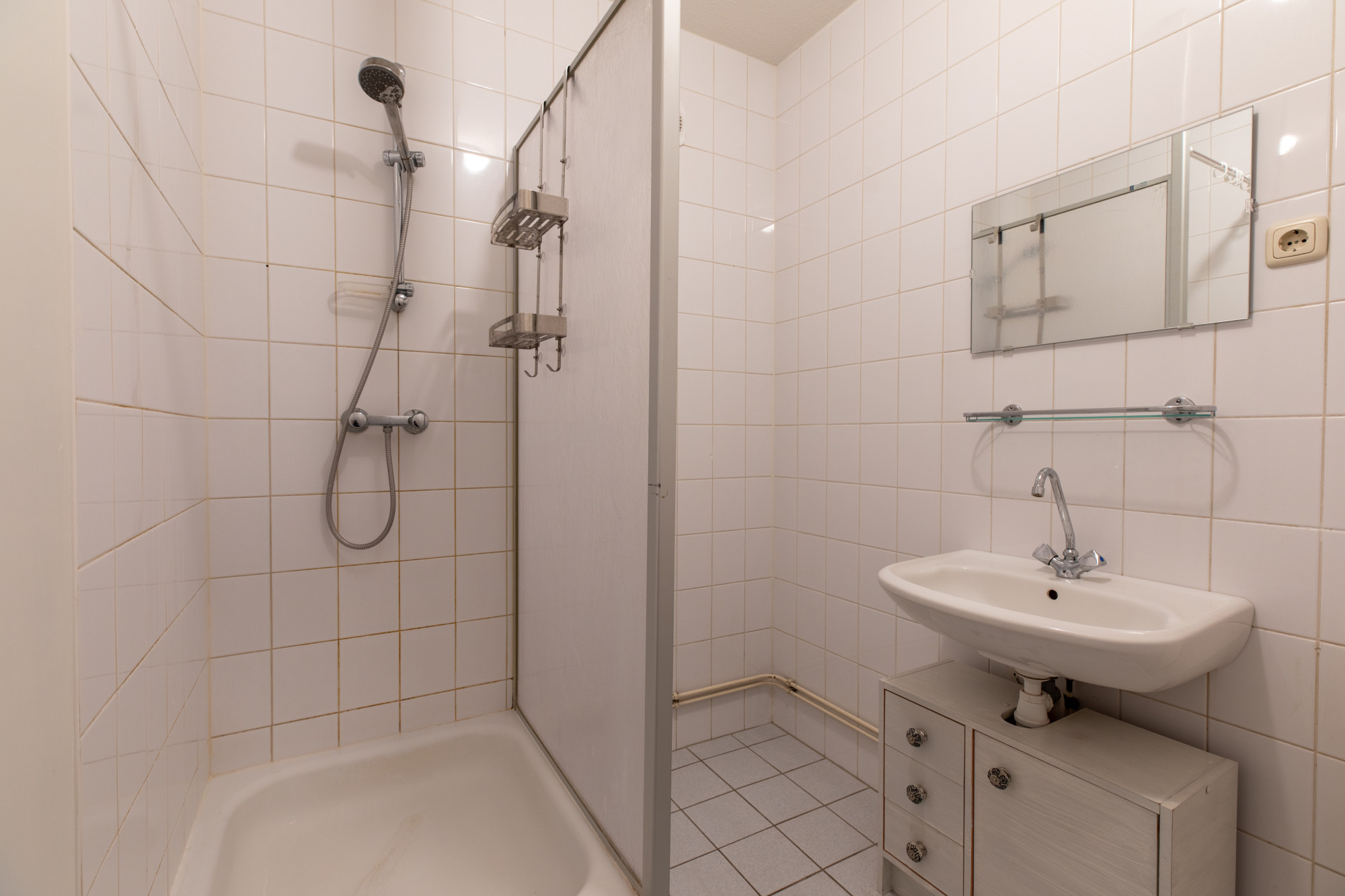 Geheel betegelde badkamer (2.42 x 1.79 m) met douche, vaste wastafel en aansluiting voor wasautomaat.