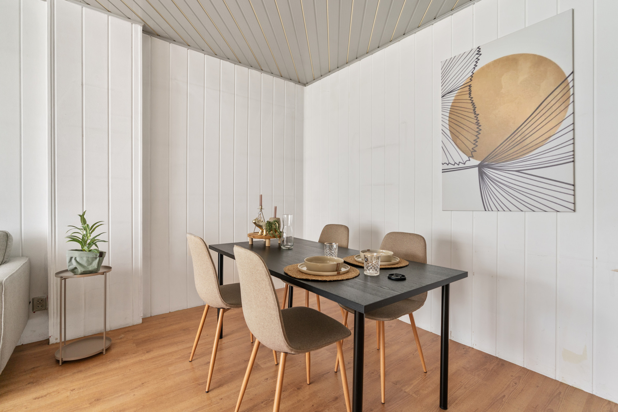 De keuken is uitgerust met een hoekopstelling en biedt directe toegang tot de kelder. Vanuit de keuken loopt u door naar een gang, die leidt naar de betegelde badkamer en de achtertuin.