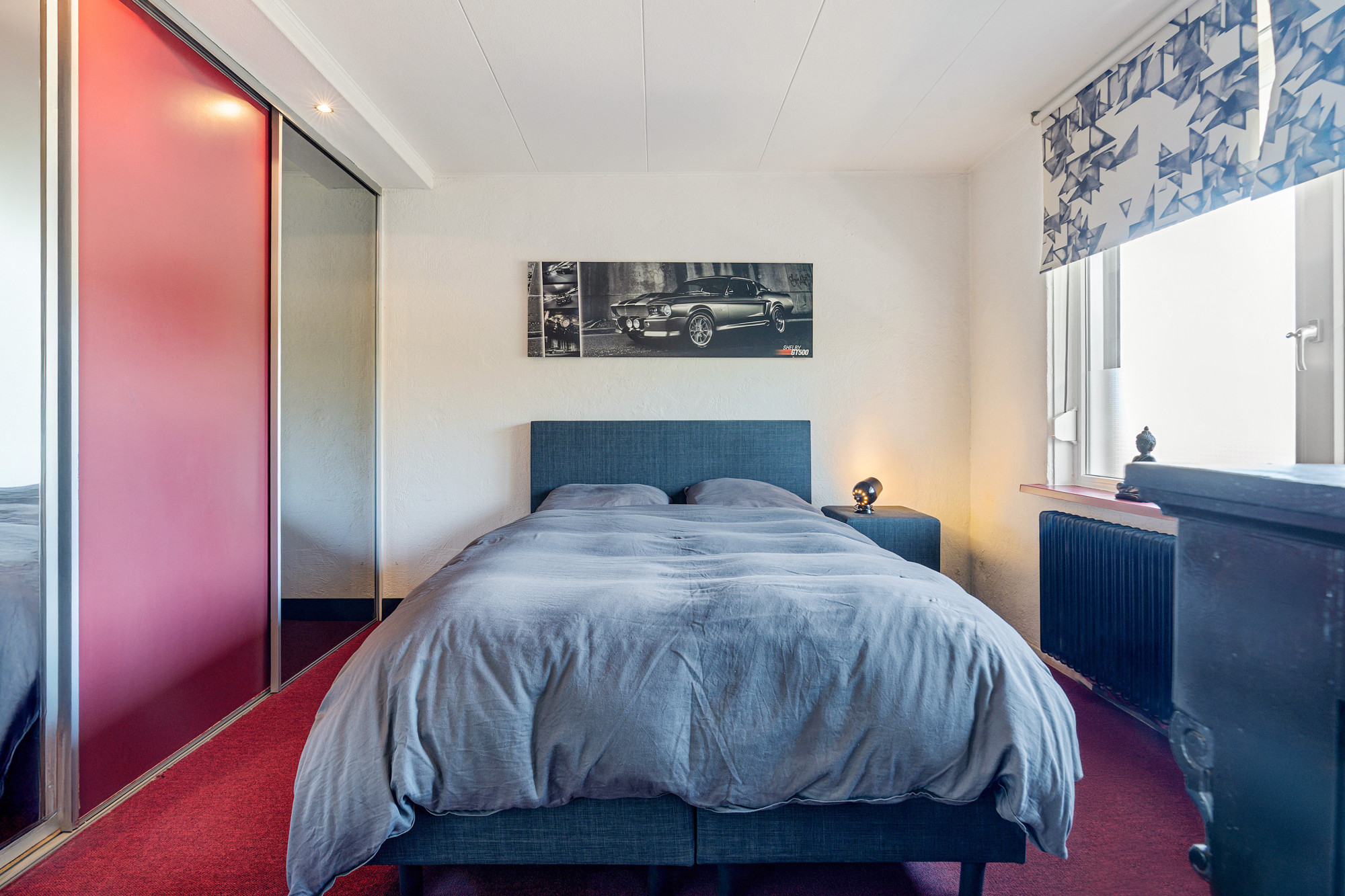 De slaapkamer beschikt over vloerbedekking, een ingebouwde kast en een handmatig rolluik. Hier heeft u uitzicht op de achterzijde van het complex.
