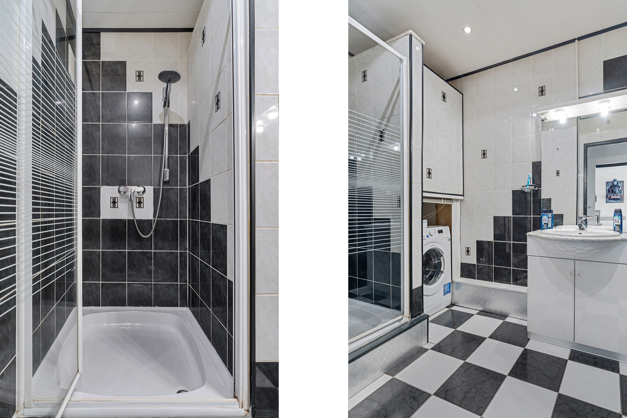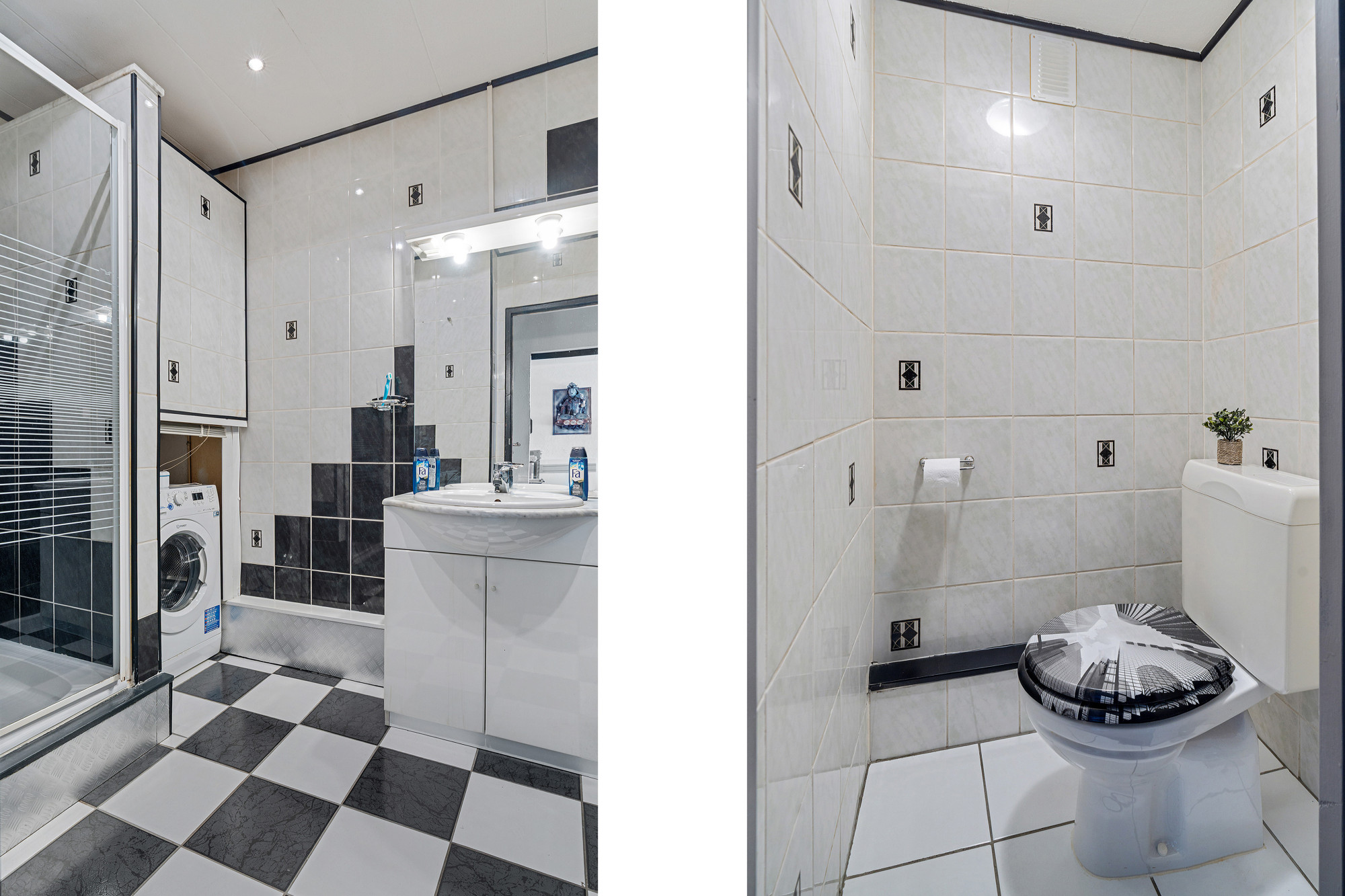 De badkamer is volledig betegeld en voorzien van een wastafel met meubel, douche en witgoedaansluiting. Separaat vindt u het eveneens volledig betegelde toilet.