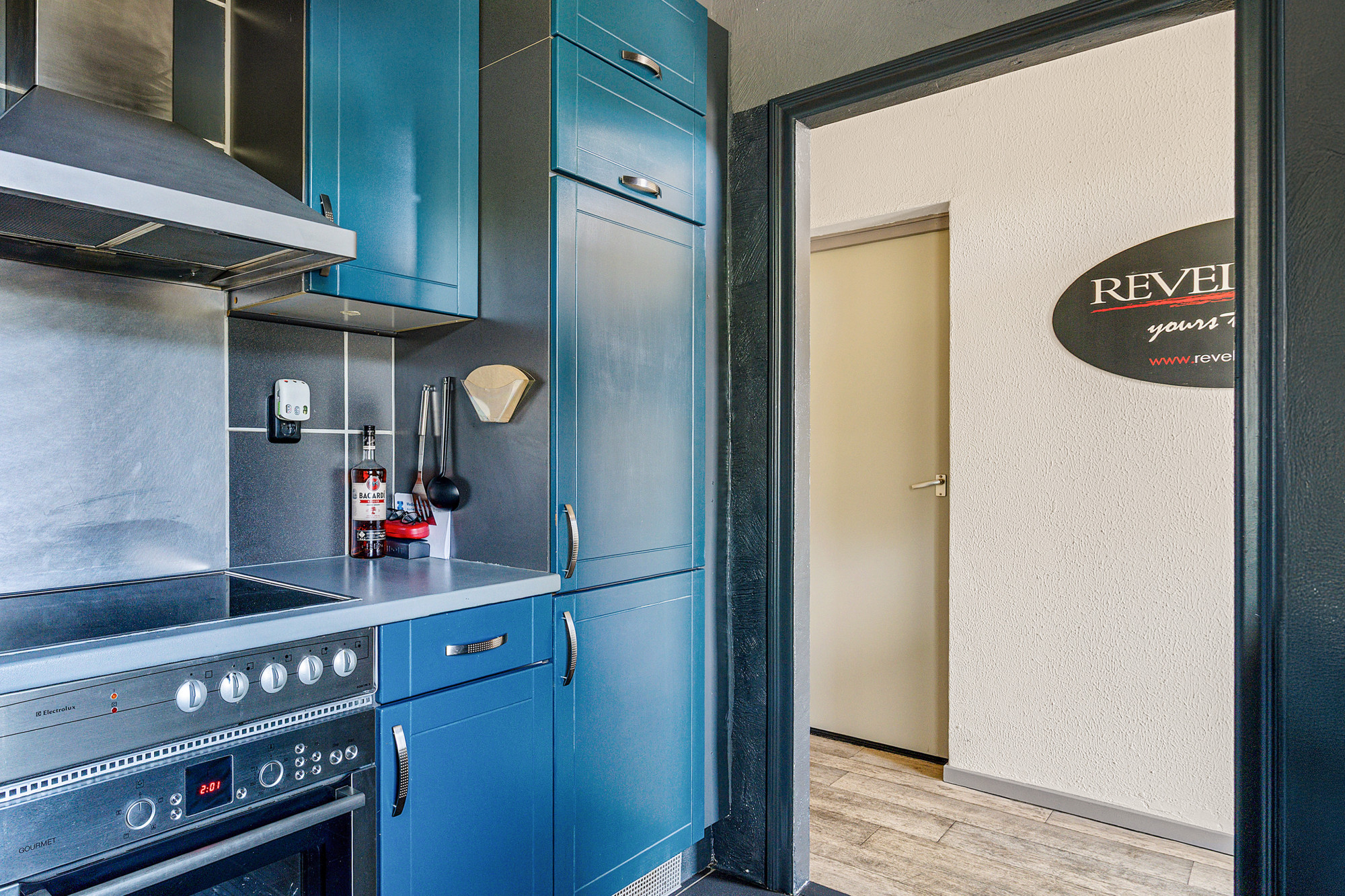 Aan de linkerkant bevindt zich de betegelde keuken, uitgerust met een wasbak, oven, 4-pits inductiekookplaat, afzuigkap, koelkast en zowel boven- als onderkasten. Ook is er een aansluiting voor een vriezer aanwezig. De keuken beschikt over een handmatig rolluik.