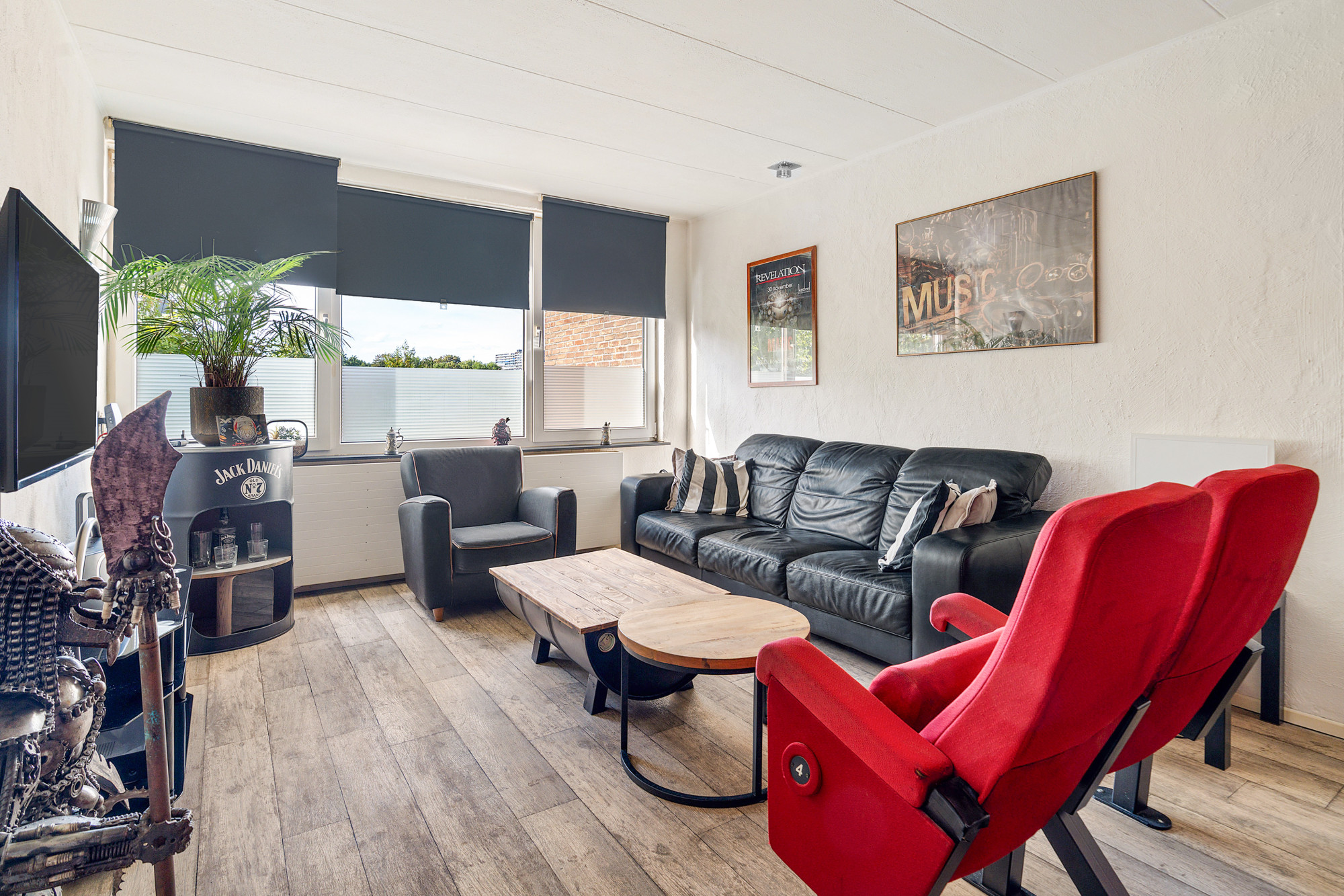 Rechts van de hal vindt u de lichte woonkamer, eveneens voorzien van een laminaatvloer, monoblock airco en uitzicht op de Markt.