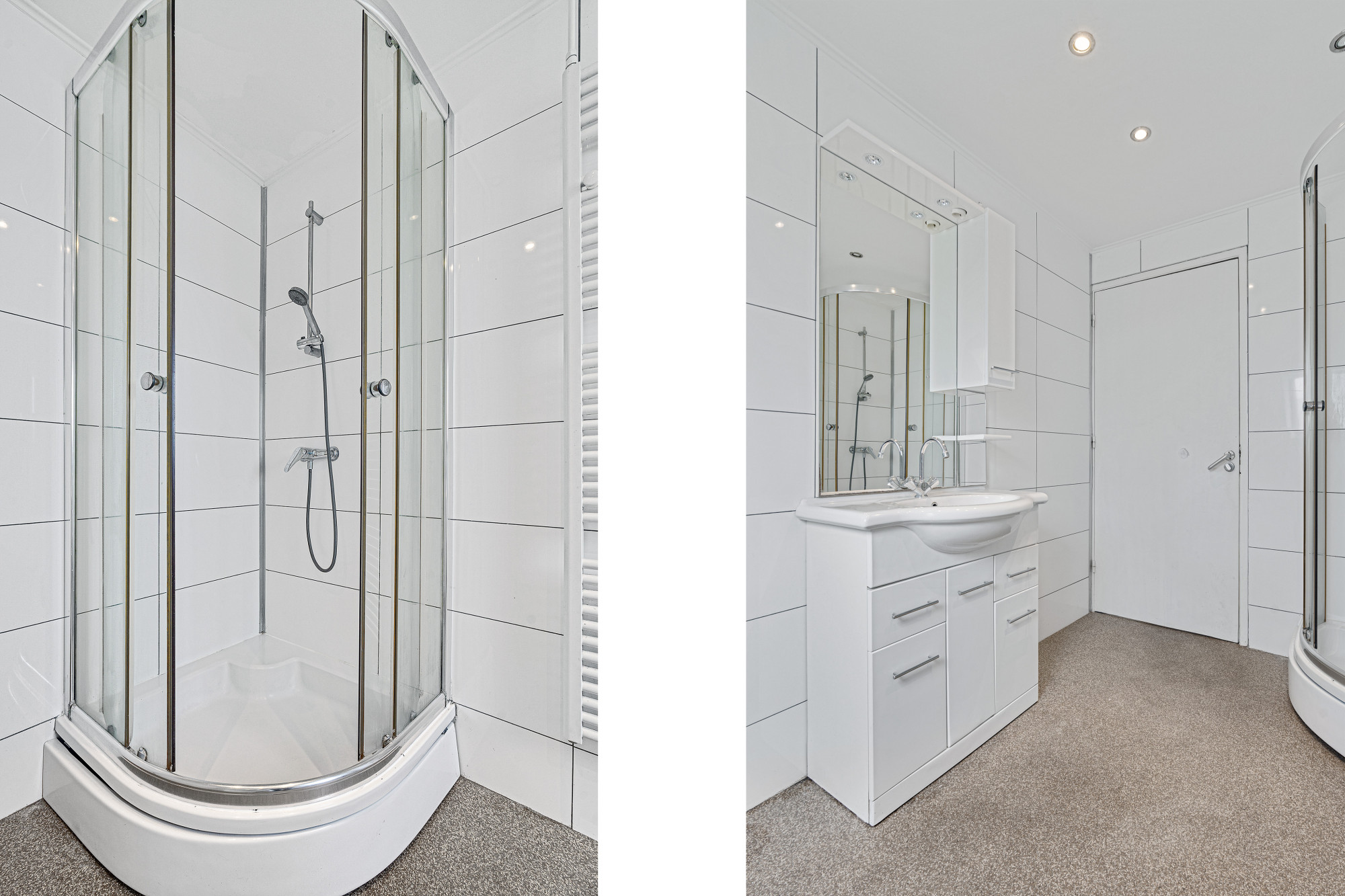 De badkamer is afgewerkt met een gesealde grindvloer en beschikt over een douchecabine, toilet, wastafel met meubel, designradiator, witgoedaansluitingen en een dakraam. De hal geeft verder toegang tot de trap richting de bovenste verdieping en de meterkast.