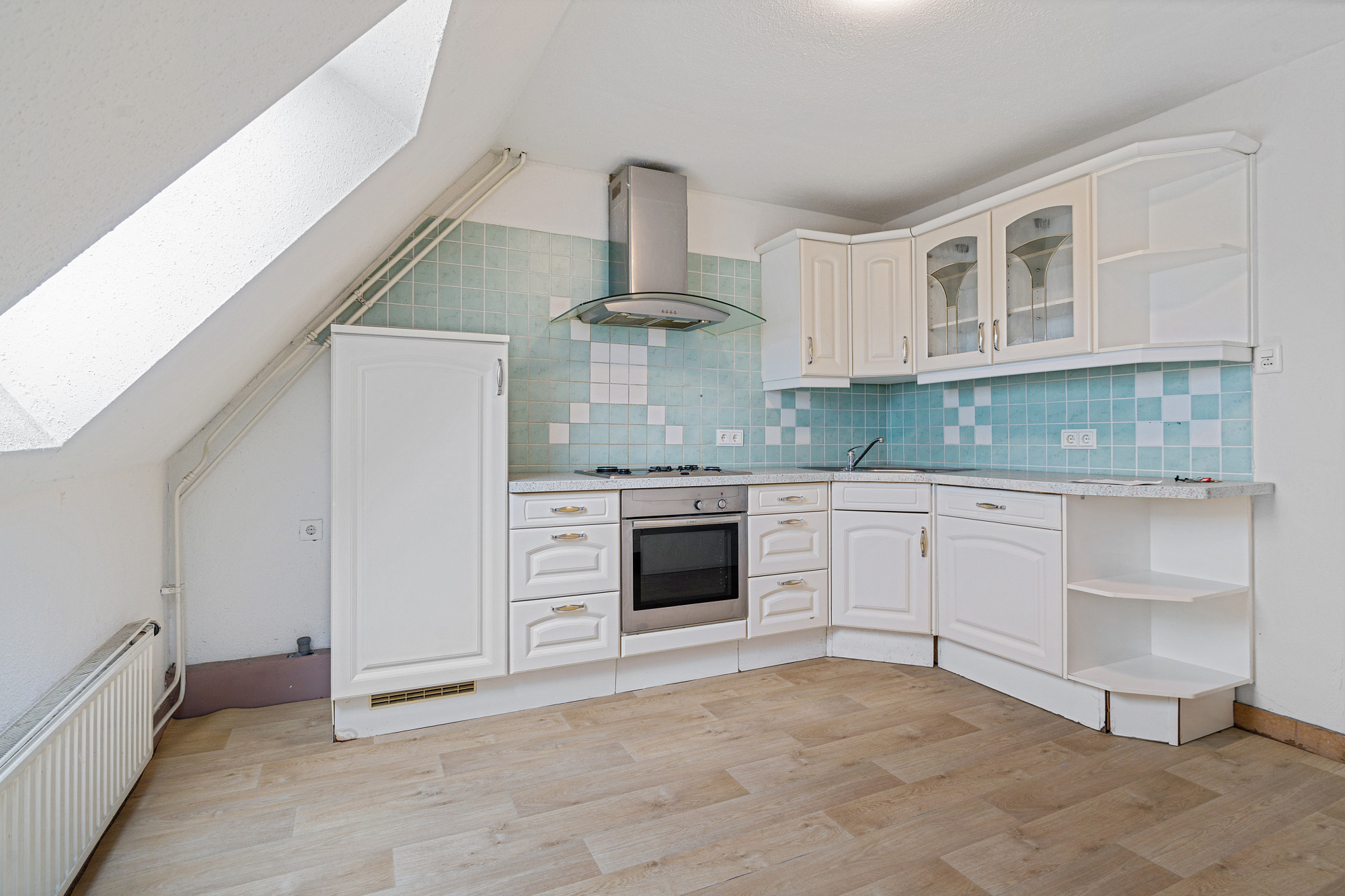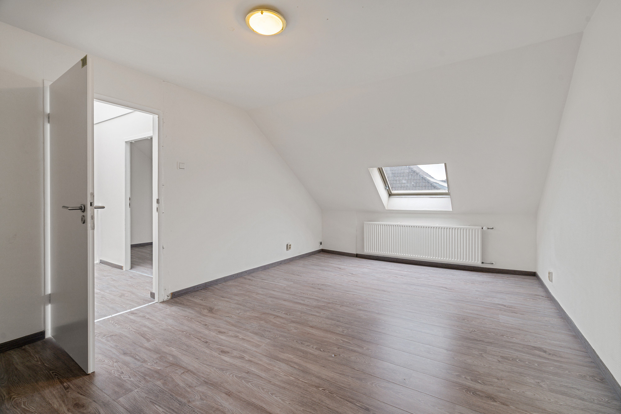 Via de vaste trap bereik je de overloop, waar een grote openslaande lichtkoepel voor aangename natuurlijke verlichting zorgt. Vanuit hier heb je toegang tot twee slaapkamers en de cv-ruimte. Beide slaapkamers zijn voorzien van een laminaatvloer en een dakraam, wat zorgt voor een lichte en frisse uitstraling.