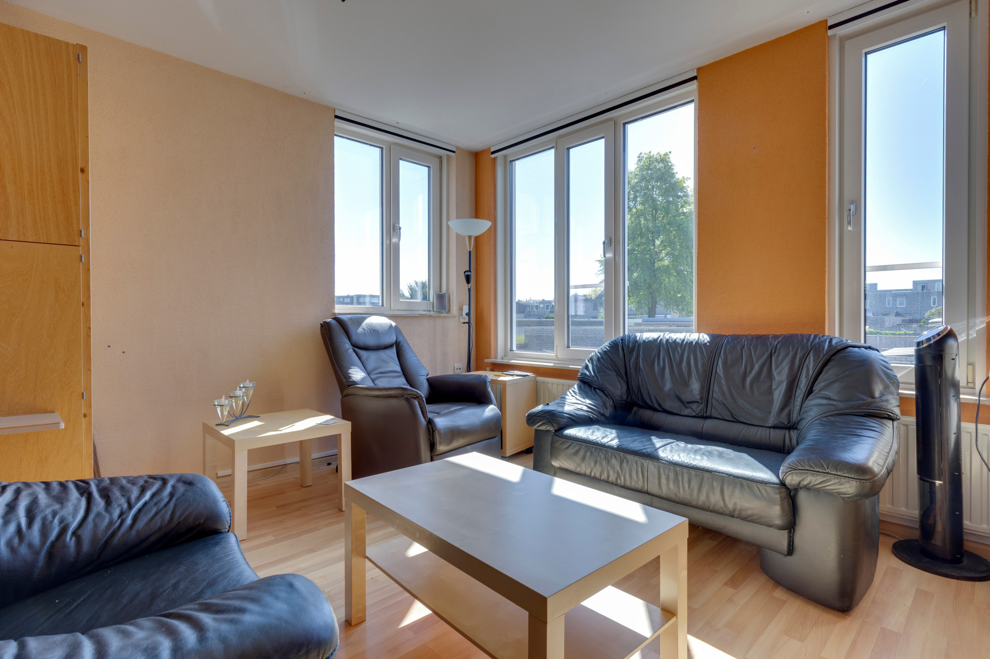 Ruime doorzon woonkamer met laminaatvloer.