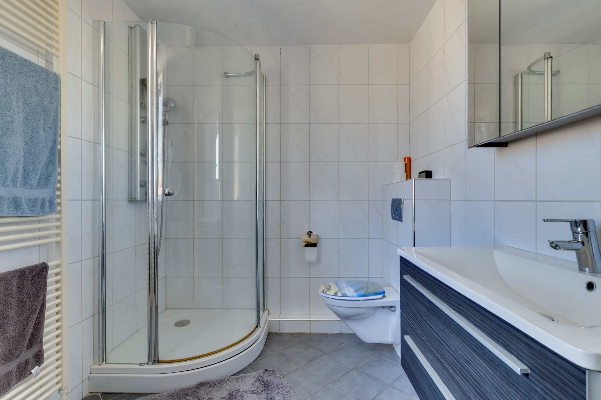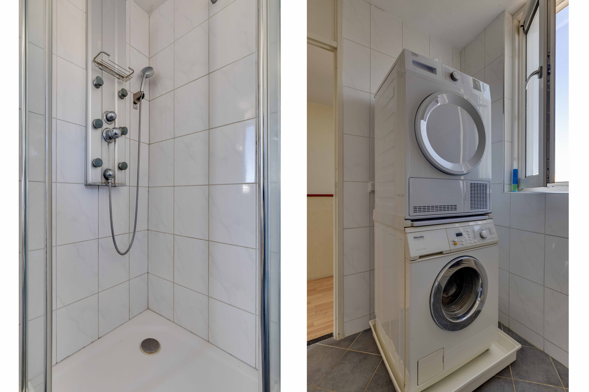 Overloop, Geheel betegelde ruime badkamer v.v. 2e toilet, badkamermeubel, douchecabine, designradiator en aansluitpunten voor wasmachine en droger.