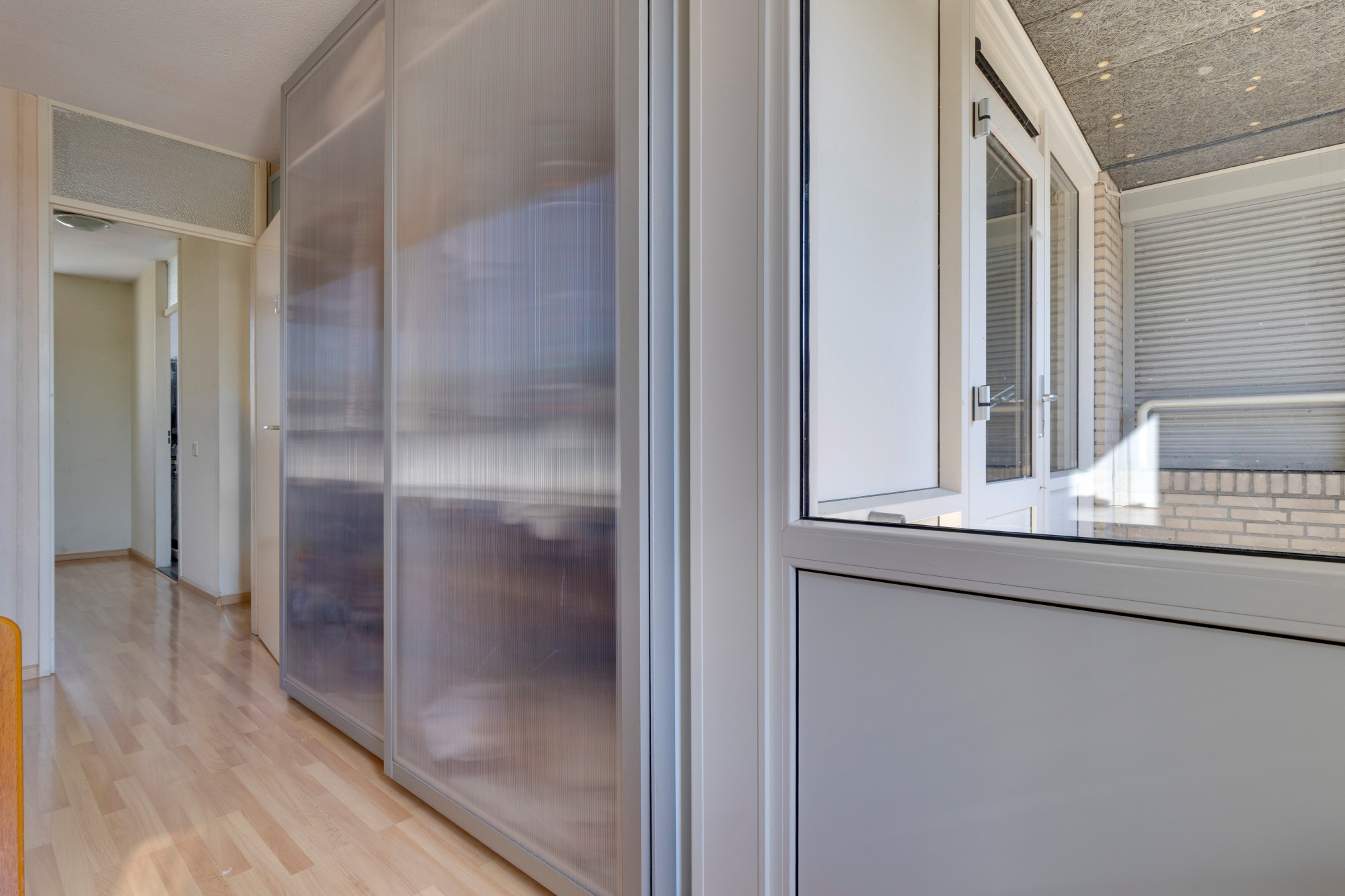 1 slaapkamer v.v. laminaatvloer, rolluik en toegang naar het balkon.