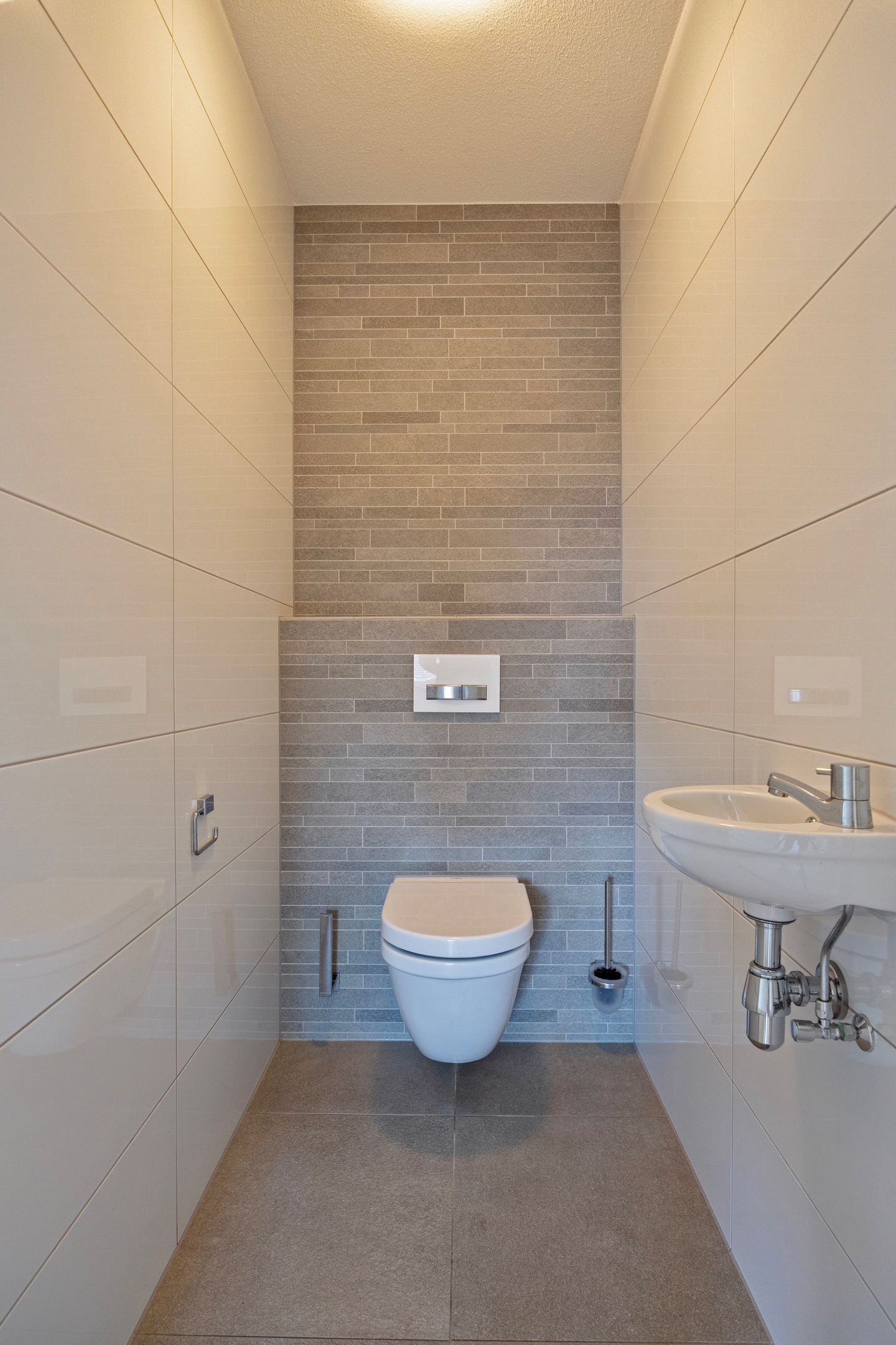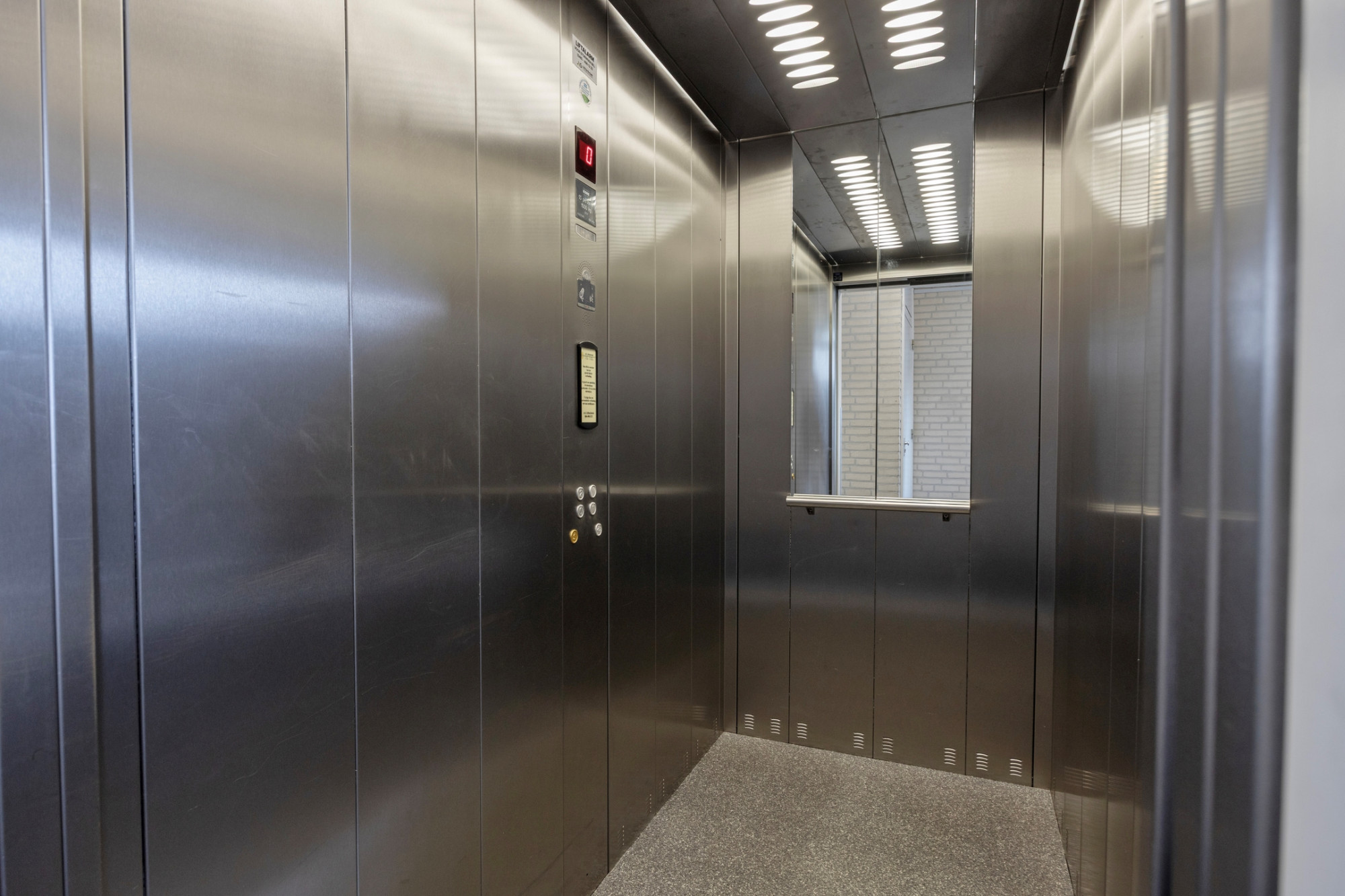 Overdekte entree met brievenbussen en bellenplateau. Ruime hal met centrale berging. Moderne liftinstallatie en trappenhuis. Toegangsdeur naar achterliggend terrein. Stenen berging met stroom-aansluiting. Garage met op afstand elektrisch bedienbare kantelpoort.