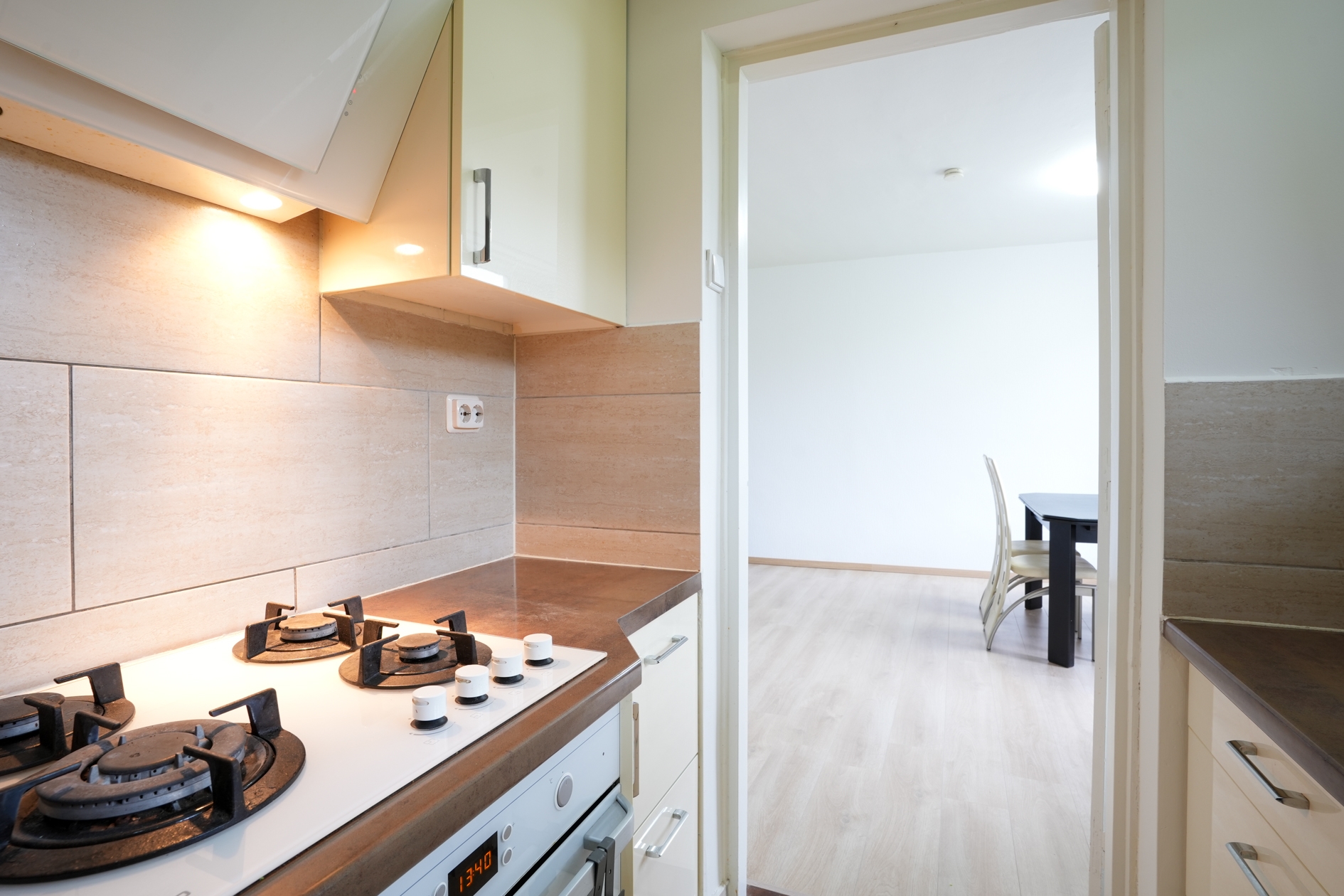 - Half open keuken met een nette keukenopstelling voorzien van oven, 4 pits gasfornuis, afzuigkap, magnetron en koel-vries combinatie, circa 3.5 m2.